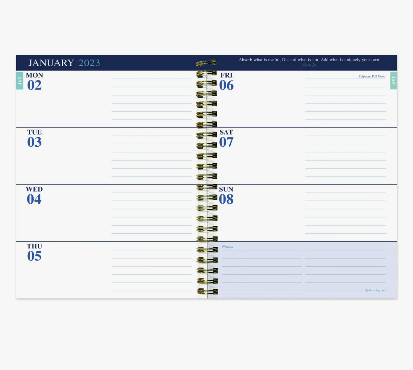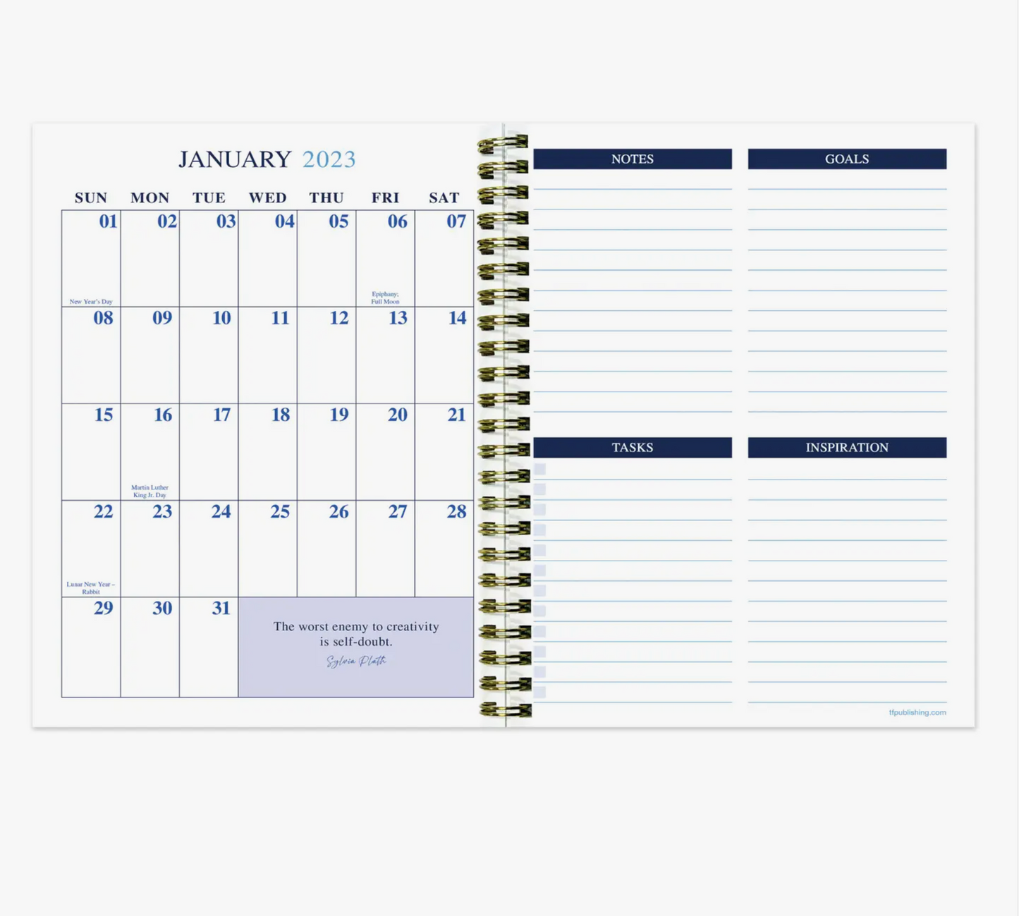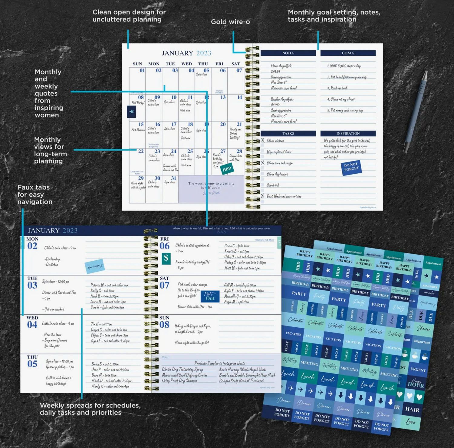 Keep it simple with our 2023 striped planner that is anything but basic! Measuring 6.5" (w) x 8" (h), this all-encompassing medium planner, boasts monthly, 2-page spreads that include lined sections for notes, tasks, and goals and weekly, 2-page spreads with lined daily sections to keep plans neat and organized, plus a dedicated weekly priorities section to help keep you focused. The interior pages are designed with a traditional and casual feel, accented with faux monthly tabs for easy access to weekly planning. Enhance your daily plans with 216 color coordinating stickers to highlight special occasions and personalize your planner. Bonus lined notes pages are in the back with yearly 2023 and 2024 views in the front. Featuring a durable, textured cover and sophisticated gold wire-o binding designed to lay flat when open, this 12-month planner covers January 2023 – December 2023 and contains no plastic; Goods Without Guilt!