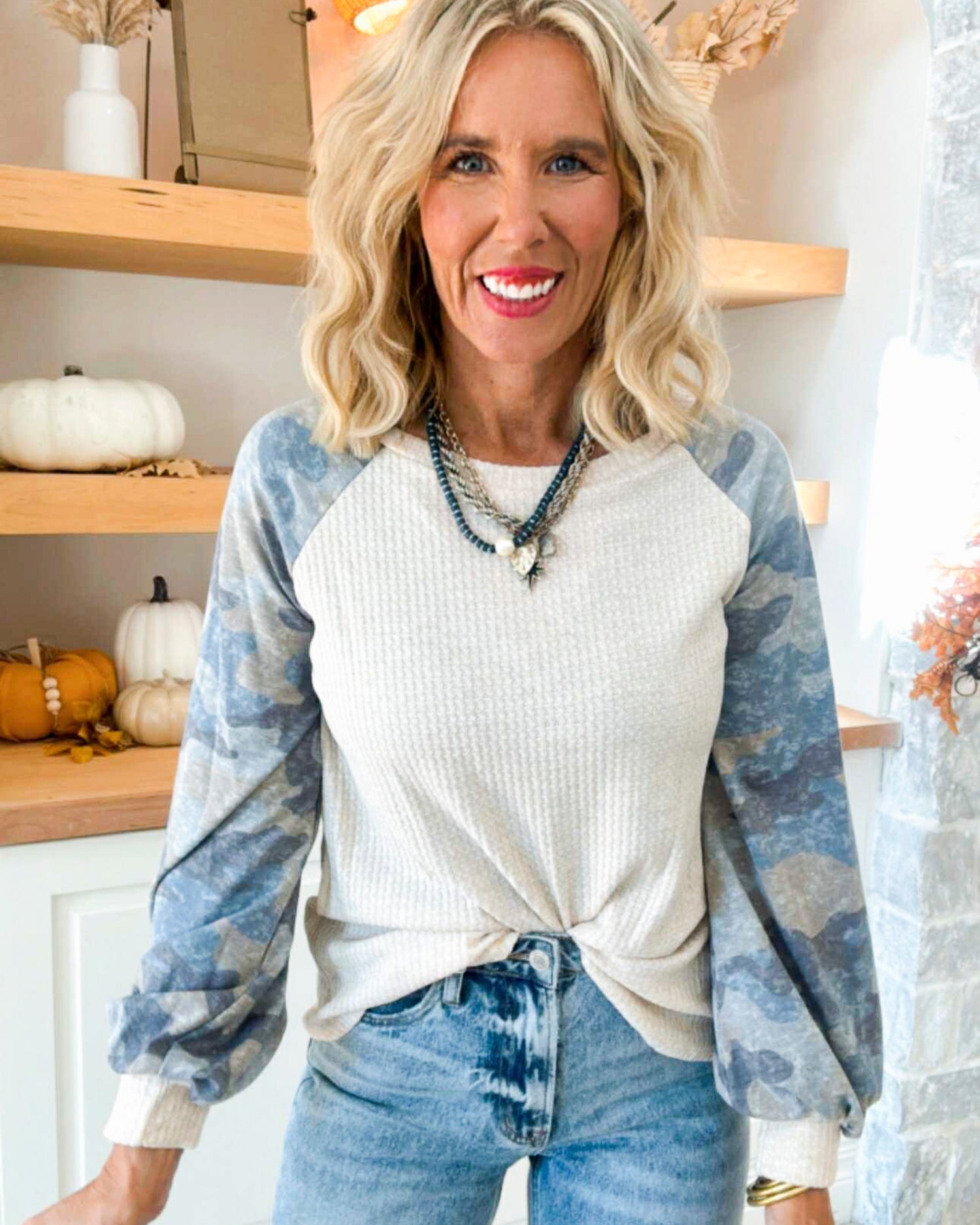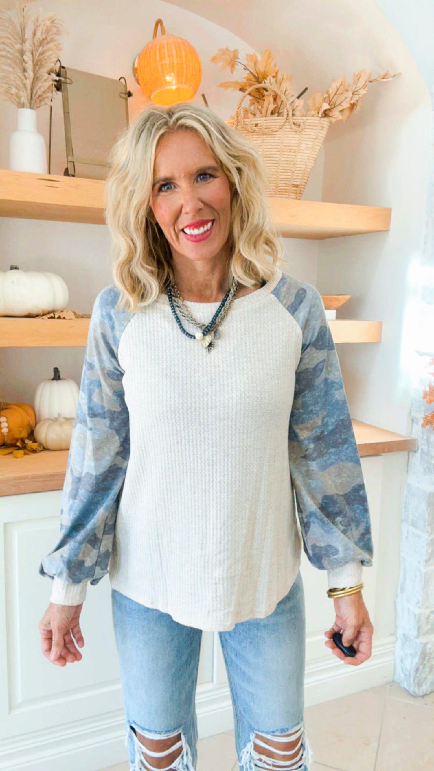Style: Waffle Knit Top with Camo Sleeves
