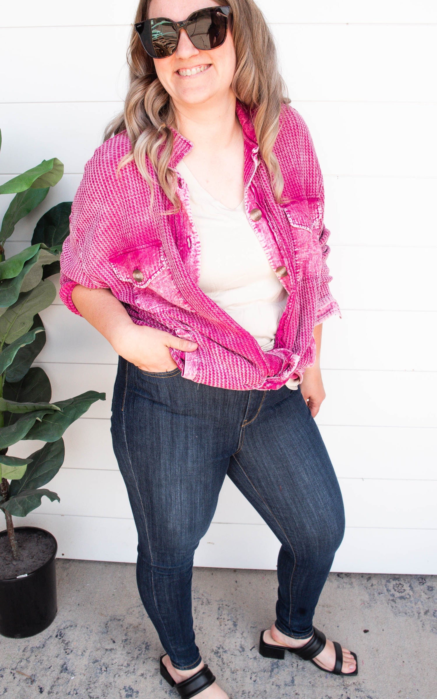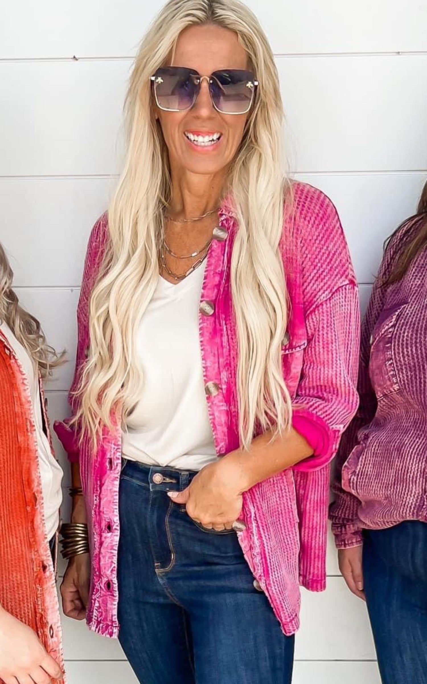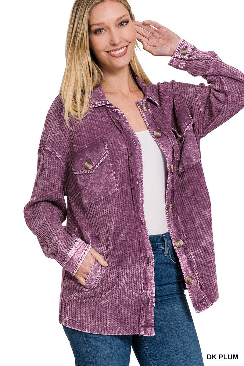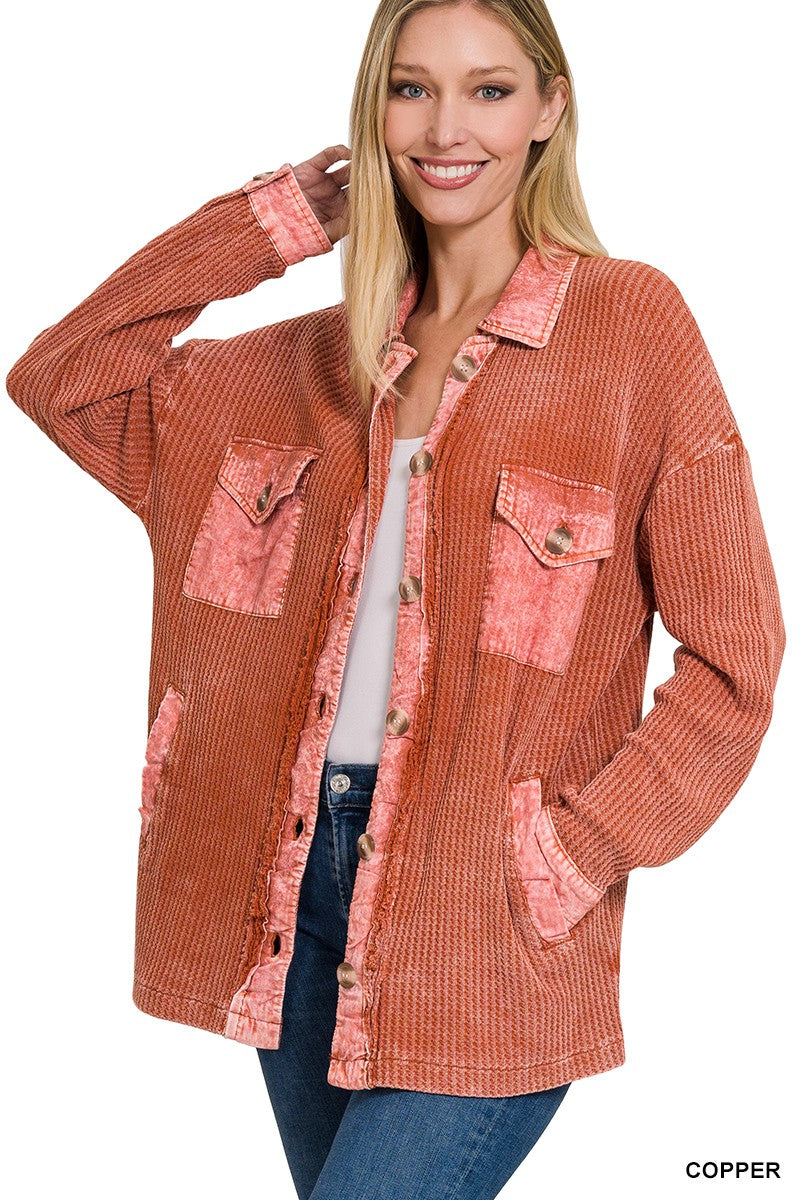 The Acid Wash Summer Soft Waffle Shacket is a perfect layering piece for cooler summer days. Crafted from a lightweight blend of cotton and polyester, the shacket features a stylish acid wash for a unique look. A versatile, easy-to-wear style, the shacket will be a go-to addition to your wardrobe.