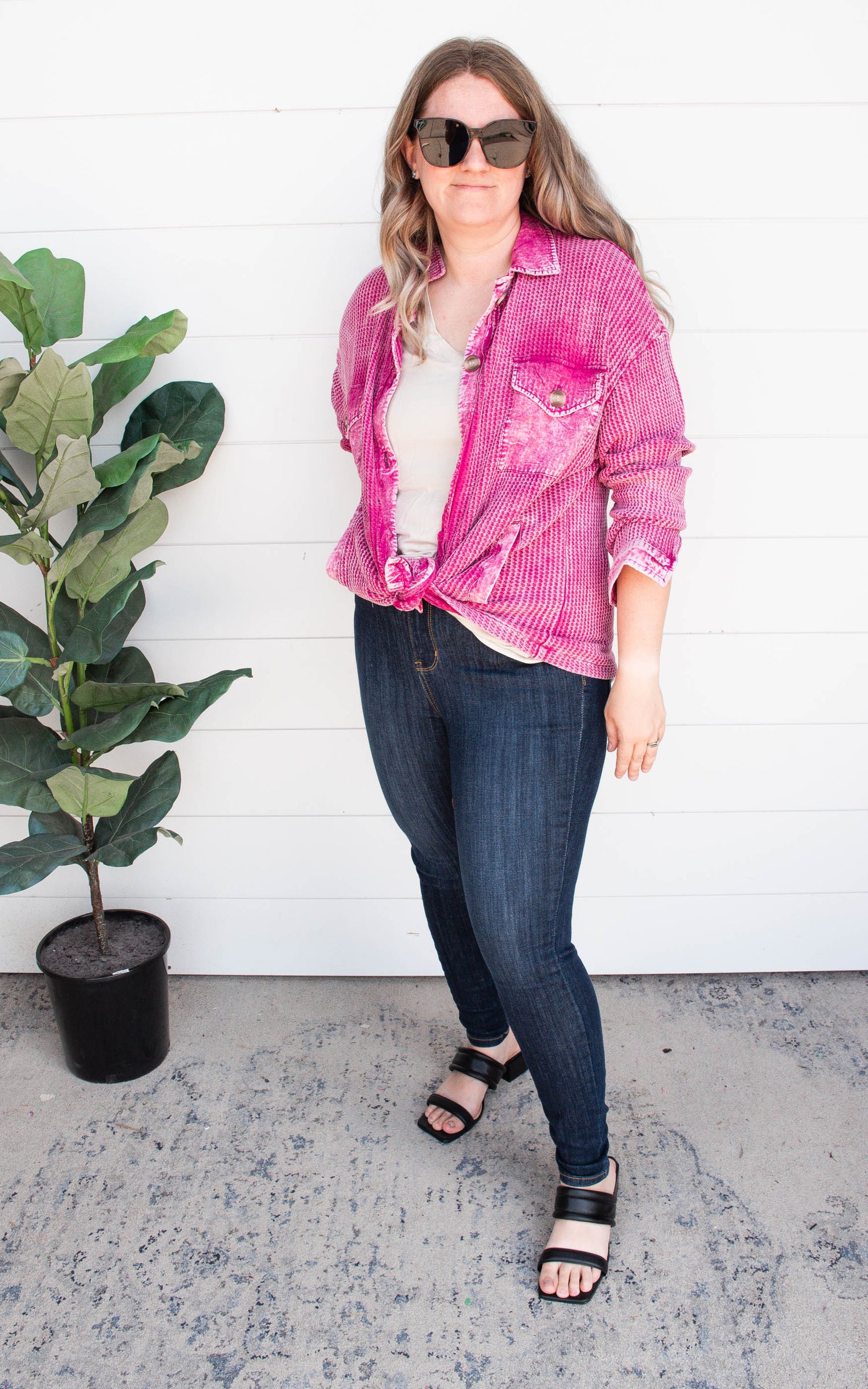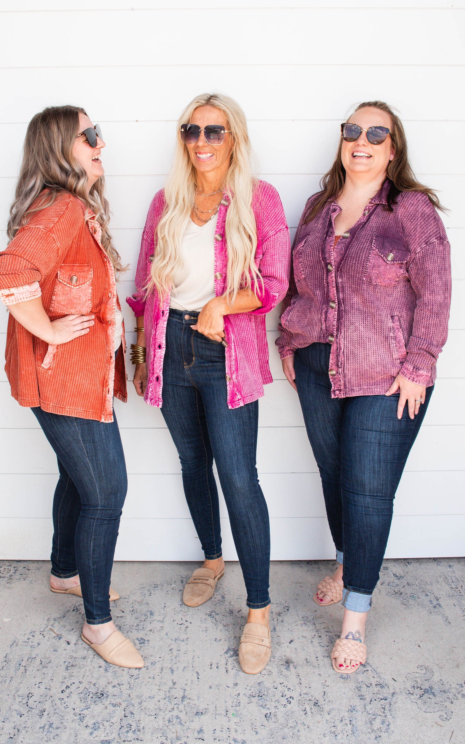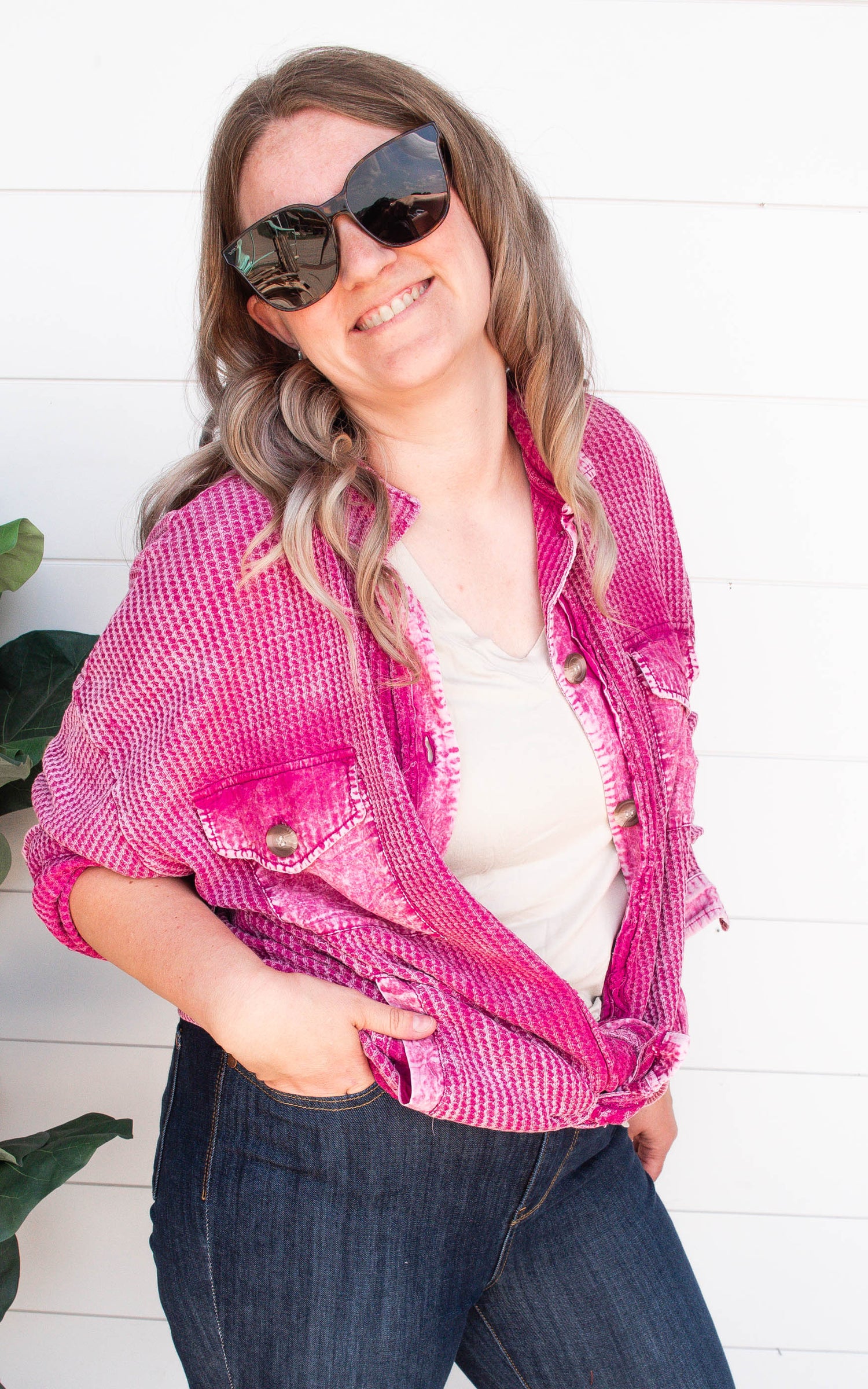 The Acid Wash Summer Soft Waffle Shacket is a perfect layering piece for cooler summer days. Crafted from a lightweight blend of cotton and polyester, the shacket features a stylish acid wash for a unique look. A versatile, easy-to-wear style, the shacket will be a go-to addition to your wardrobe.