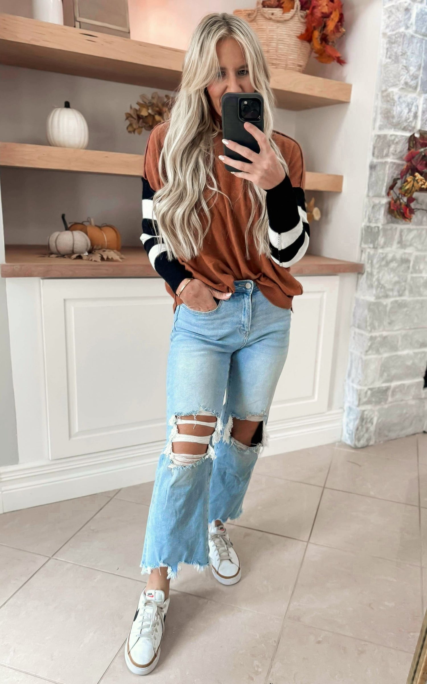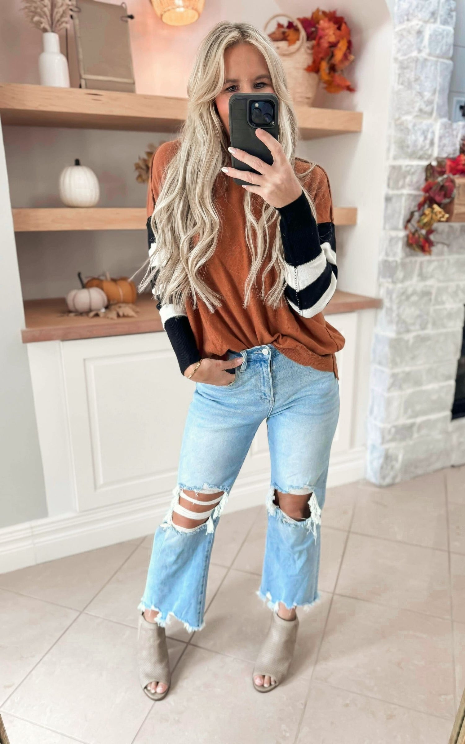 Elevate your style with our August Mornings Stripe Sleeve Mock Neck Sweater Top! This top features a sleek mock neck design and bold striped sleeves, perfect for adding a pop of color to your wardrobe. Soft, comfortable fabric provides all-day comfort. Stay fashion-forward and cozy in this versatile top!