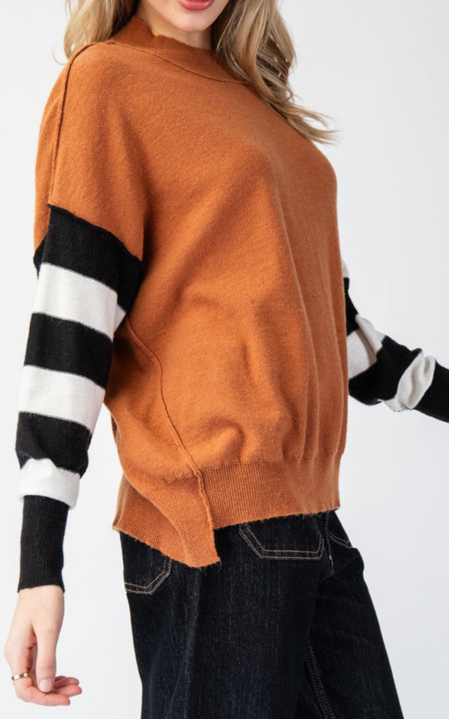 August Mornings Stripe Sleeve Mock Neck Sweater Top