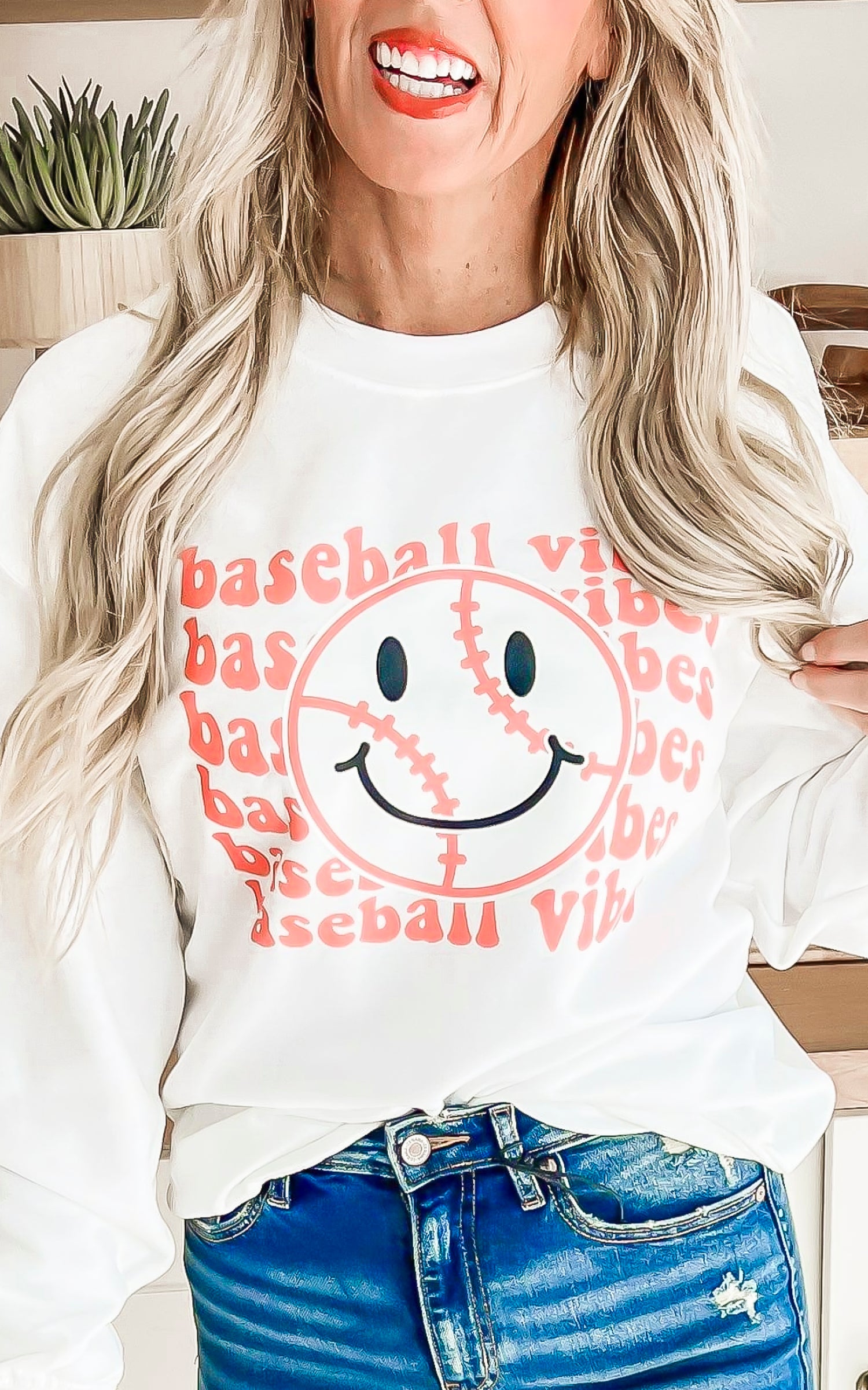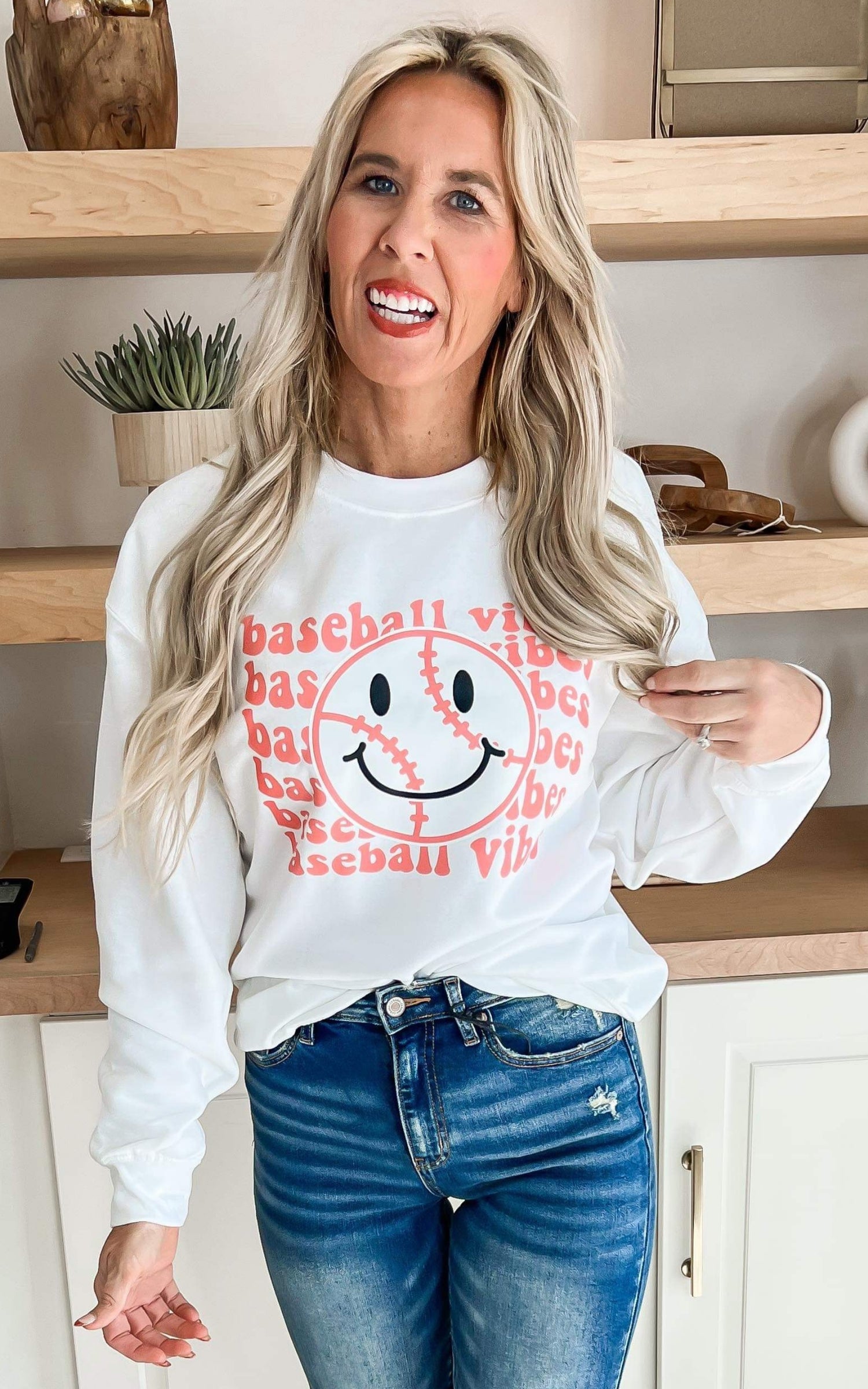 Get in touch with your inner baseball fanatic with our Baseball Vibes White Graphic Crewneck Sweatshirt! Made with soft material, this sweatshirt will keep you warm and stylish. Embrace the sporty vibes and show off your love for baseball in a unique and playful way. Batter up!