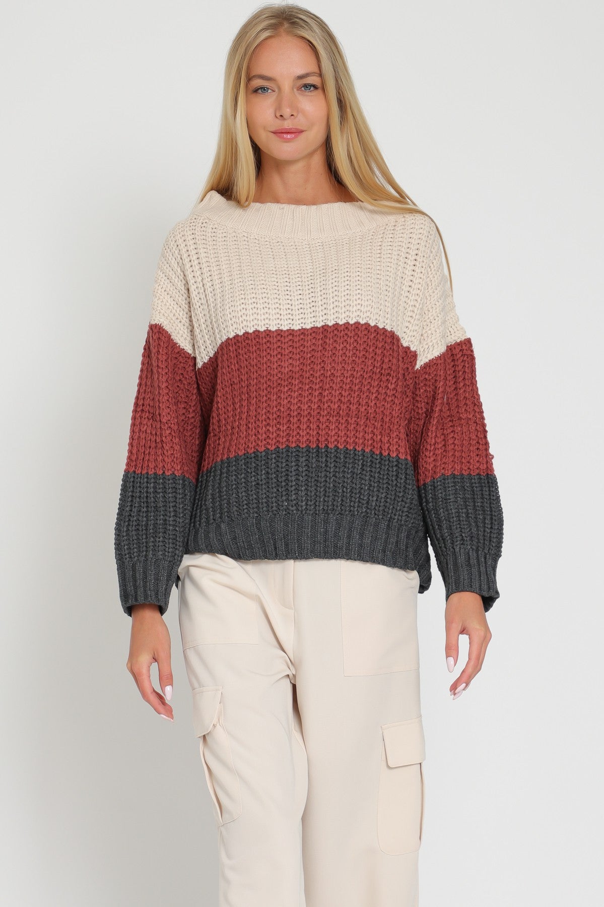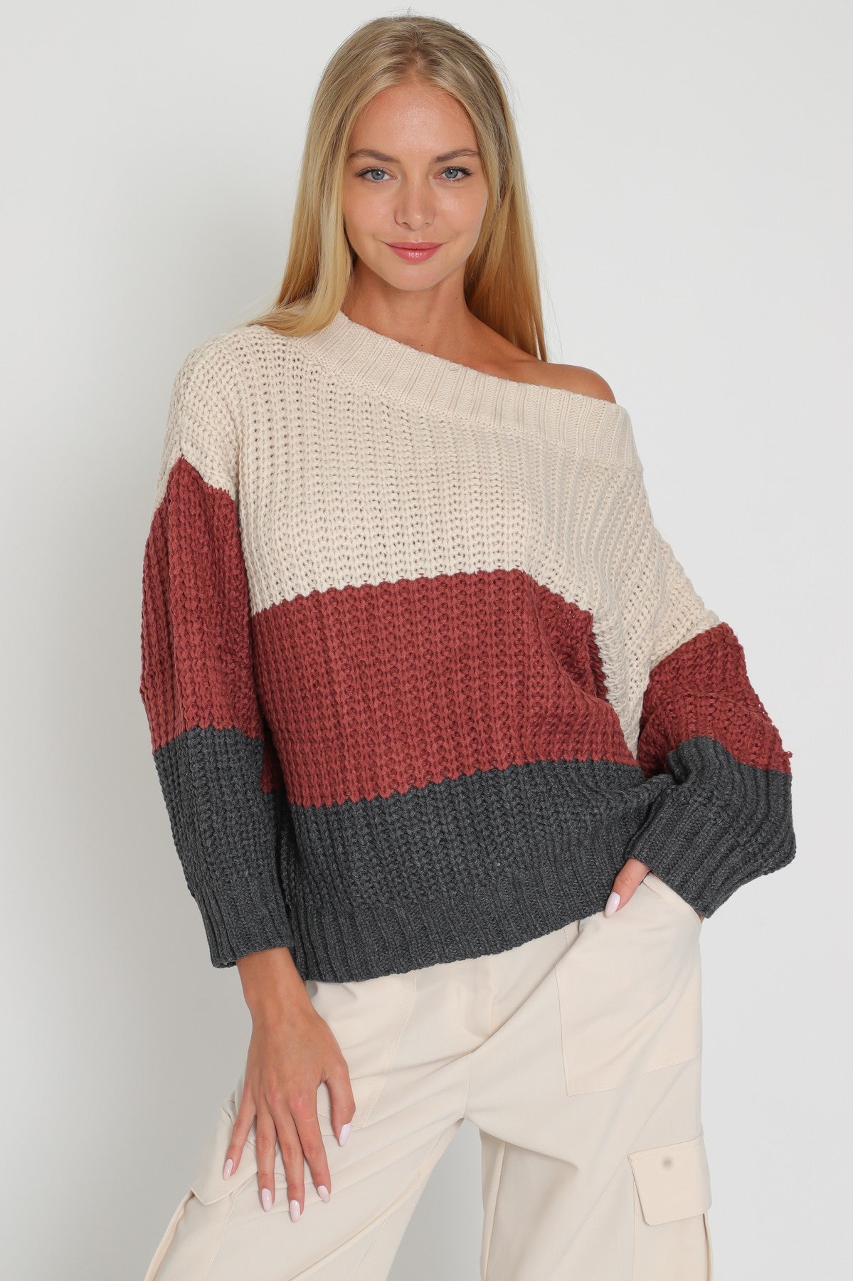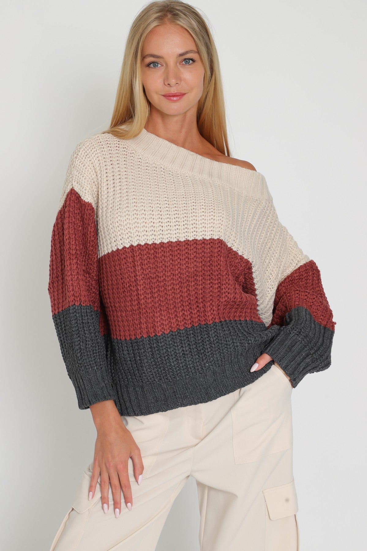 Elevate your style with our Beige/Red Bean Color Block Off Shoulder Sweater Top! This trendy top features a beautiful color block design and an off-shoulder neckline for a chic and effortless look. Made with high-quality material, it offers comfort and style in one. Perfect for any occasion, you'll surely stand out and make a statement wherever you go!