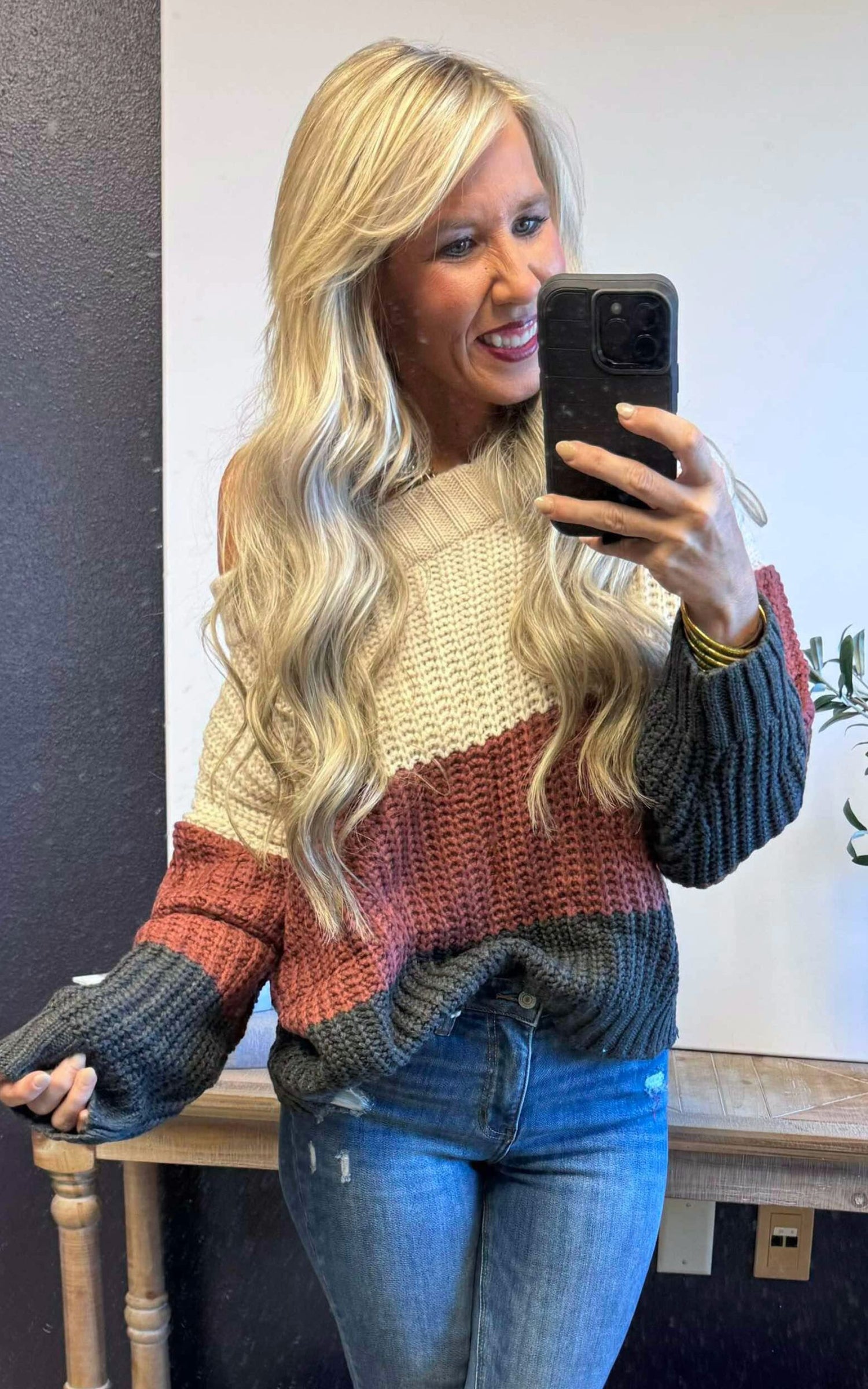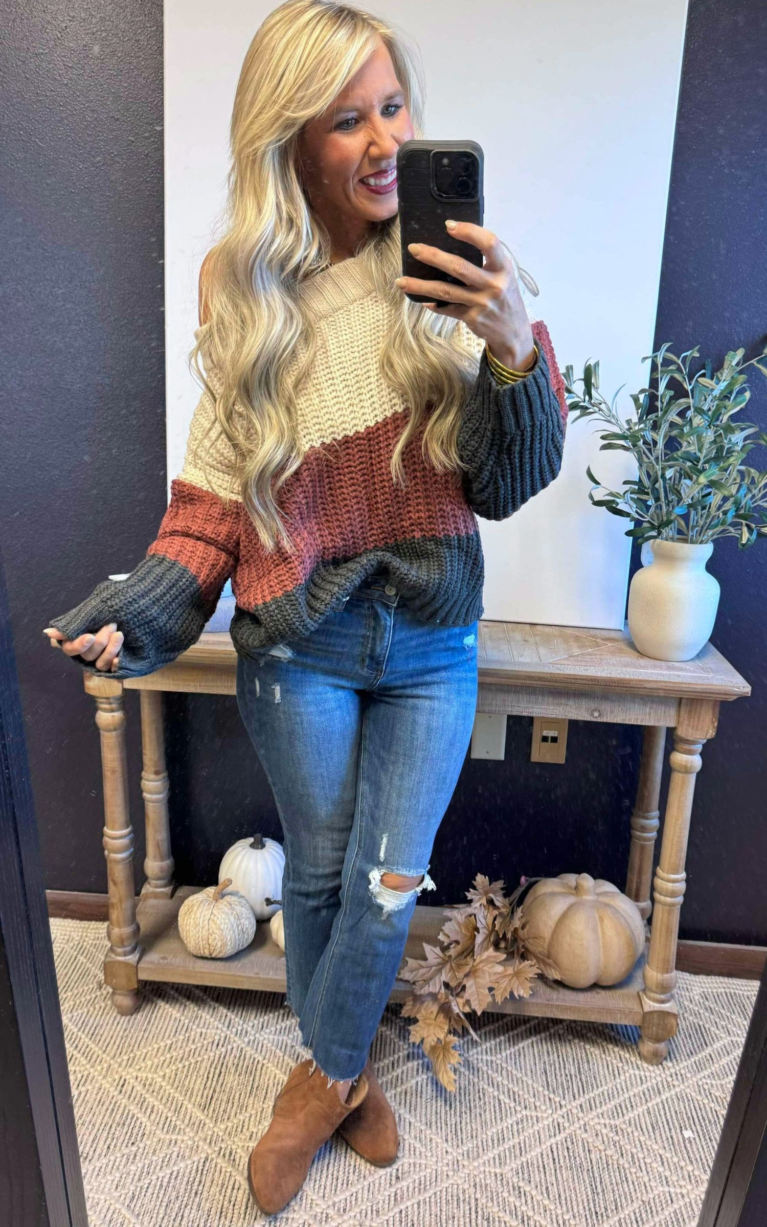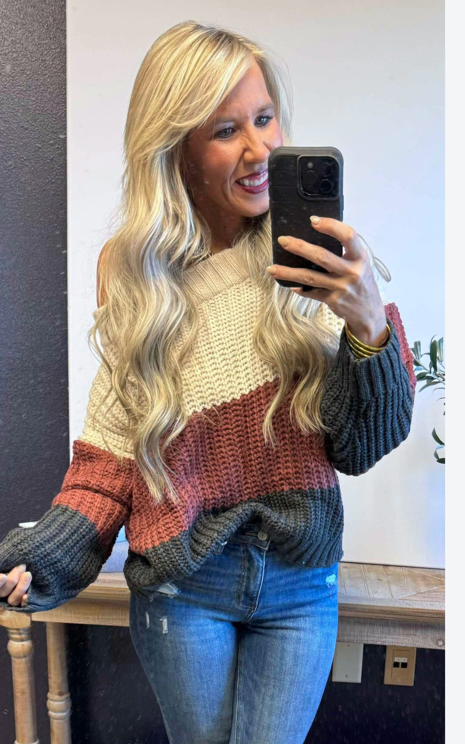 Elevate your style with our Beige/Red Bean Color Block Off Shoulder Sweater Top! This trendy top features a beautiful color block design and an off-shoulder neckline for a chic and effortless look. Made with high-quality material, it offers comfort and style in one. Perfect for any occasion, you'll surely stand out and make a statement wherever you go!