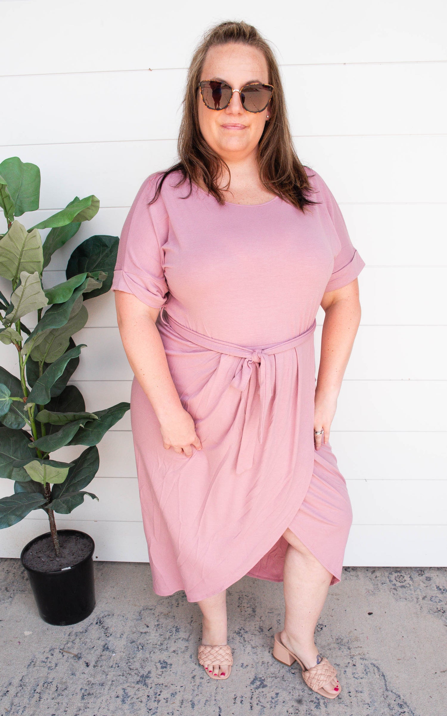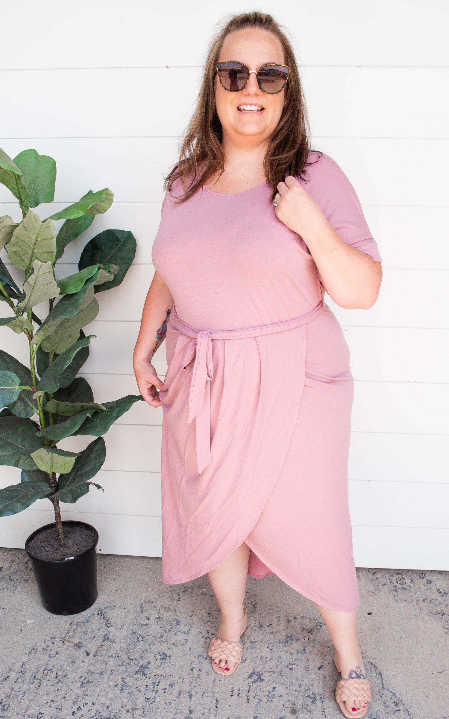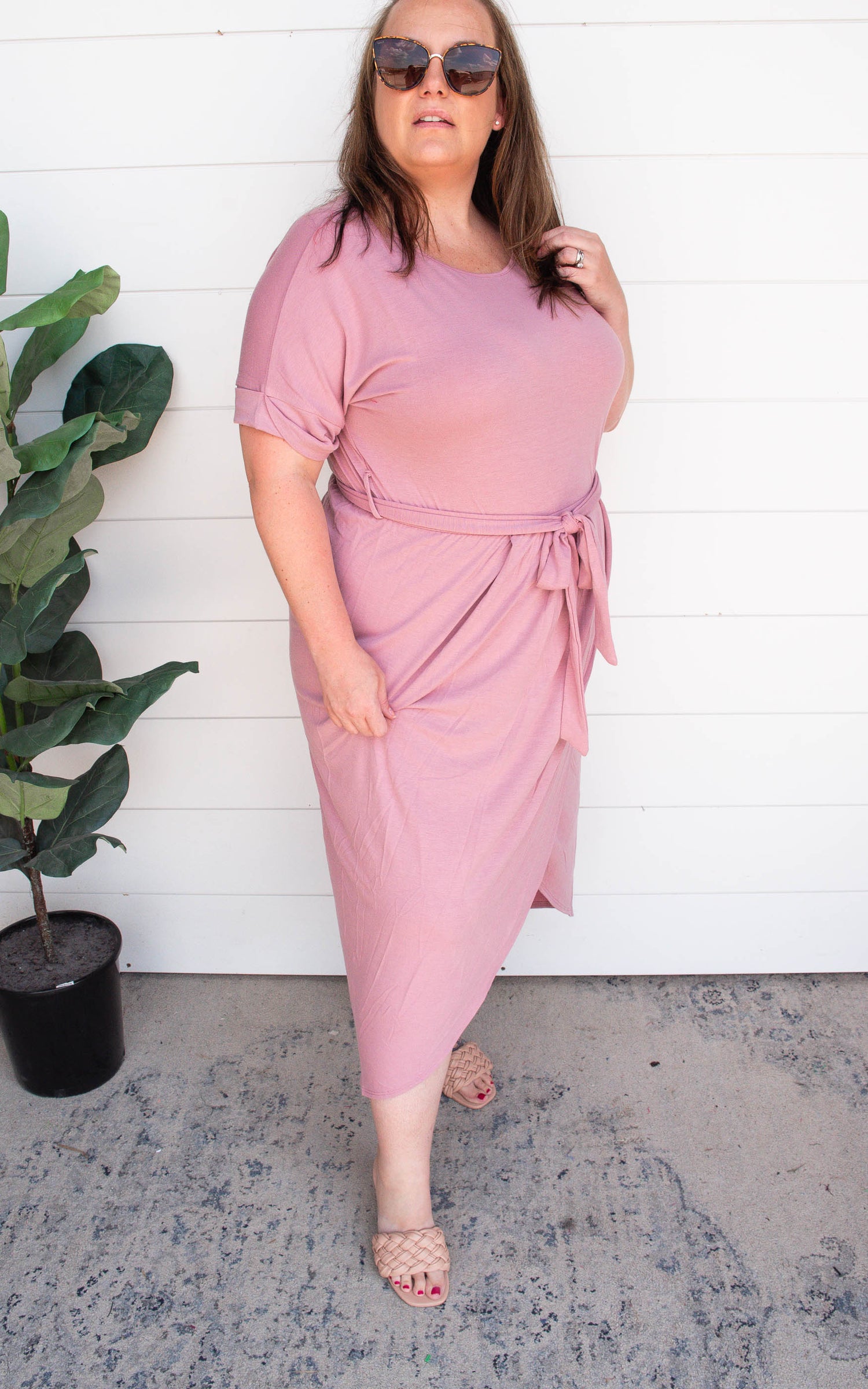 A tulip silhouette is given a chic update in this short sleeve cotton dress with a flattering V-neck and belt.
