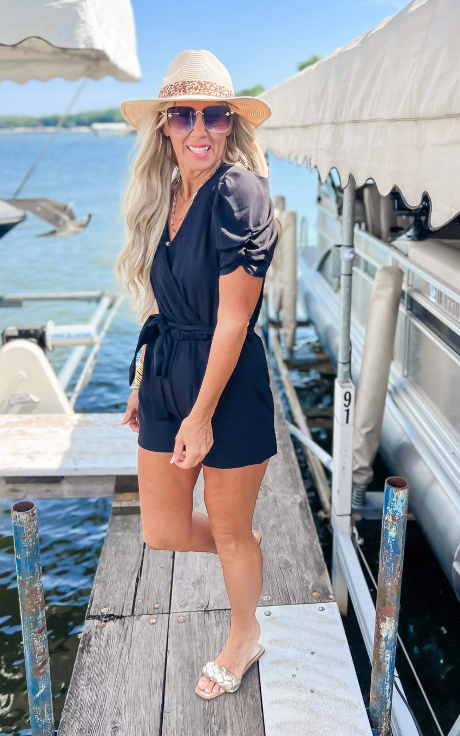 Need an easy to wear romper that is both chic and timeless? Look no further because this adorable piece, complete with a ruched sleeve, v neckline and tie-belt is PERFECT. Don't forget about the hidden button underneath the neckline!