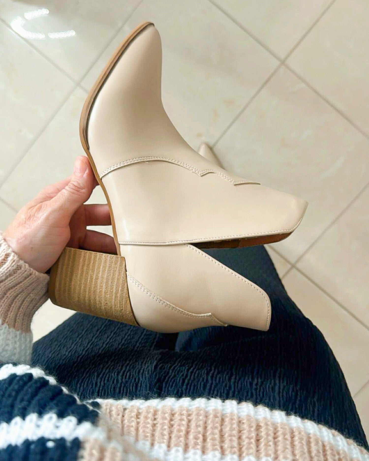 The BROOKLYN-12 ankle boot combines modern design with Western inspiration, featuring unique side cutouts and a stylish pointed toe. The stacked block heel adds stability and height, making this boot a versatile option for everyday wear or special outings.