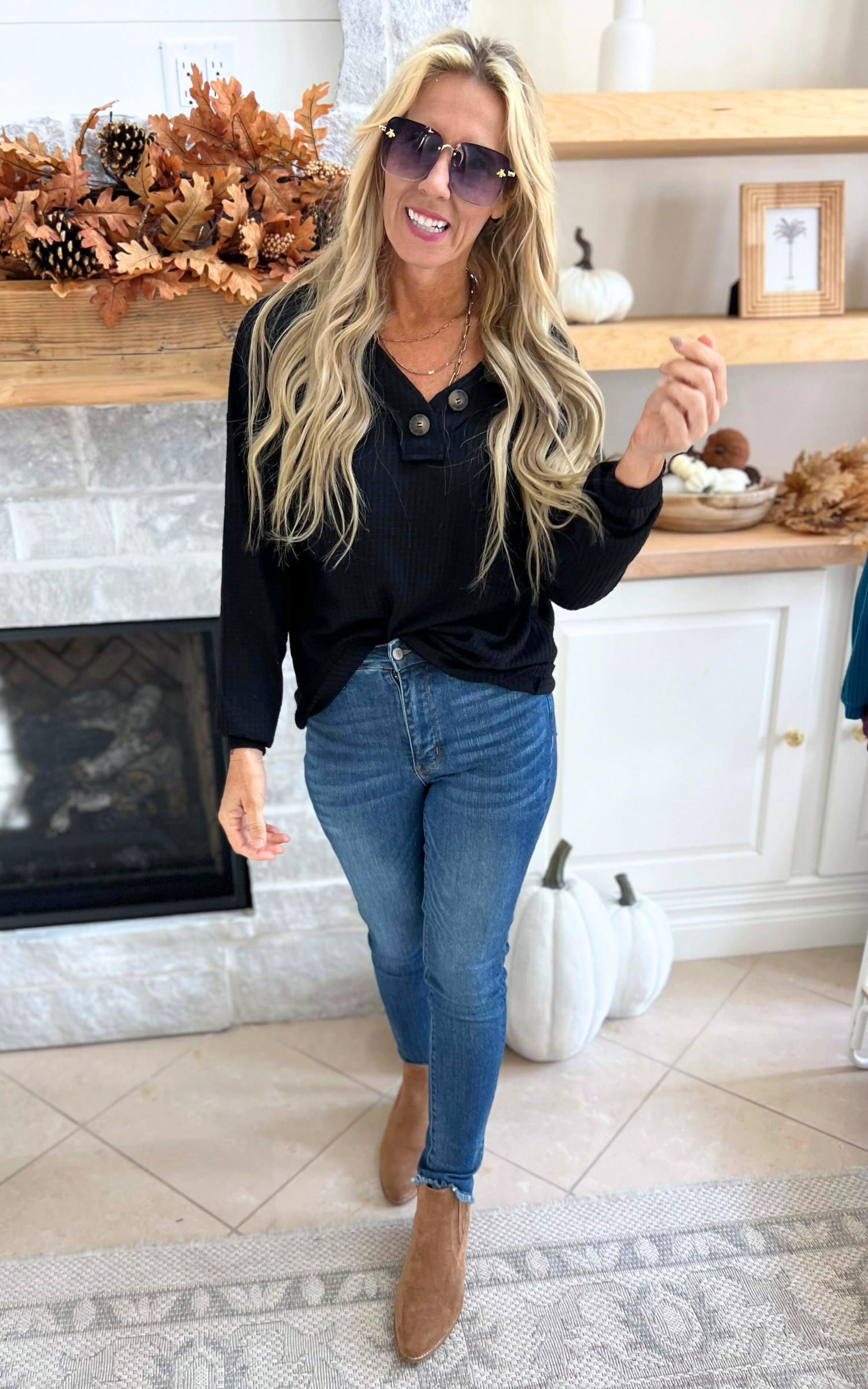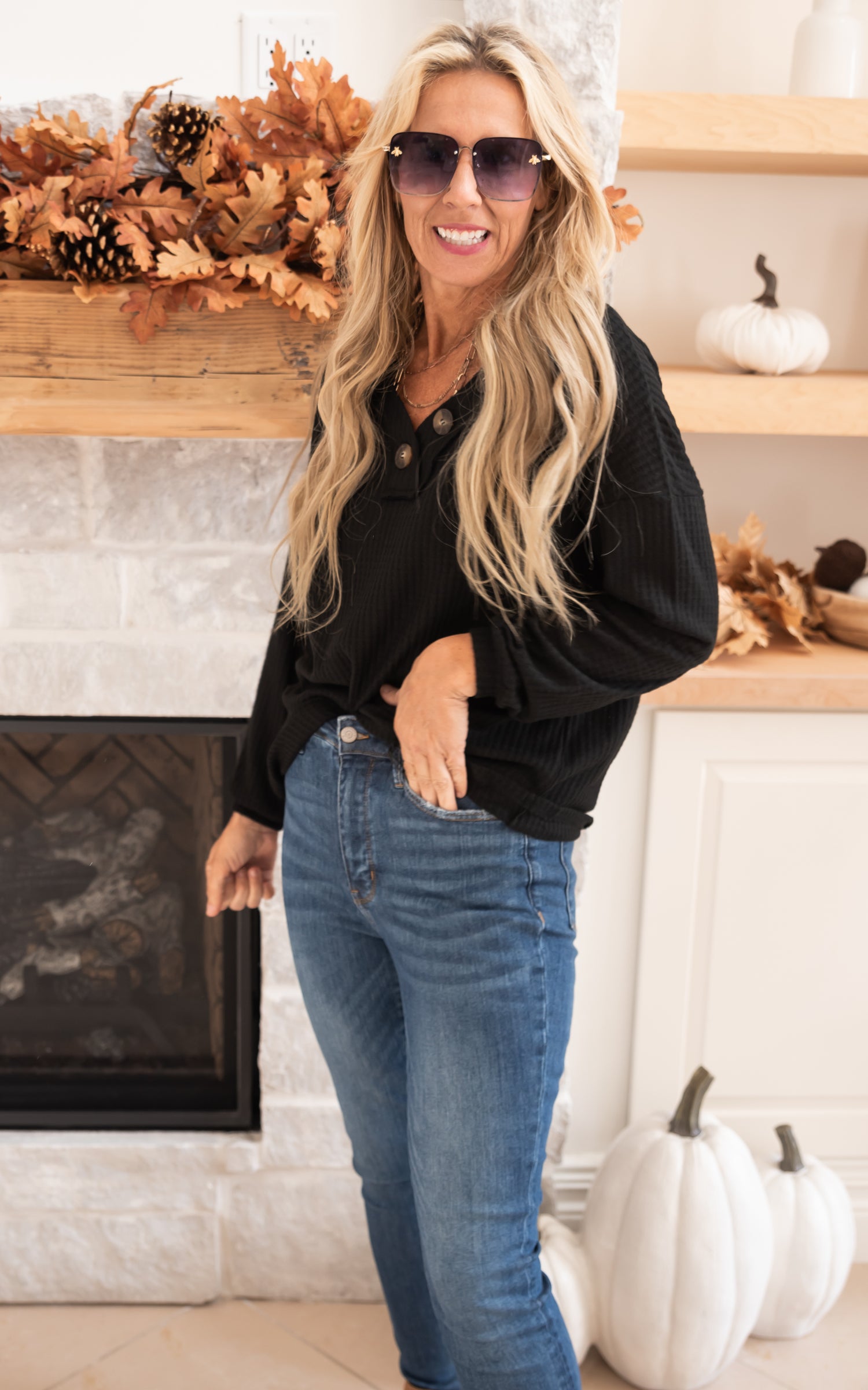 Brushed Waffle V-Neck Button Detail Sweater | Part 2 - Final Sale