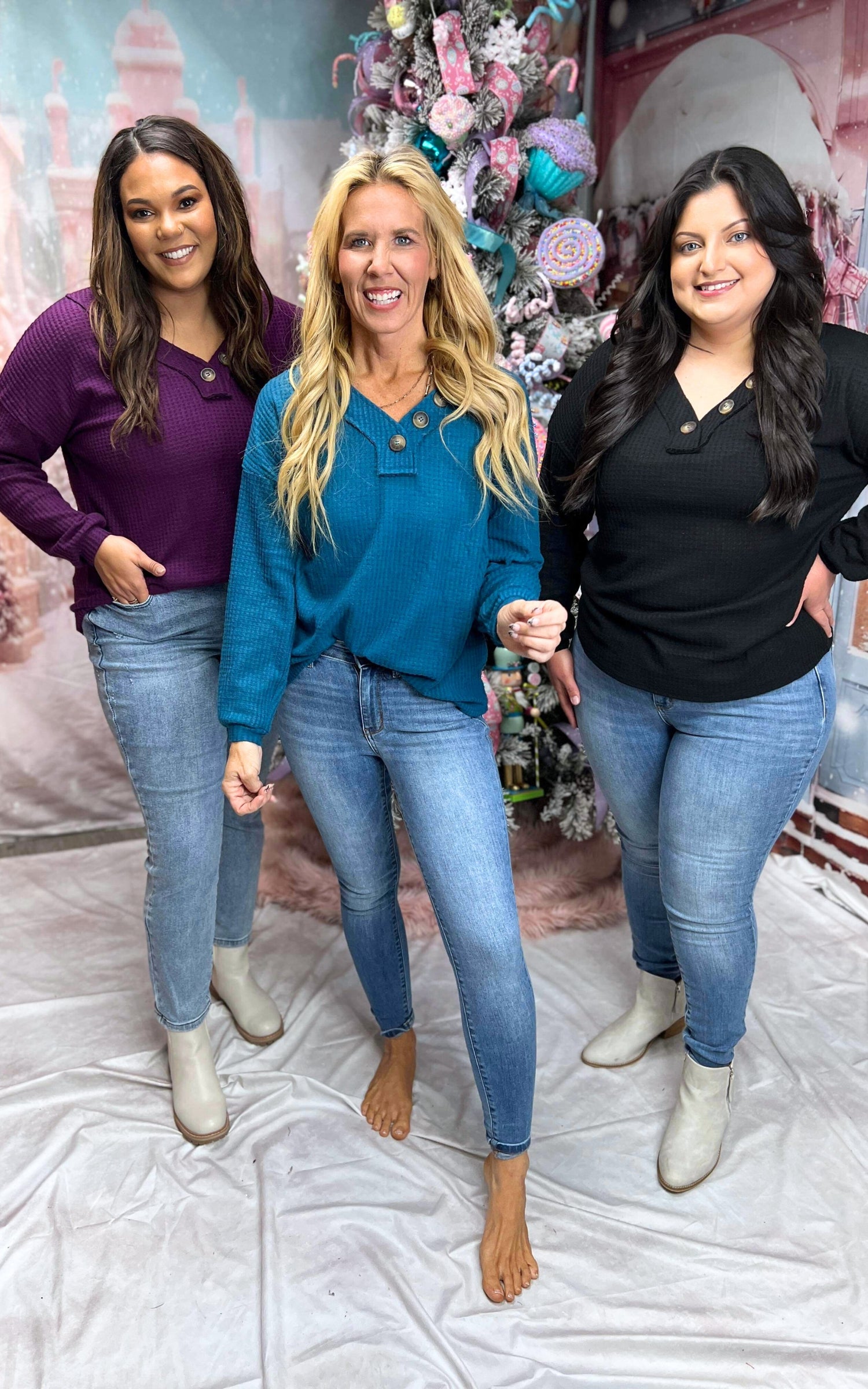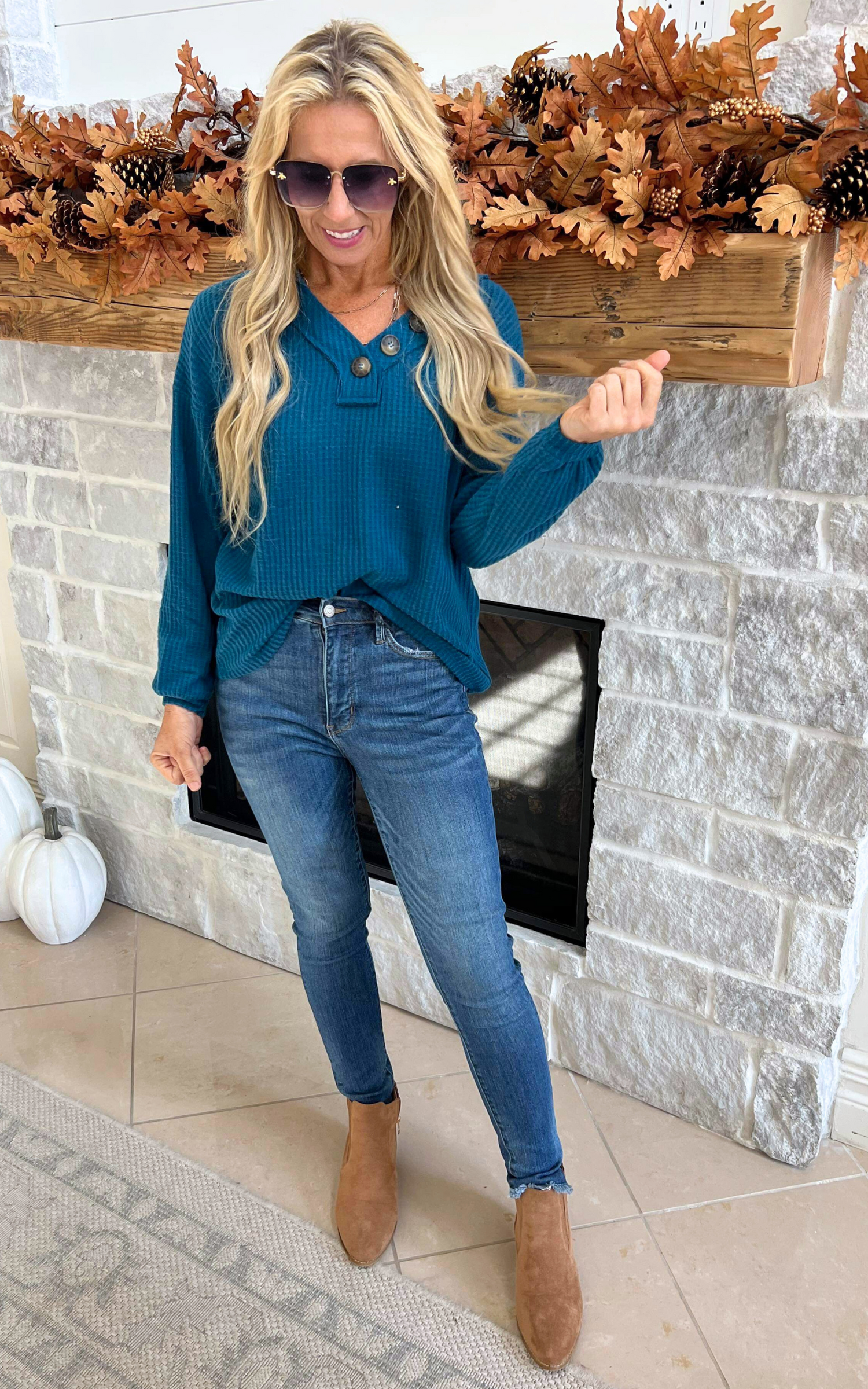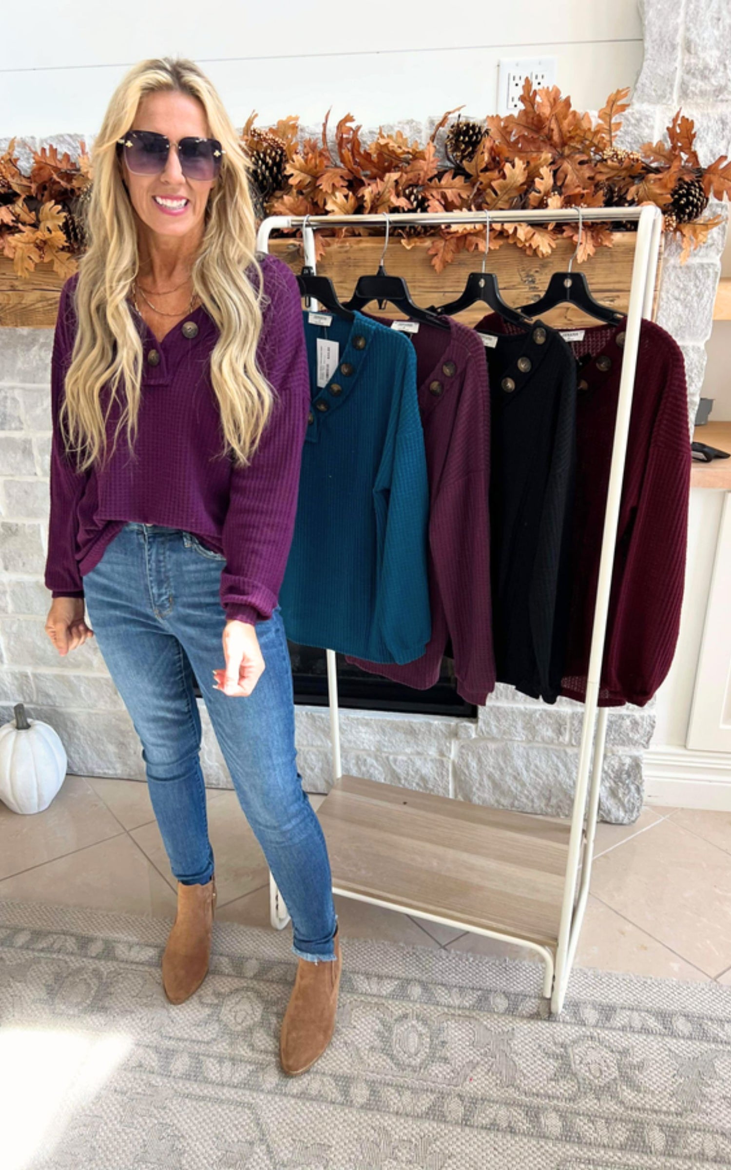 Make a statement with this Brushed Waffle V-Neck Button Detail Sweater! Super soft, with a unique look thanks to the brushed waffle pattern and stylish button accents, this piece keeps you cozy without sacrificing your sartorial savvy. So, go ahead and give 'em something to talk about!