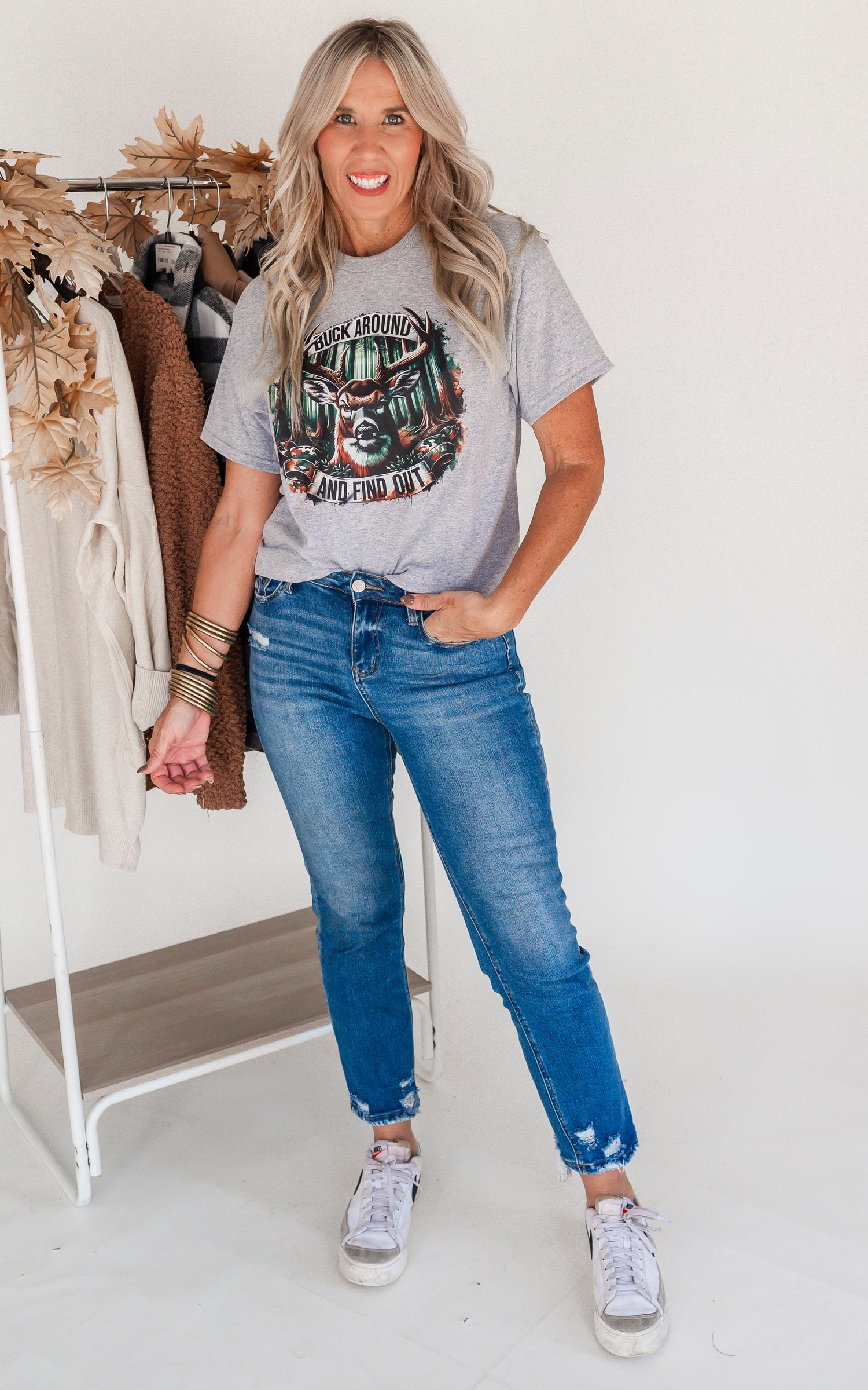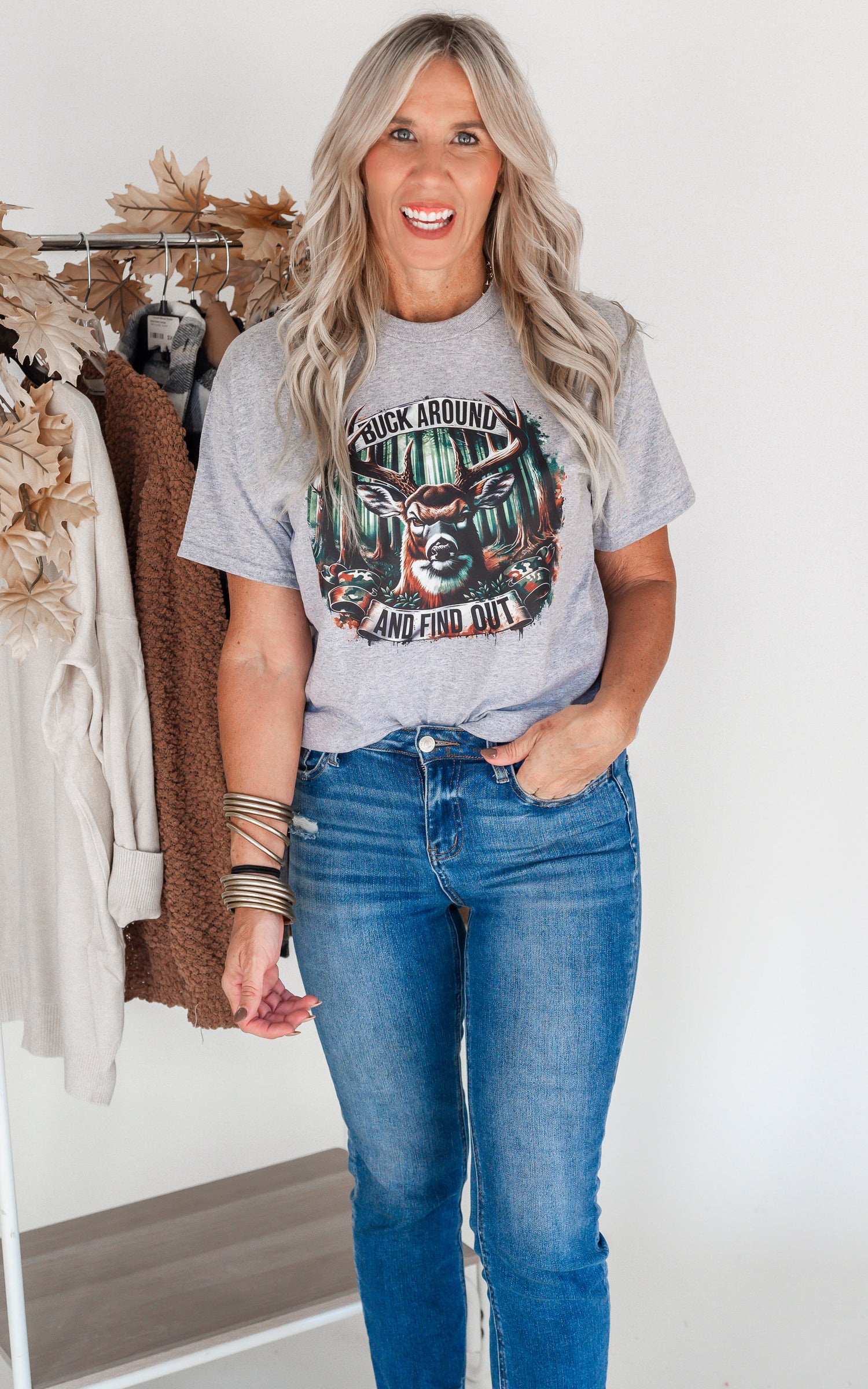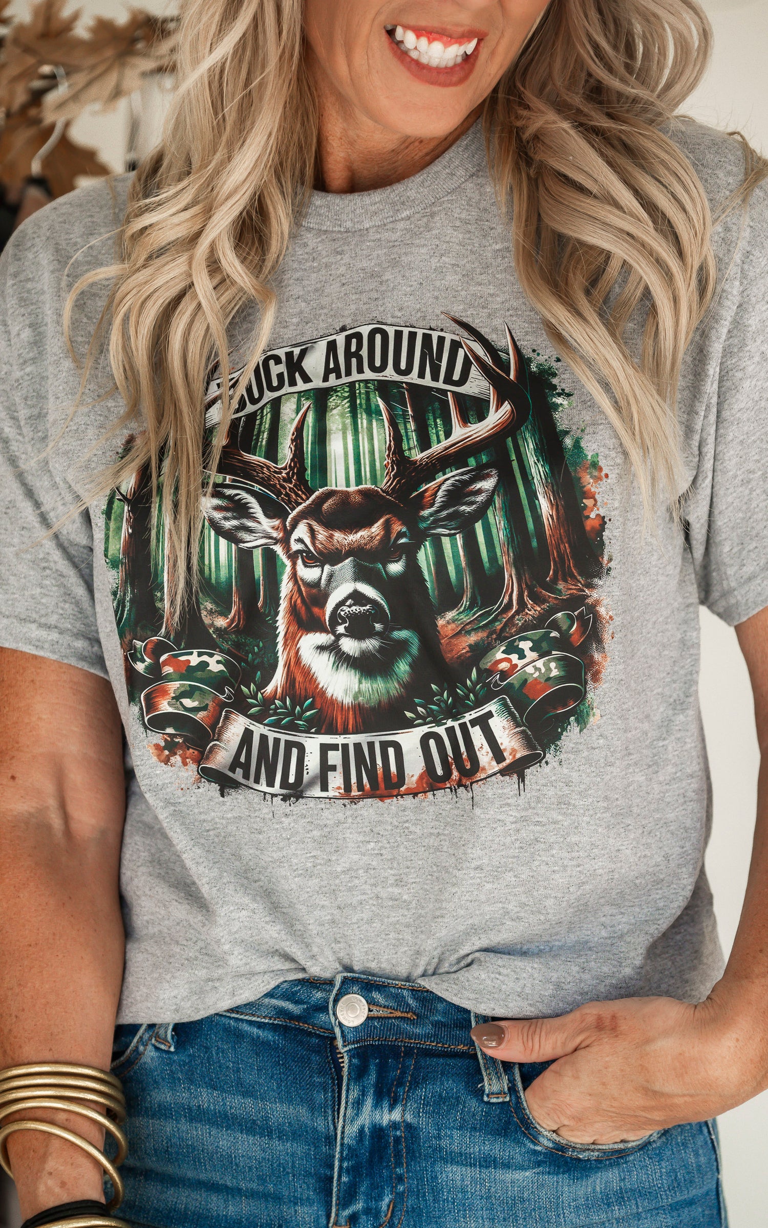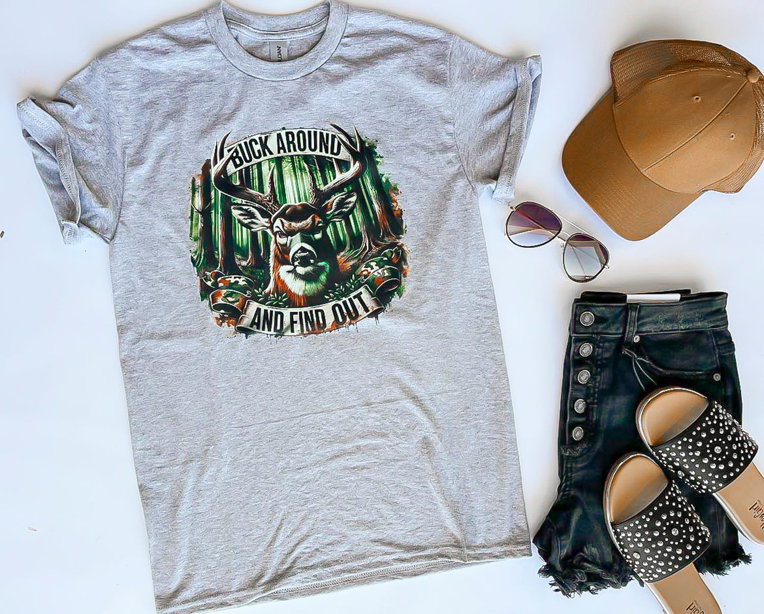 Embrace your inner hunter with this playful "Buck Around & Find Out" t-shirt. Perfect for those who don't take themselves too seriously, this shirt combines word play and humor to show off your love for the great outdoors. So go ahead, buck around and find out what adventures await you!