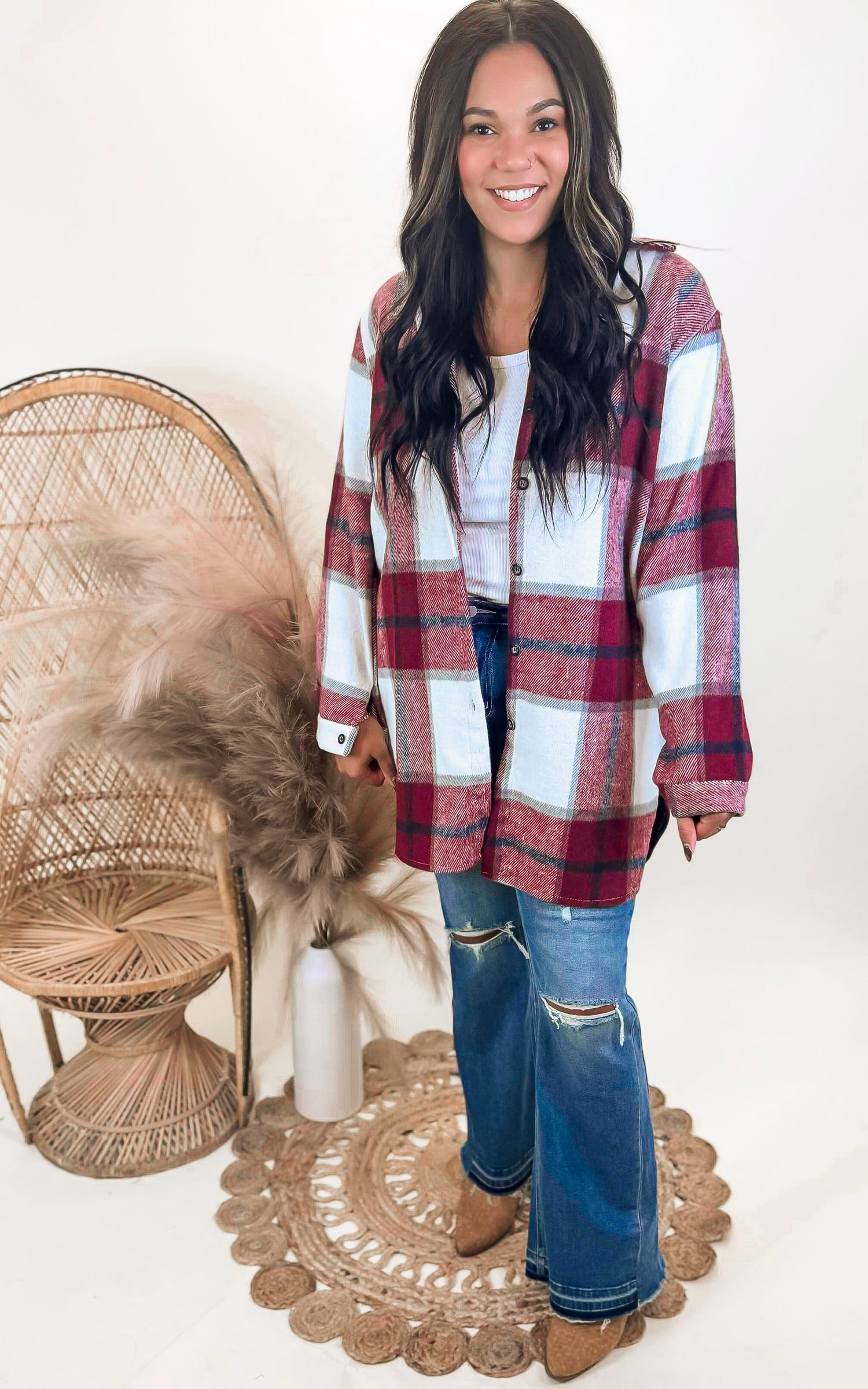 Burgundy Checked Long Plaid Shacket** - Final Sale