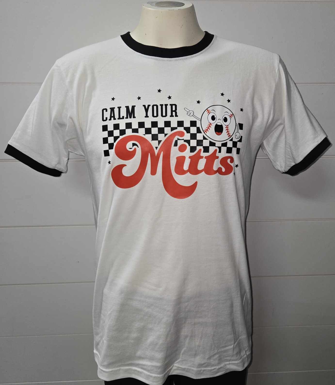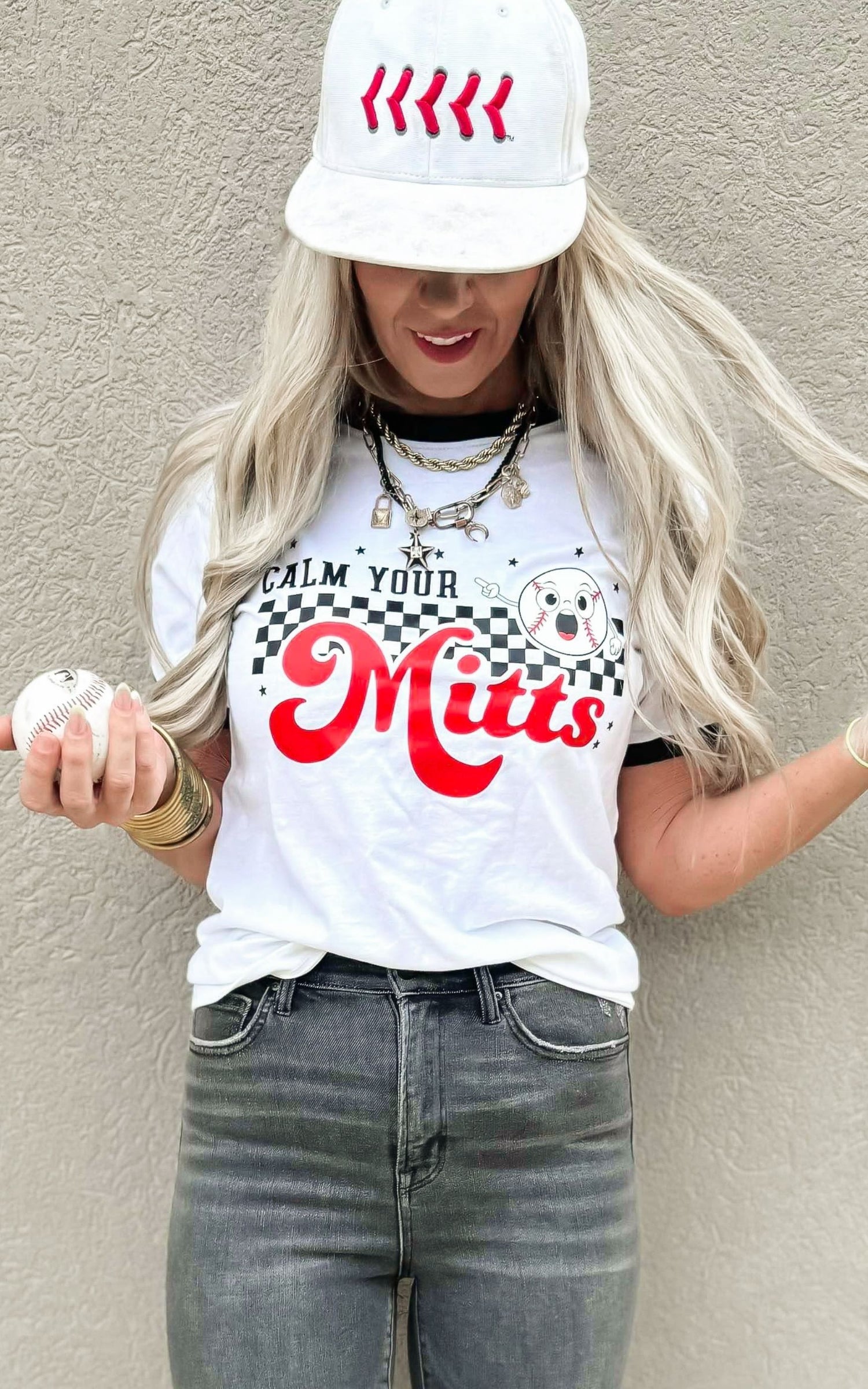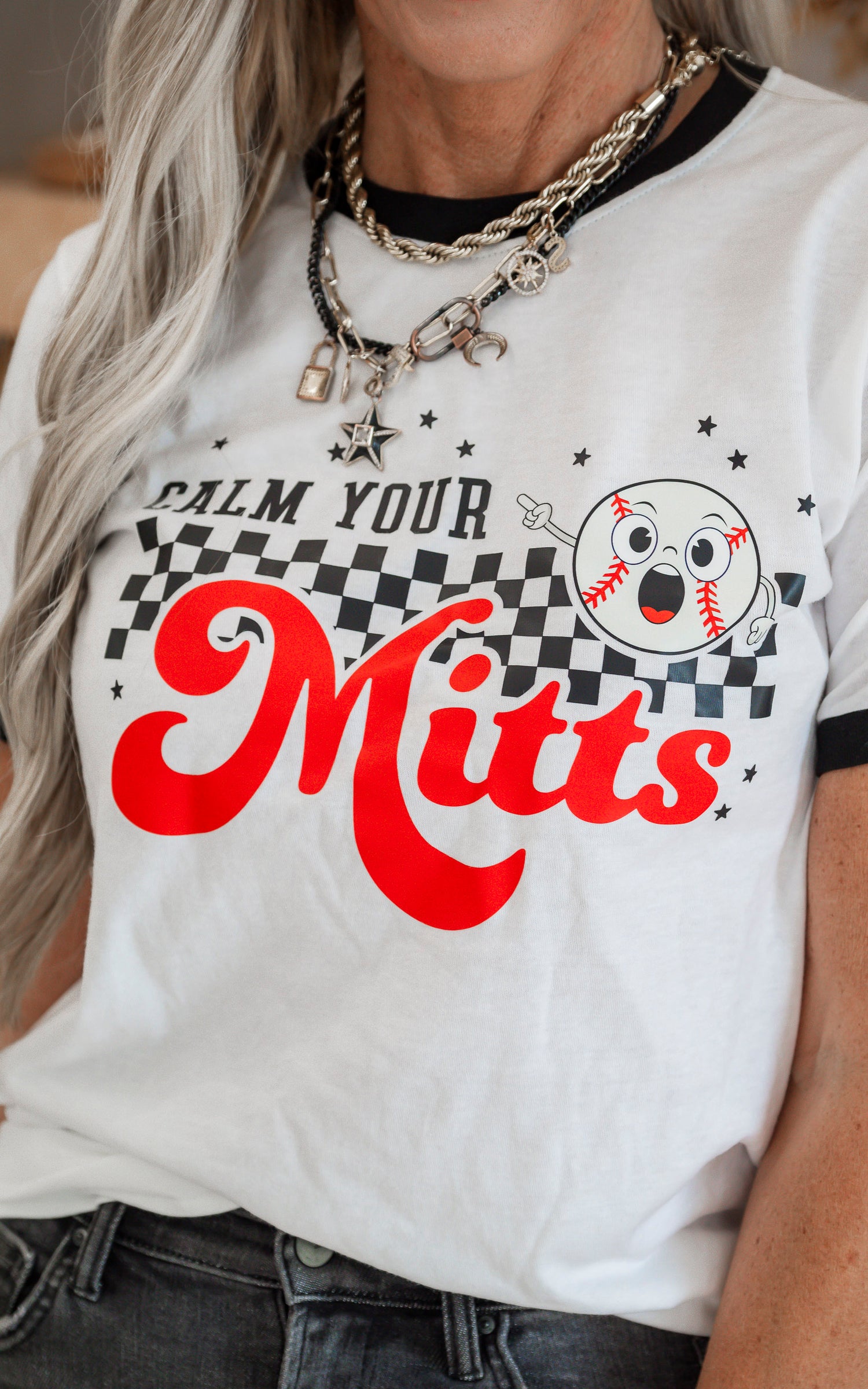 Unleash your calm and confident style with our Calm Your Mitts Ringer Graphic T-shirt! Made with quality materials, this stylish shirt features a unique graphic design that is sure to catch attention. Show off your love for keeping cool under pressure with this must-have addition to your wardrobe.