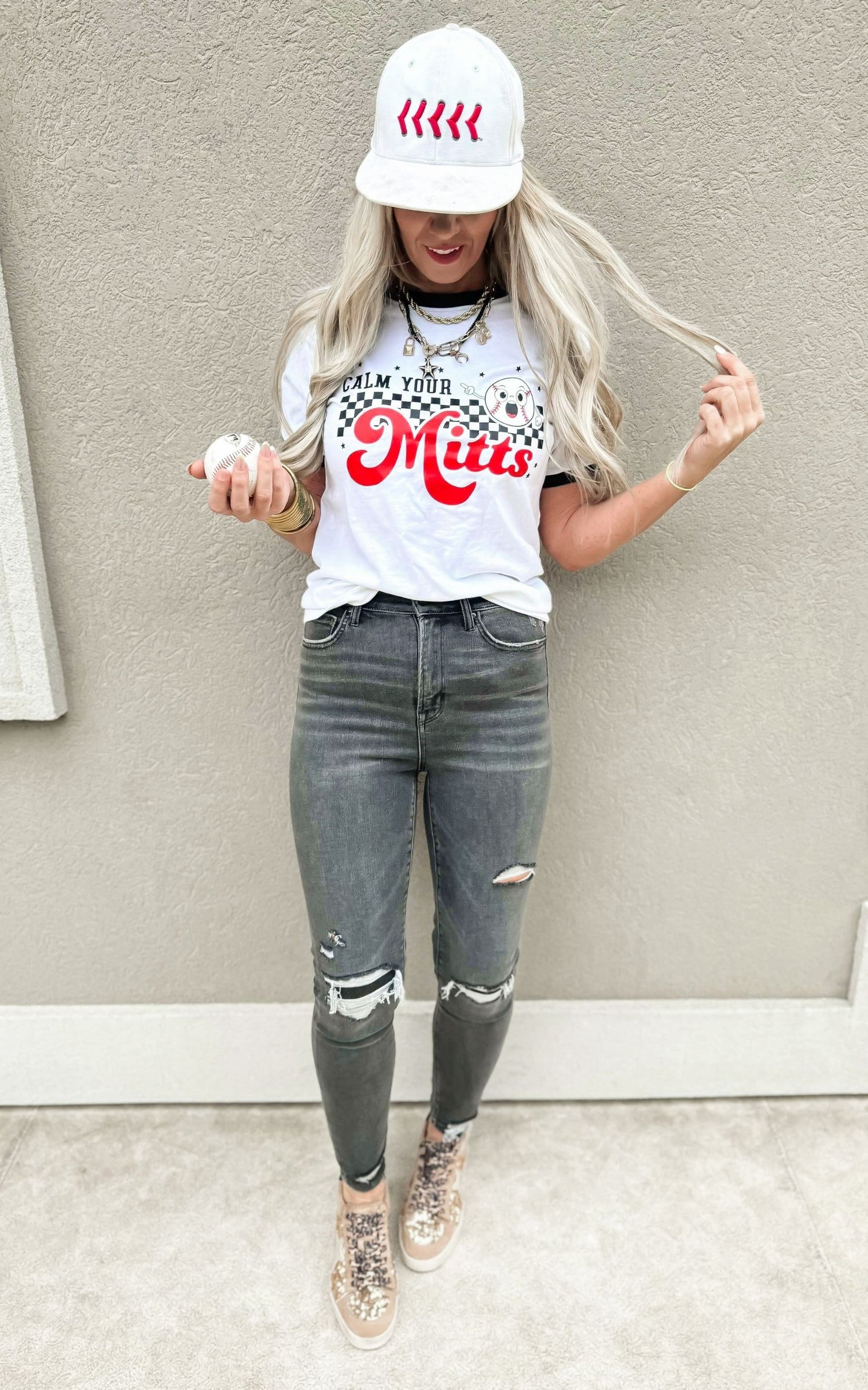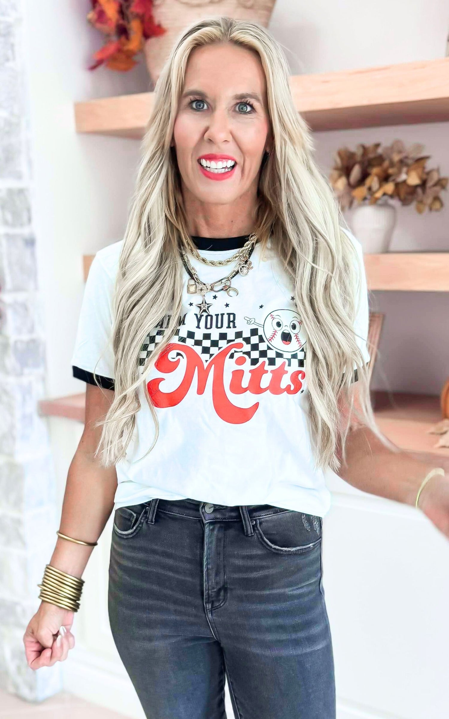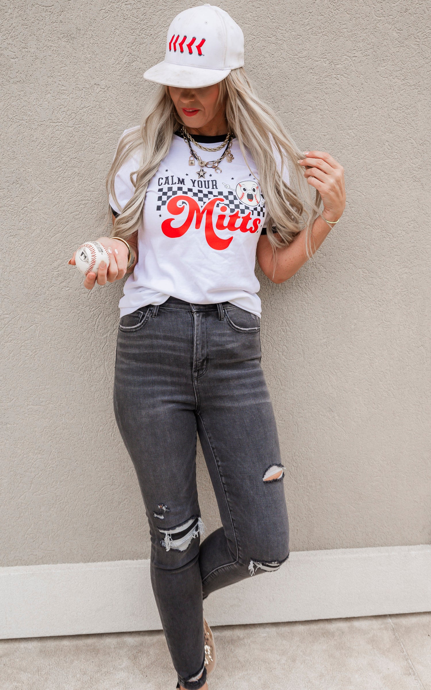 Unleash your calm and confident style with our Calm Your Mitts Ringer Graphic T-shirt! Made with quality materials, this stylish shirt features a unique graphic design that is sure to catch attention. Show off your love for keeping cool under pressure with this must-have addition to your wardrobe.