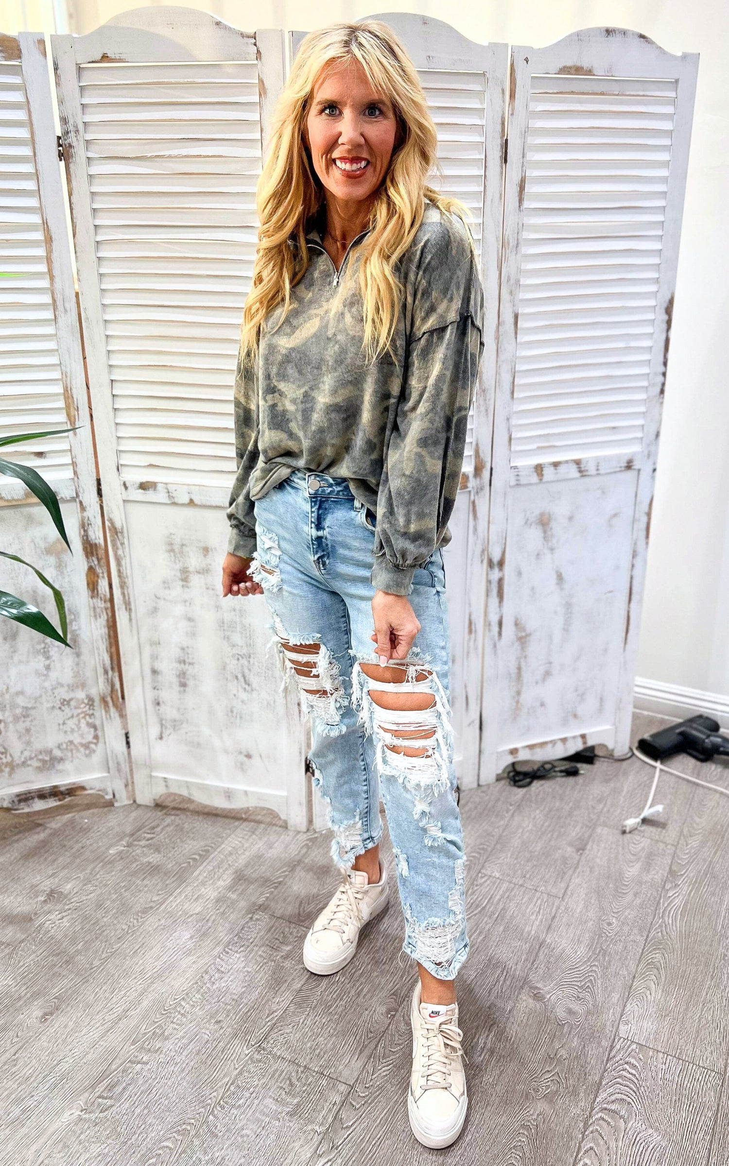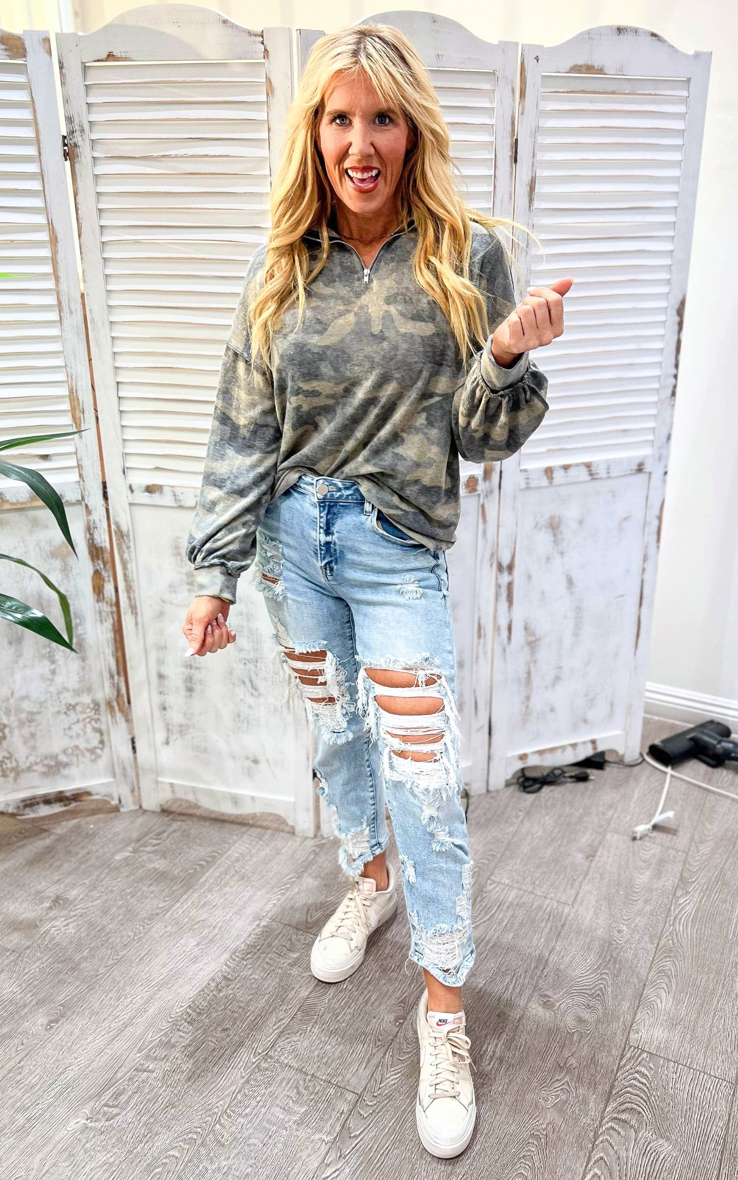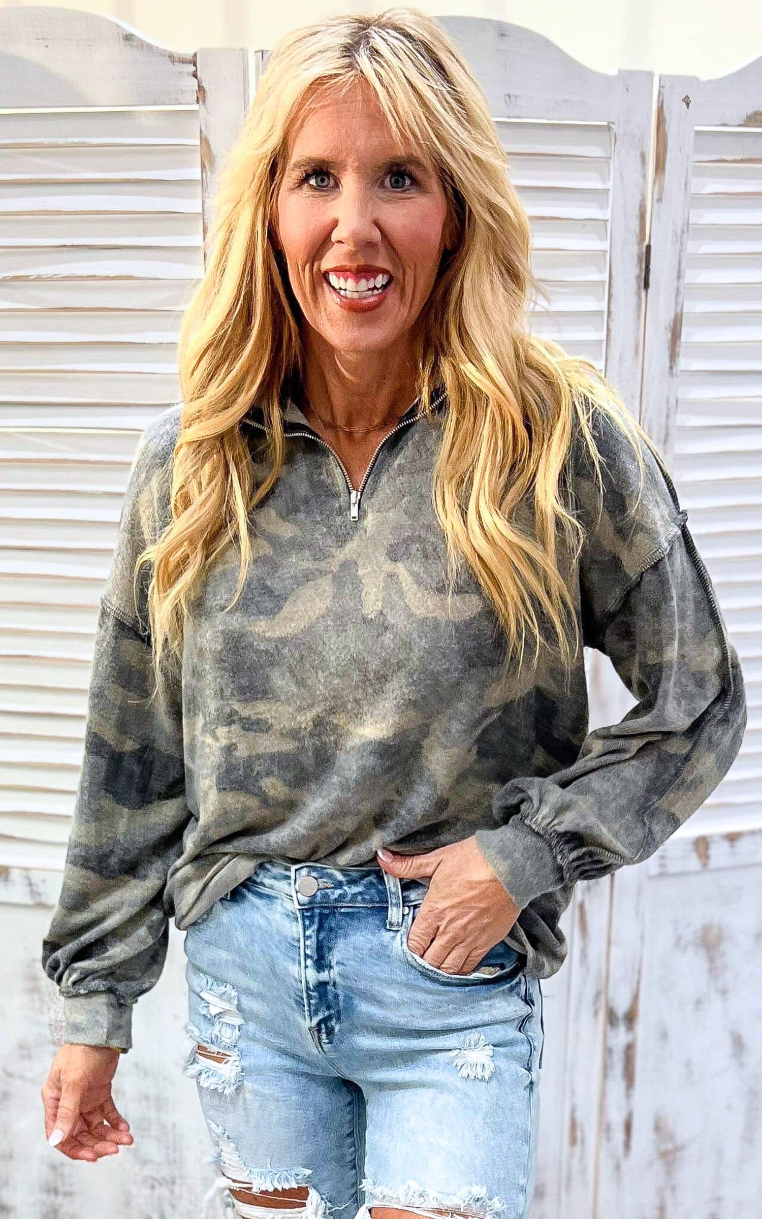 Stay fashionable while blending in with this Camo Mock Neck Sweater! With its trendy camo design and comfortable mock neck, this sweater is perfect for any casual look. Be effortlessly cool and stand out in this must-have piece.