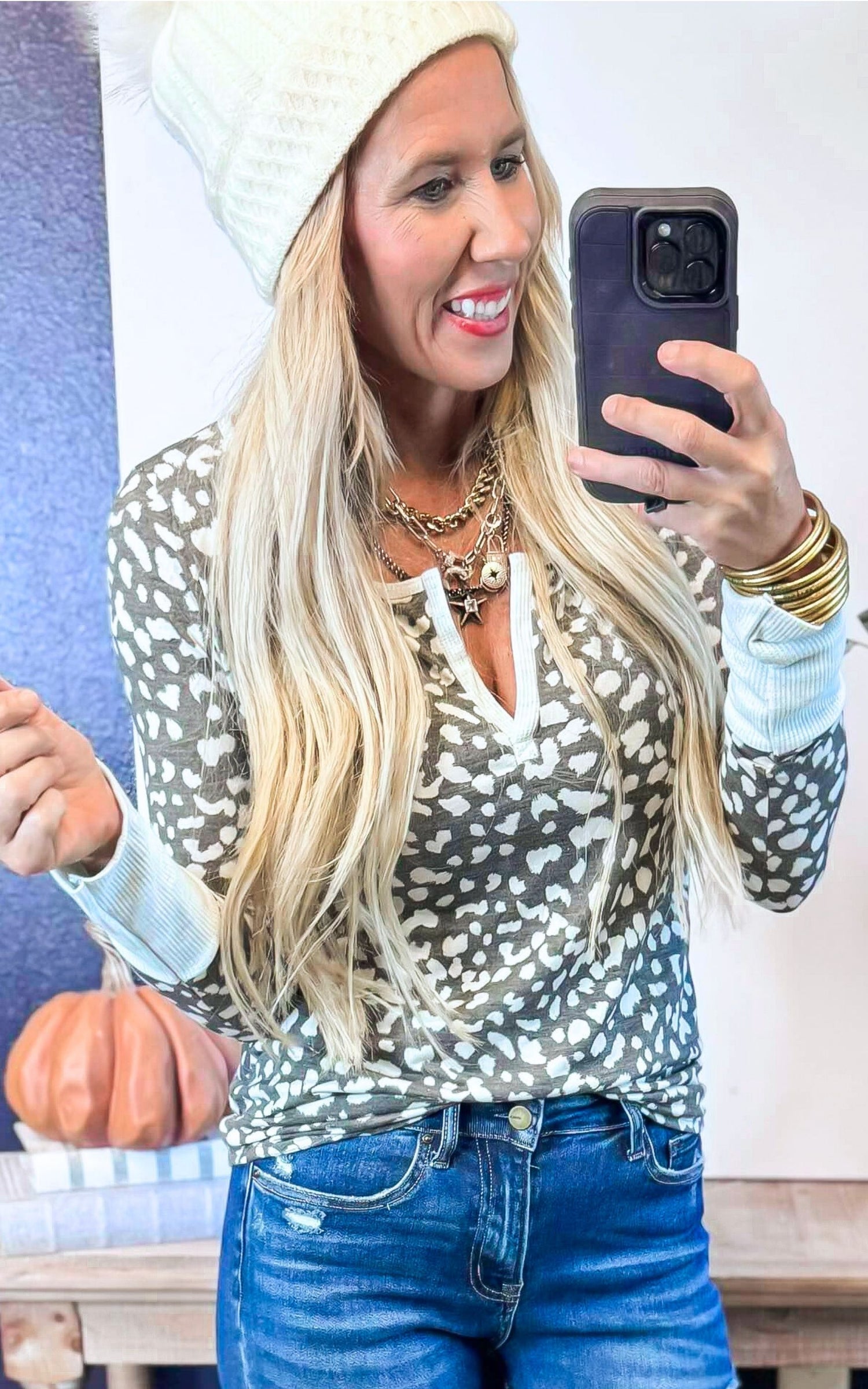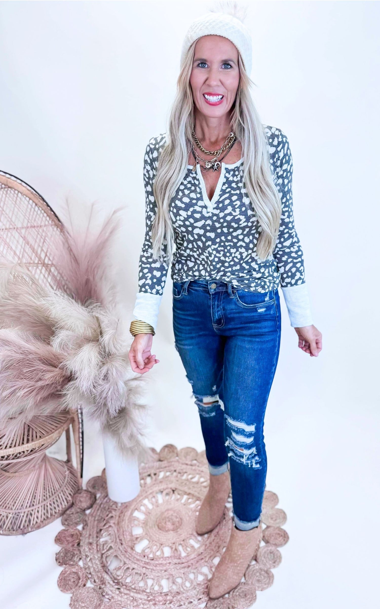 Experience the fierce and stylish look of our Charcoal Leopard Long Sleeve Top! Made with a trendy charcoal leopard print, this top will elevate any outfit and make you stand out. The long sleeves provide both style and warmth, making it a perfect addition to your wardrobe.