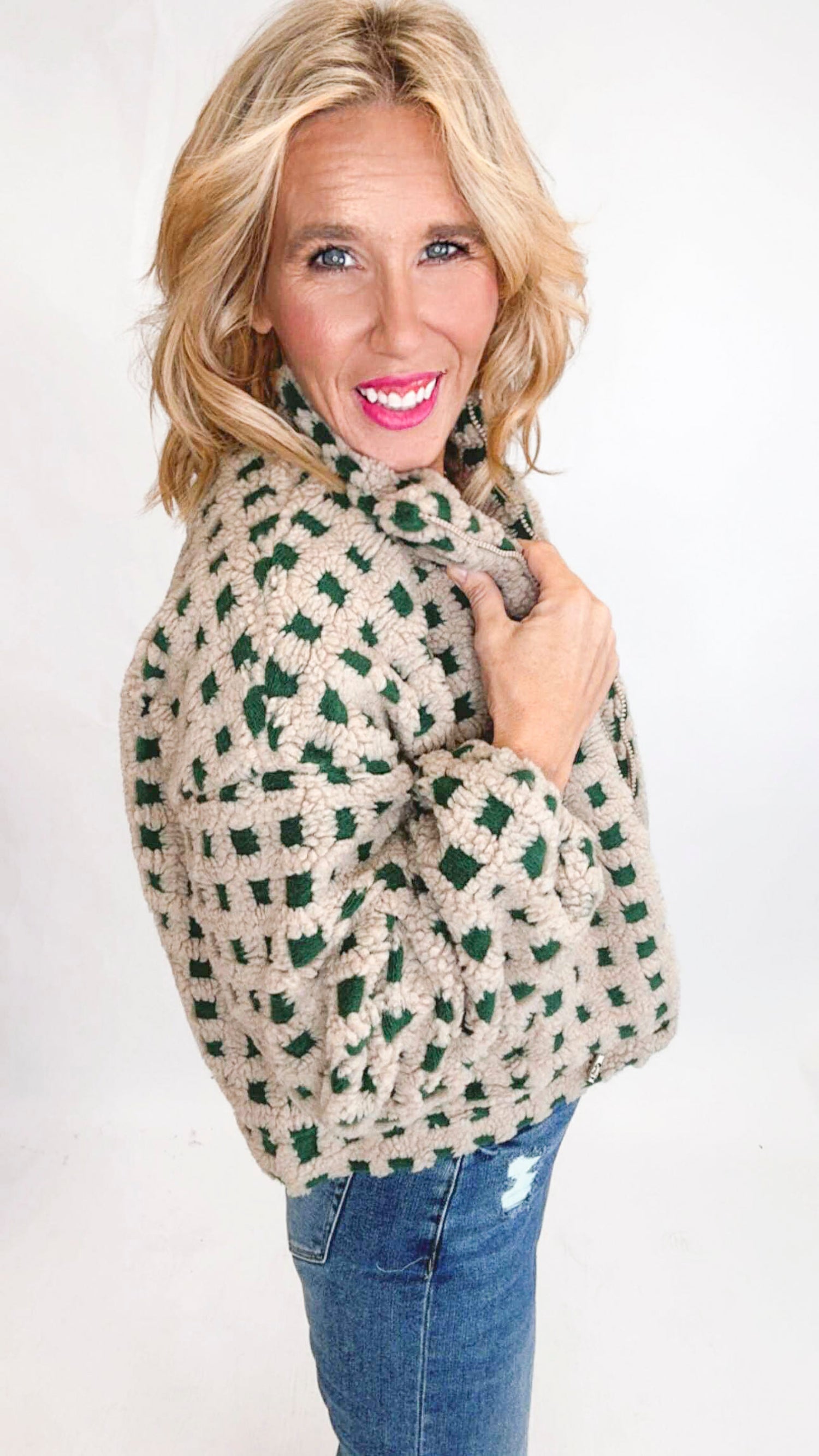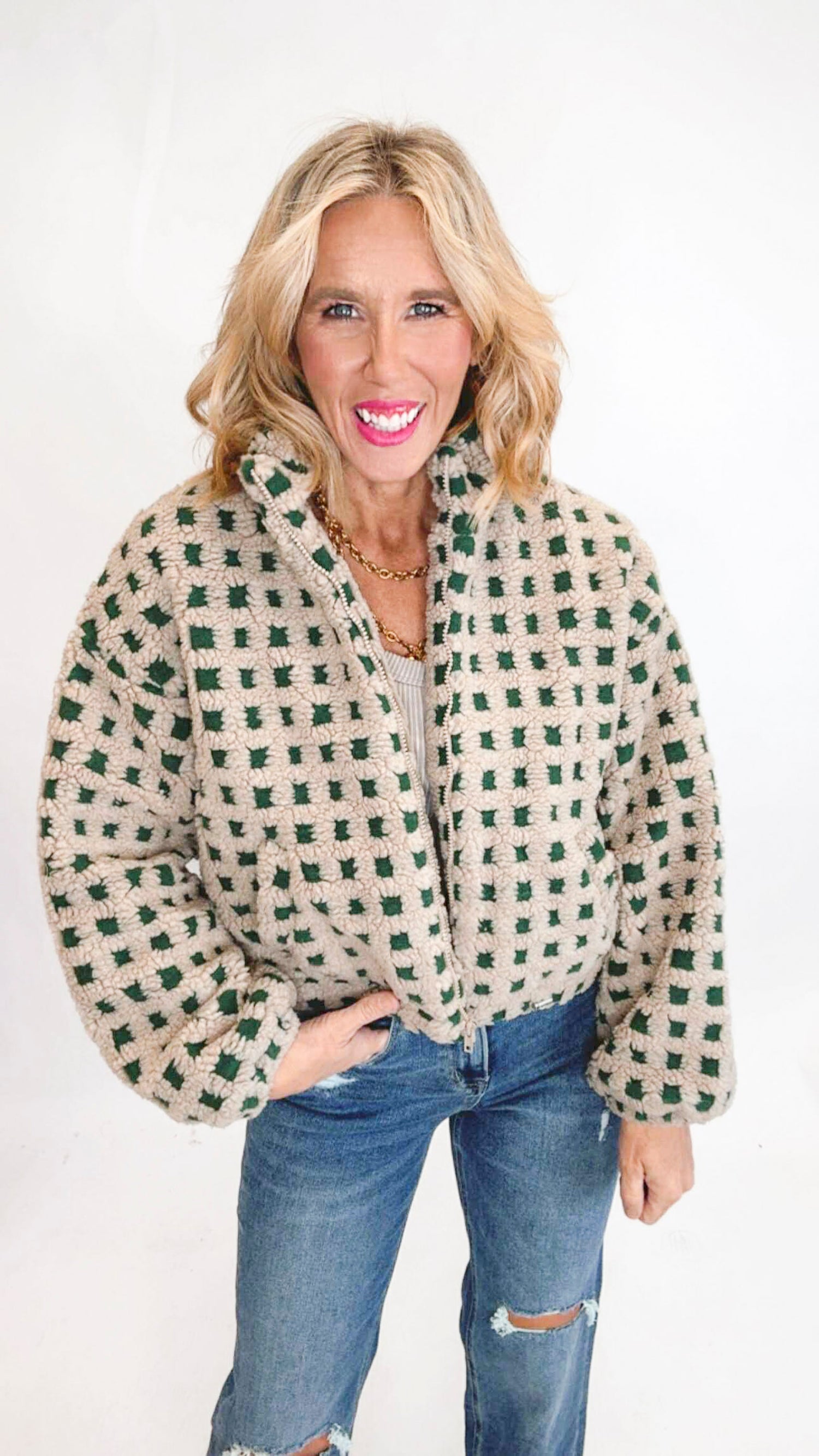 Meet your new cold-weather crush — the Checker Sherpa Zip Up Jacket is where retro charm meets cloud-level comfort. With its textured check design and ultra-plush feel, this piece says “I’m cozy” but make it fashion.