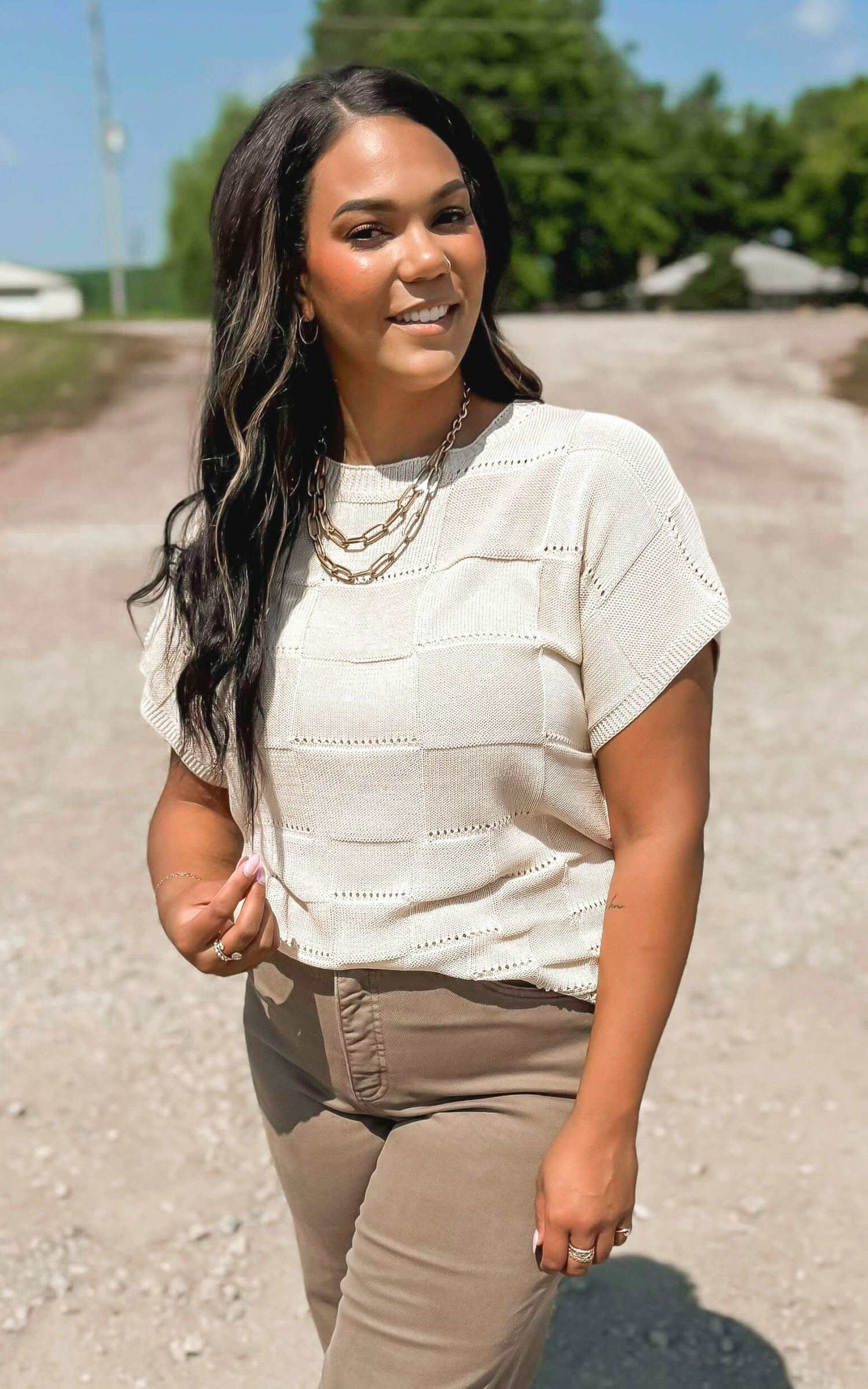 Stay stylish and cozy this fall with our Checking into Fall Short Sleeve Sweater Top. Perfect for layering or wearing on its own, this top is a must-have for any wardrobe. With its soft fabric and trendy design, you'll be checking into your fall fashion goals in no time. (Sweater weather, anyone?)