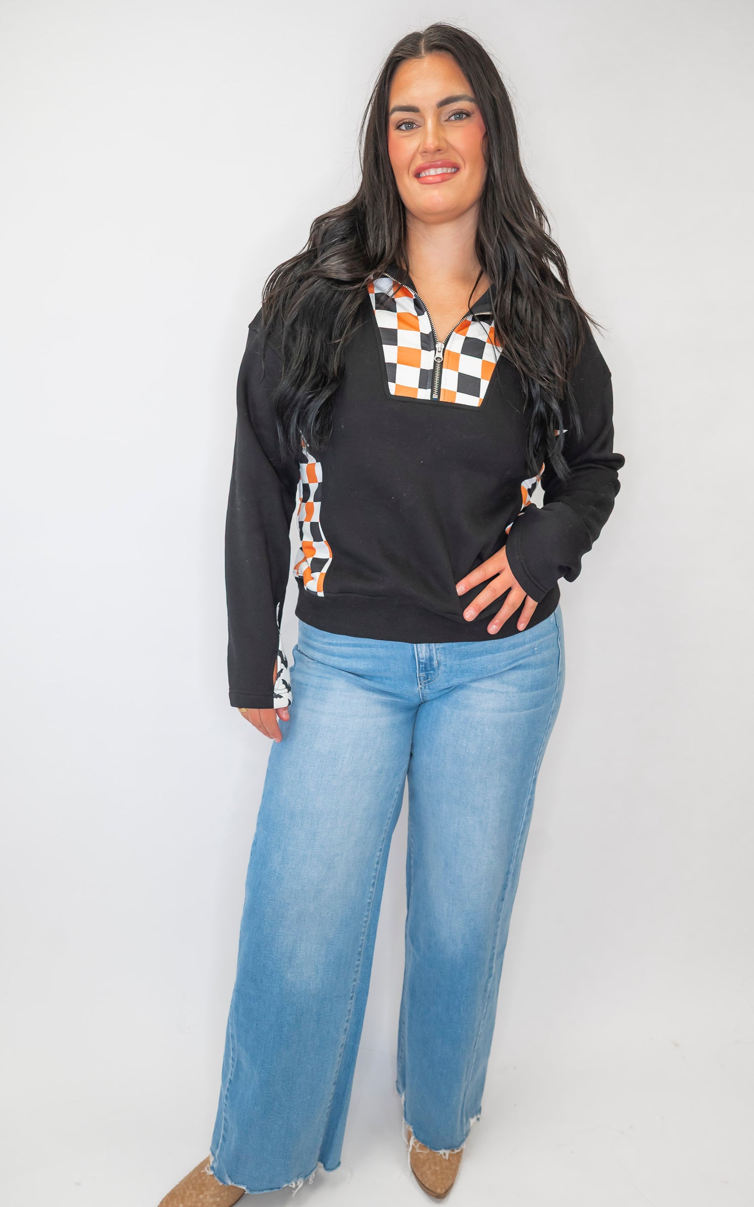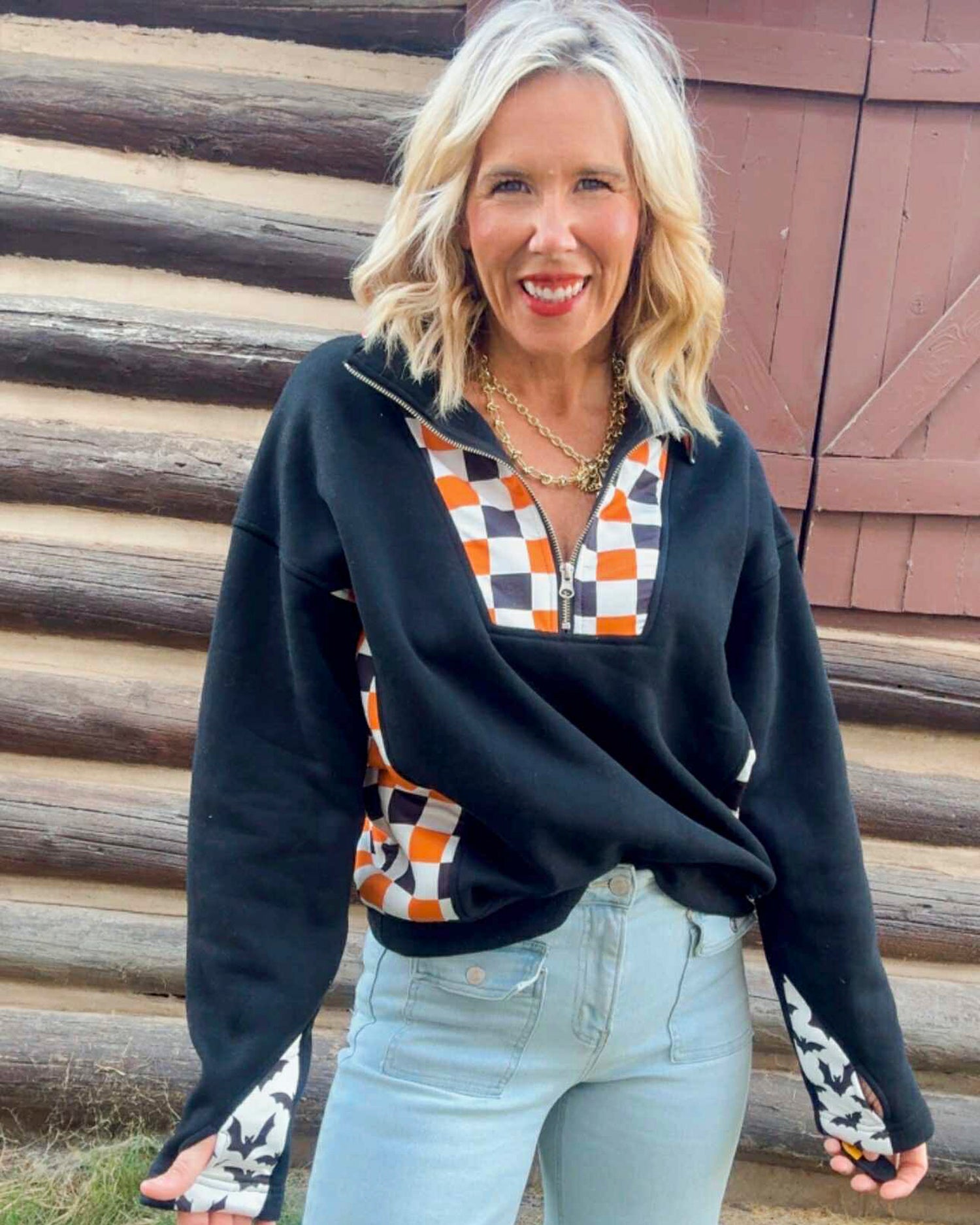 You're going to love this fun and festive sweater! Our Checkmate Spooky Delaney Half-Zip Pullover by Salty Wave is the perfect way to get into the Halloween spirit while staying super cozy. This soft, black pullover has a half-zip neckline and a unique print featuring a cool checkerboard pattern in orange and white, with a subtle bat print on the sides. It's the perfect top to throw on with your favorite jeans for a festive fall day or a night of fun with friends.