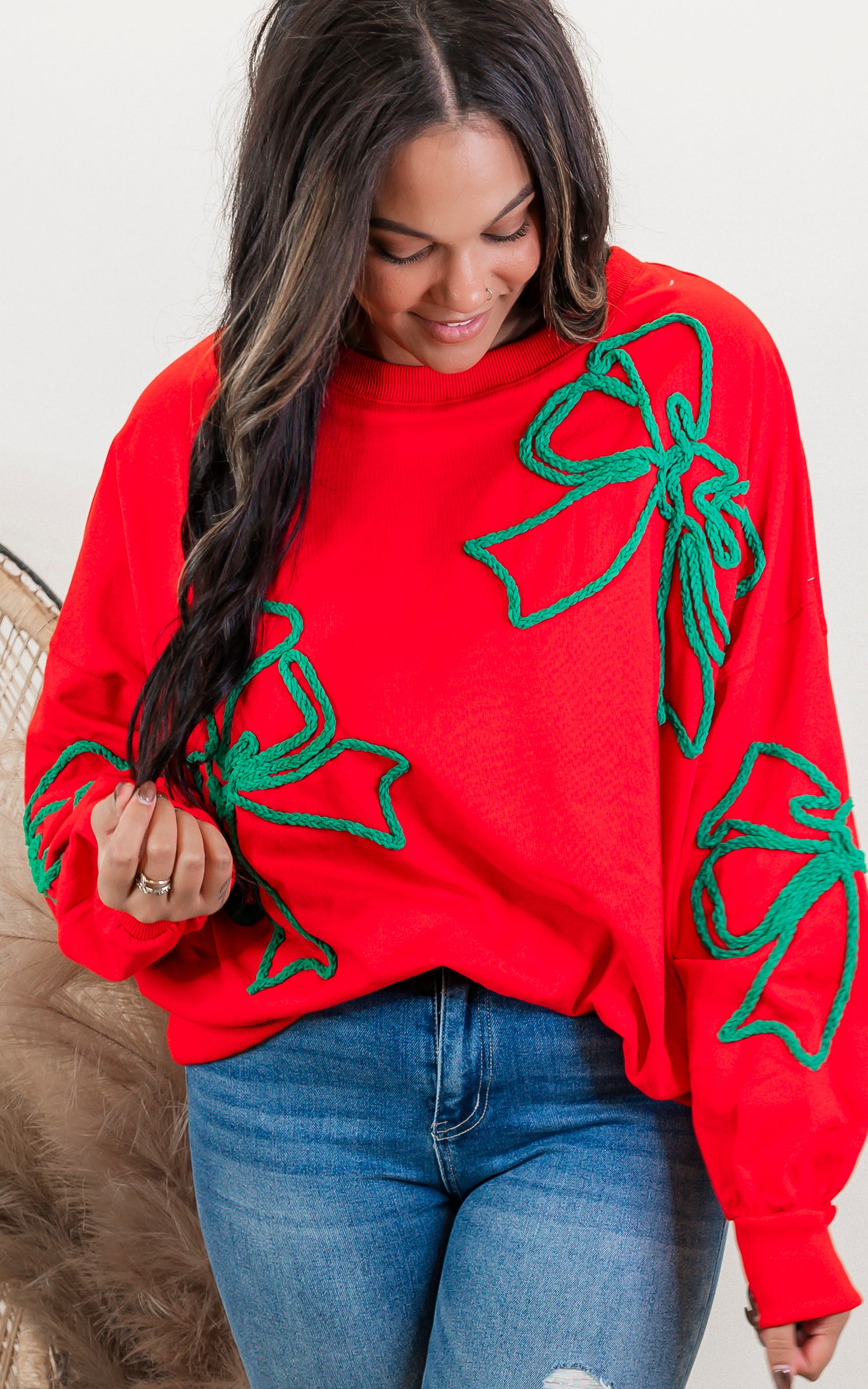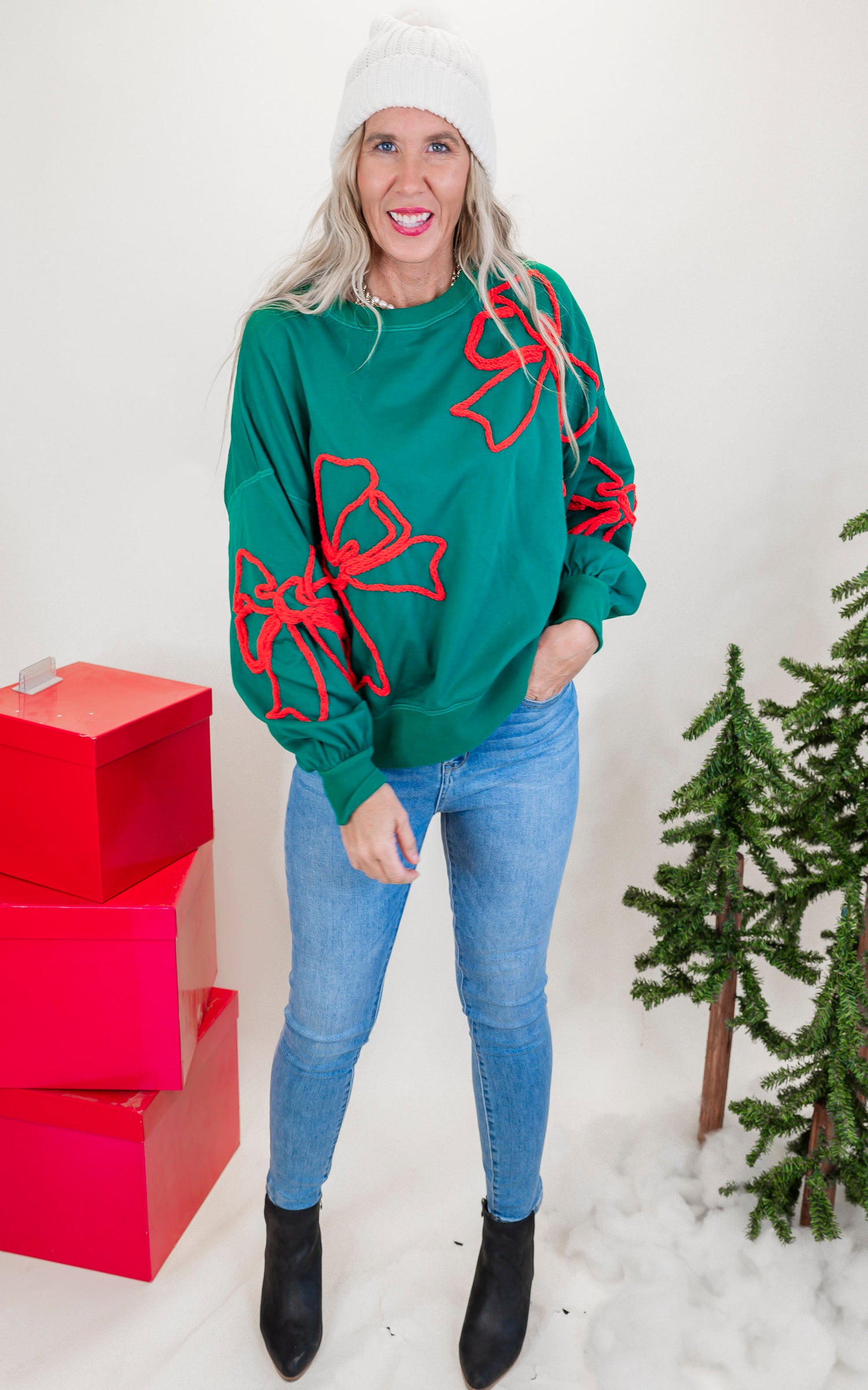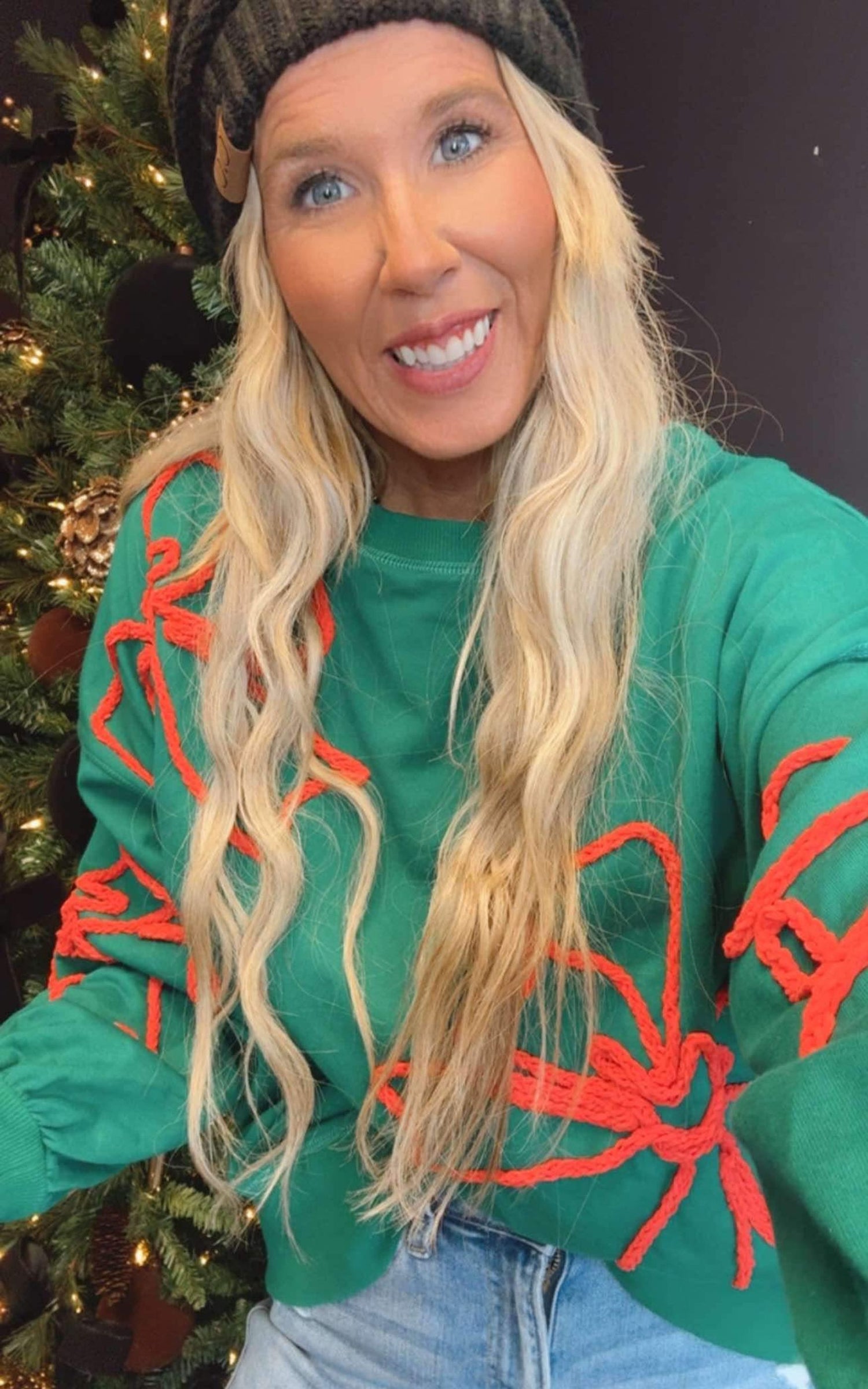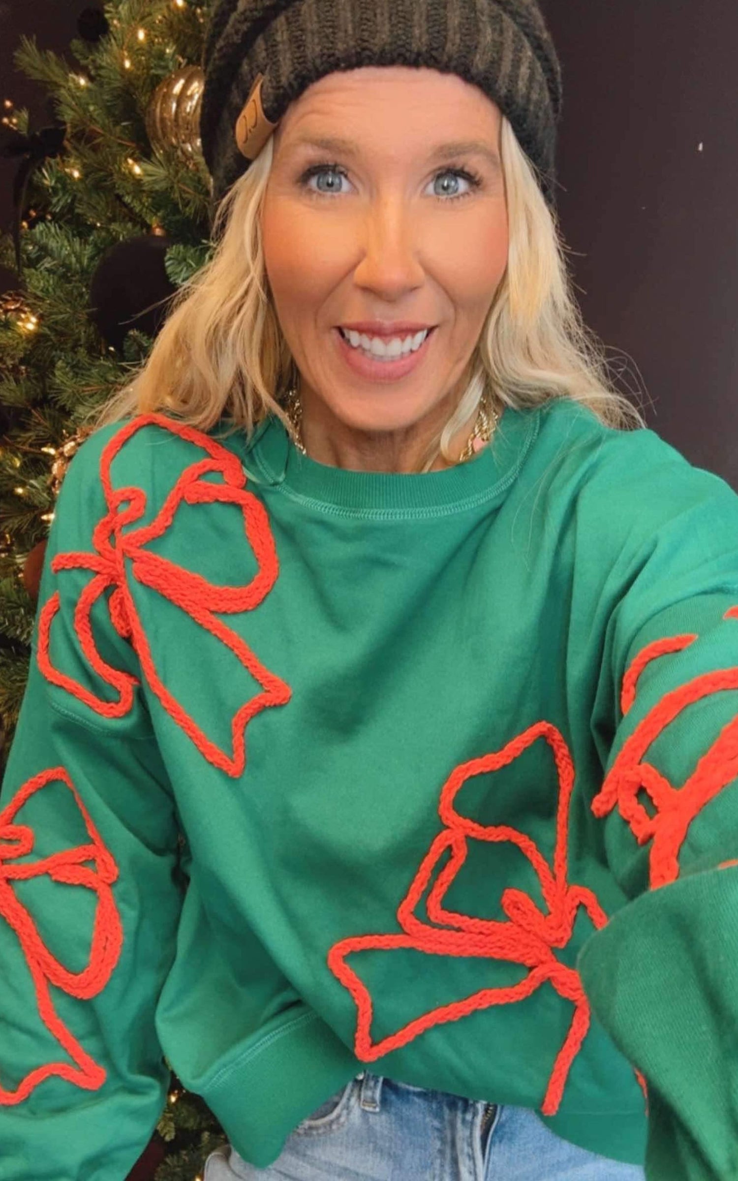 Get in the holiday spirit with our Christmas Bows Holiday Sweatshirt Top! Soft and comfortable, this top features festive bows that add a touch of charm to your winter wardrobe. Stay cozy and stylish this season with this must-have holiday piece.