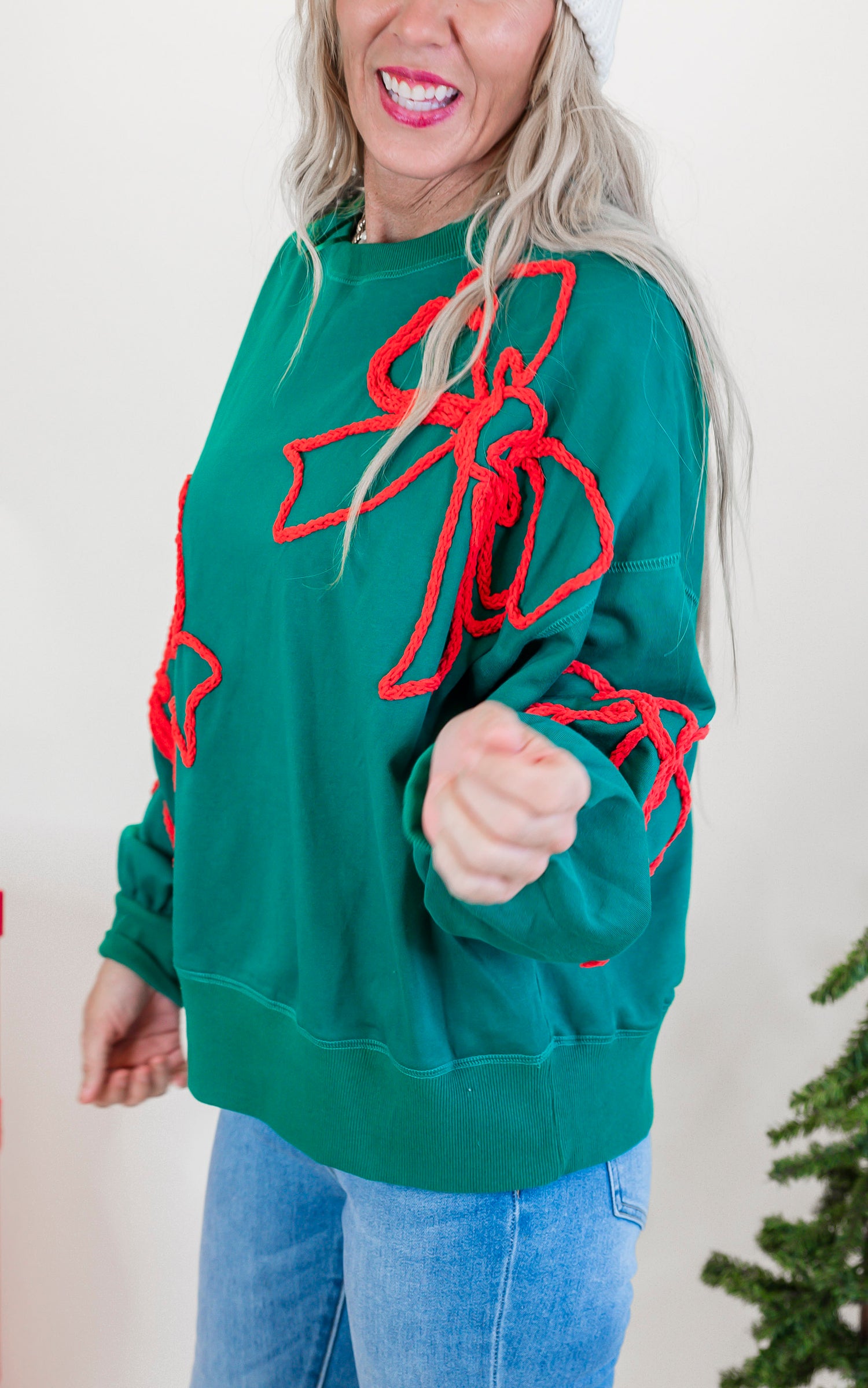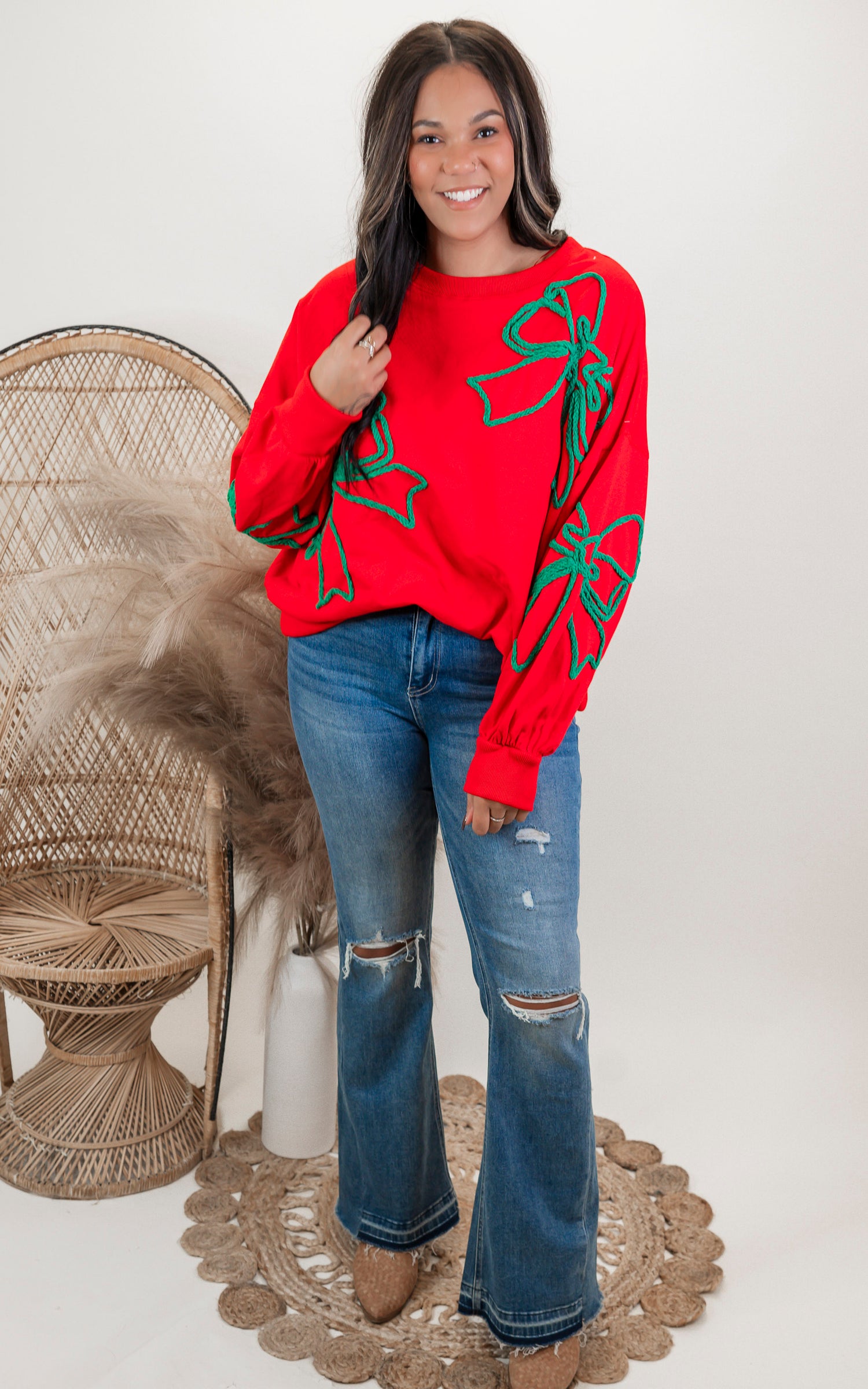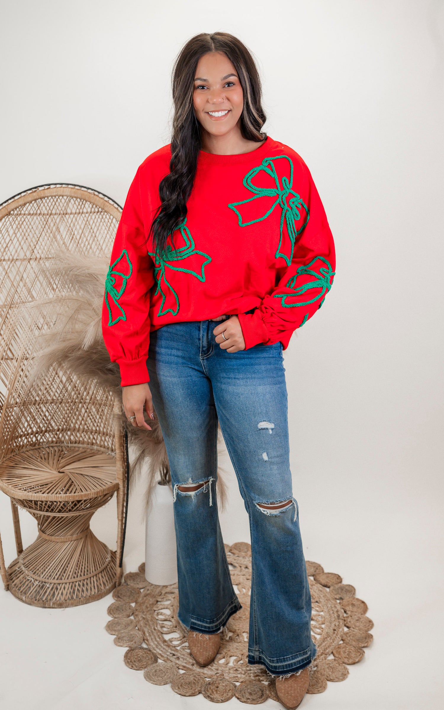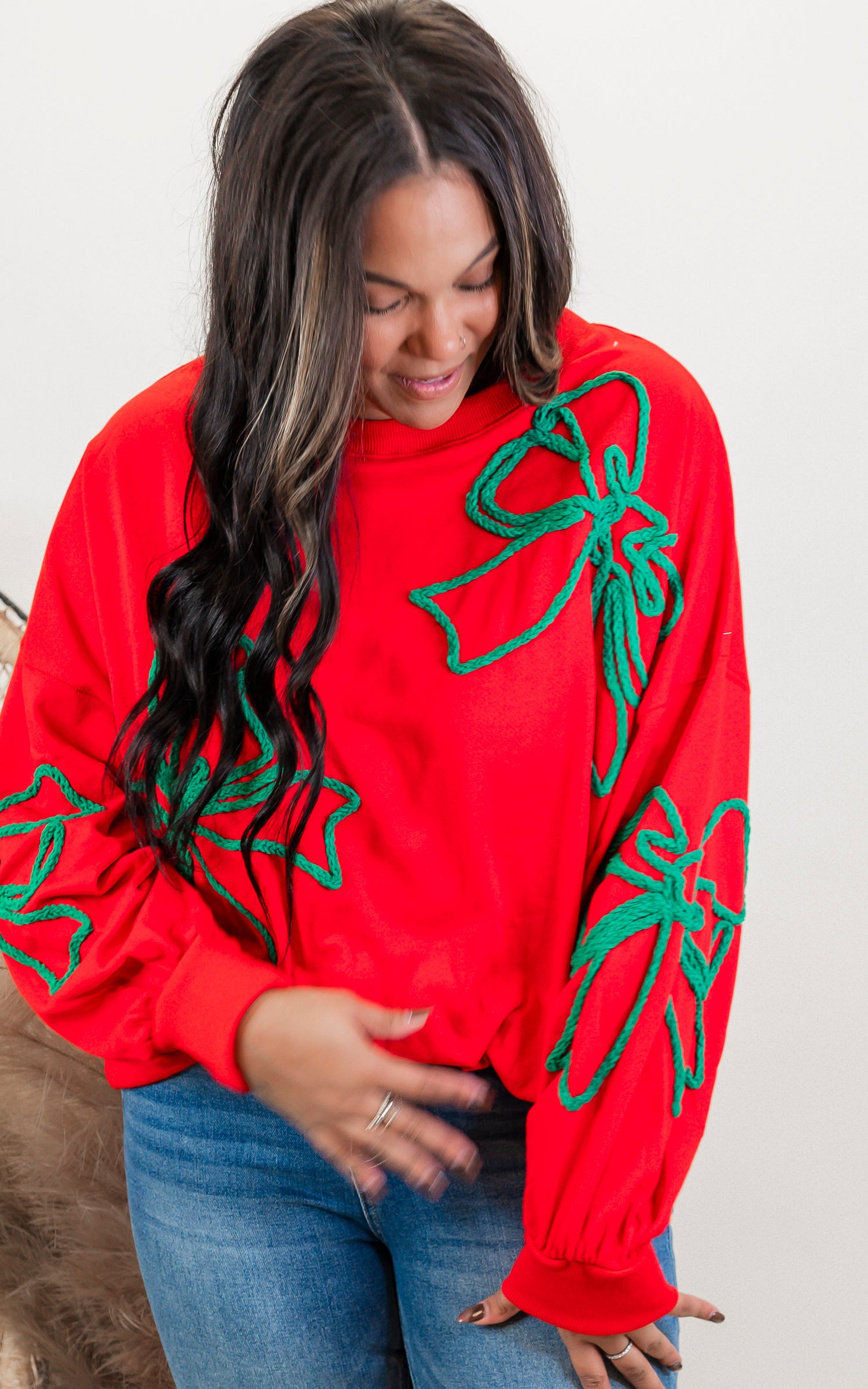 Get in the holiday spirit with our Christmas Bows Holiday Sweatshirt Top! Soft and comfortable, this top features festive bows that add a touch of charm to your winter wardrobe. Stay cozy and stylish this season with this must-have holiday piece.