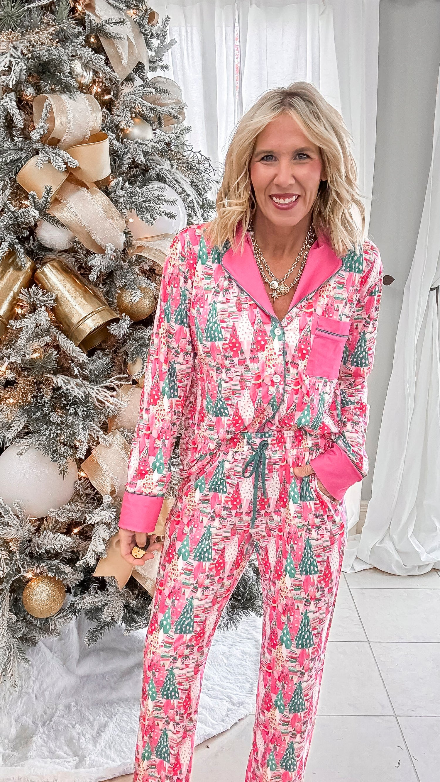 Bring on the cozy Christmas mornings with the Christmas Tree Farm Wide Leg Pajama Set! Bursting with pink and green holiday trees, this set is pure festive perfection — comfy enough for cocoa sipping, cute enough for matching pics under the tree.