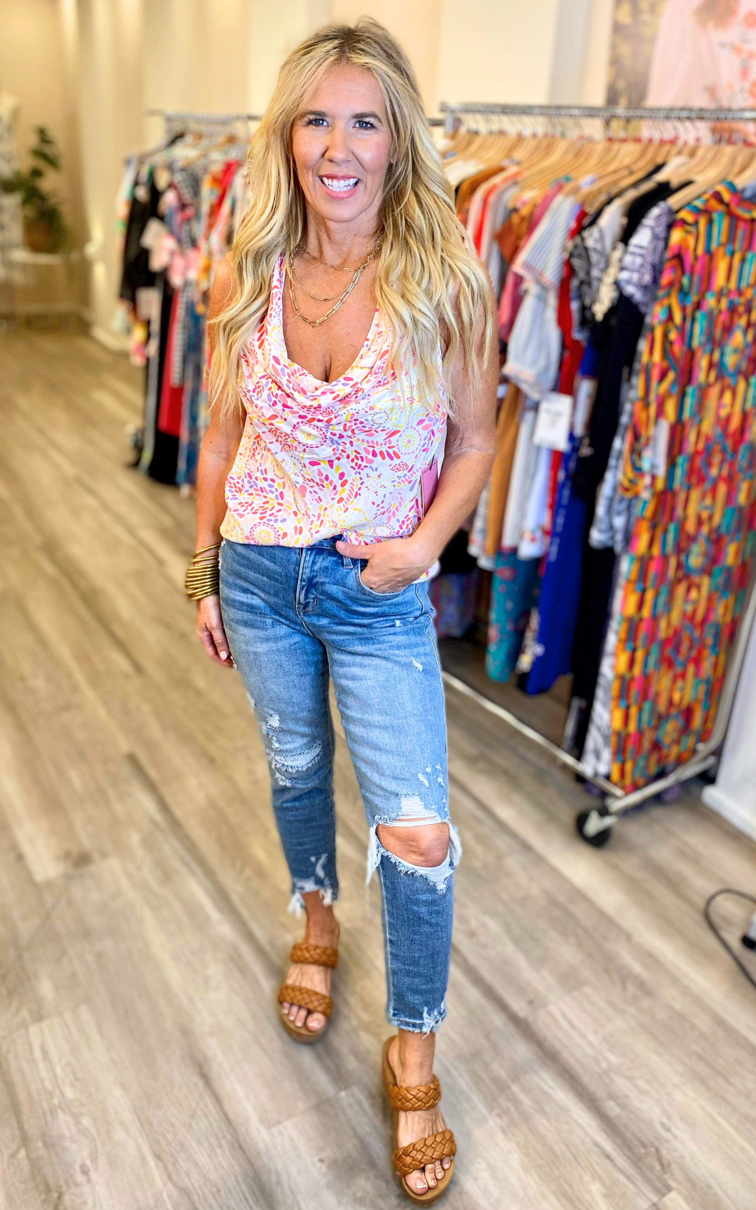 Welcome to easy elegance! This Cowl Neck Print Top by Andree by Unit adds an effortless, chic vibe to your wardrobe with its lightweight fabric and bold print. It's a simple yet vibrant way to add a touch of pizzazz to any outfit!