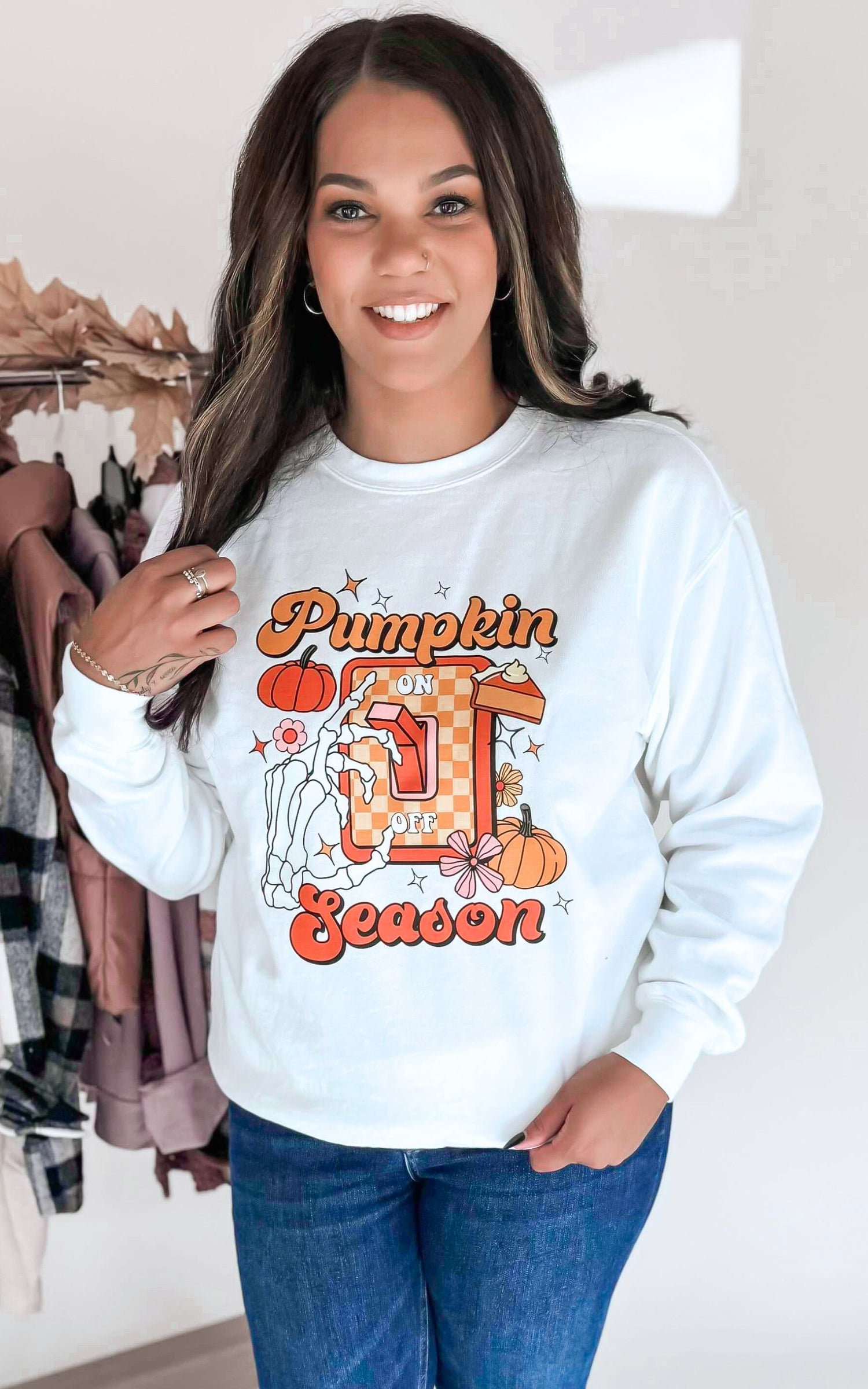 Stay cozy and stylish all season long with our Pumpkin Season Pigment Dyed Graphic Sweatshirt! With a playful on/off button, this quirky sweatshirt is a must-have for pumpkin lovers. Perfect for lounging or layering, this sweatshirt is sure to become your go-to piece.