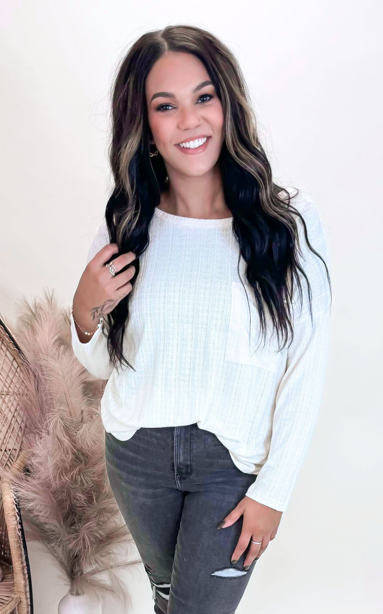 Experience pure comfort and style with our Cream Pointelle Sweater Knit Top from BiBi. The delicate pointelle knit adds a feminine touch, while the soft material keeps you cozy all day long. Elevate your wardrobe with this must-have piece that combines fashion and comfort seamlessly.