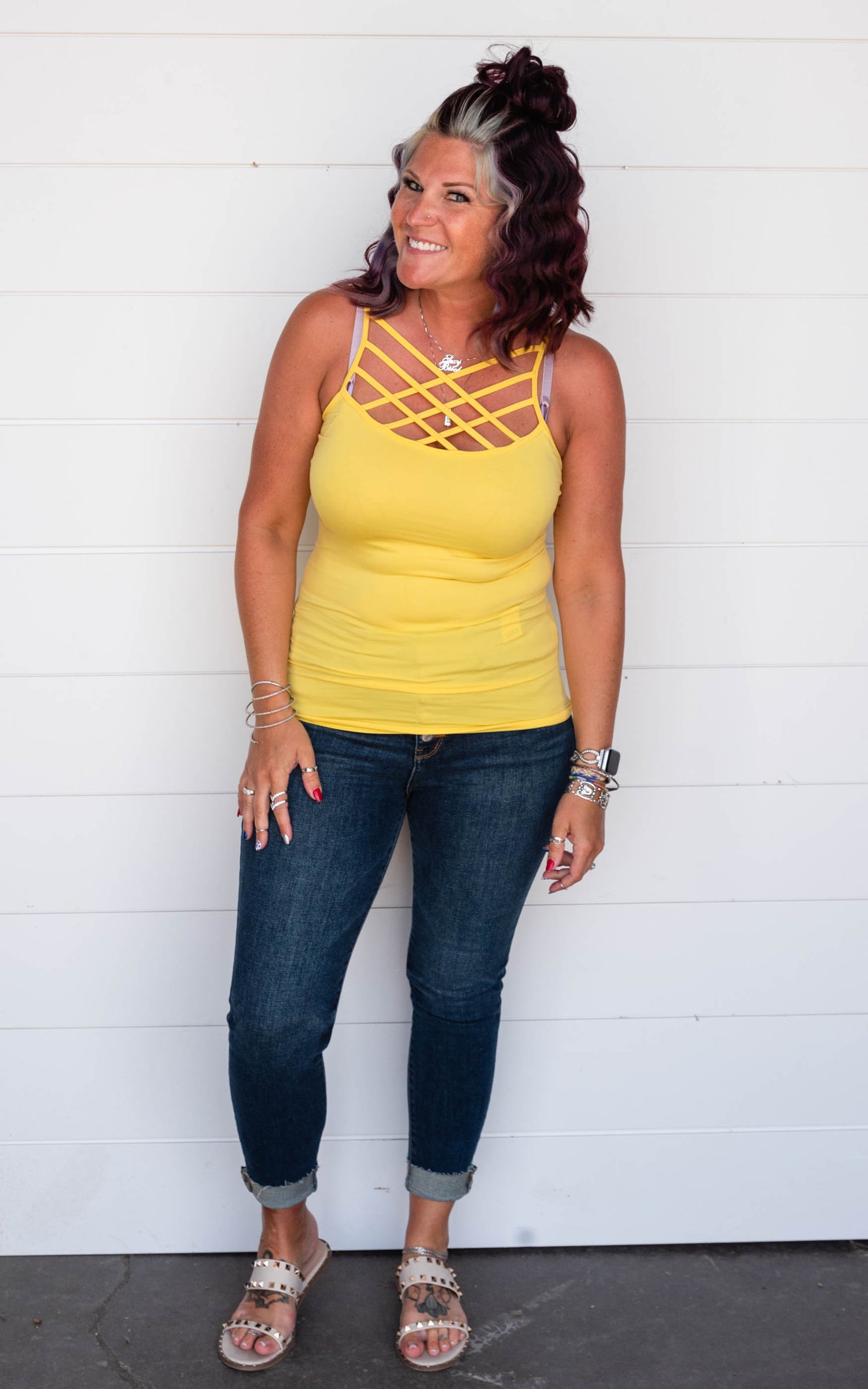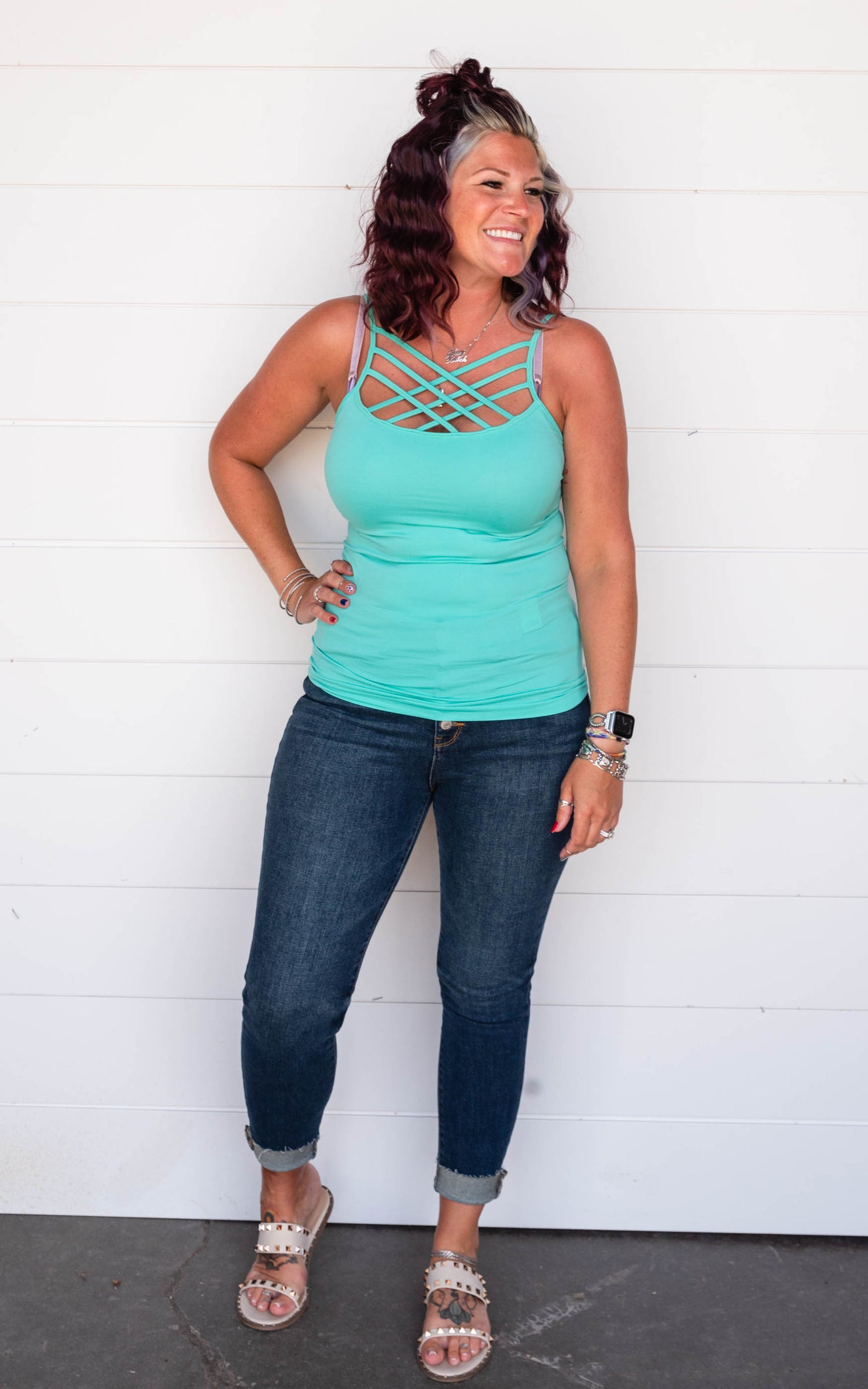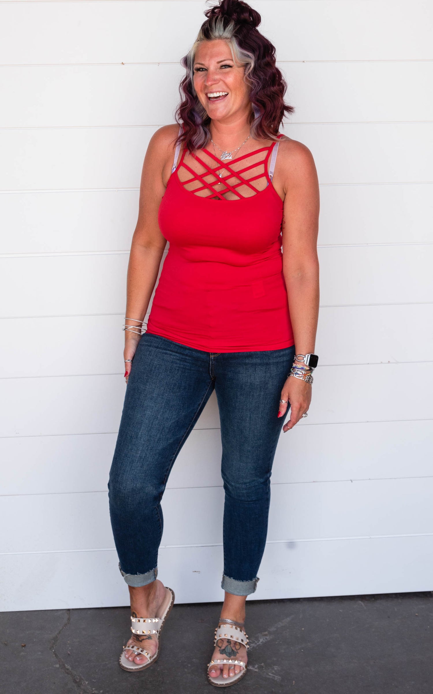 This criss cross tank top is a great style to wear alone or layer under those v-neck.