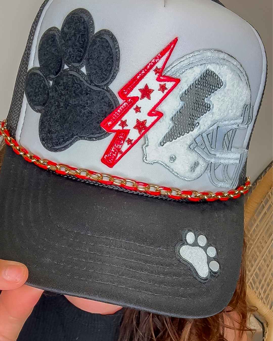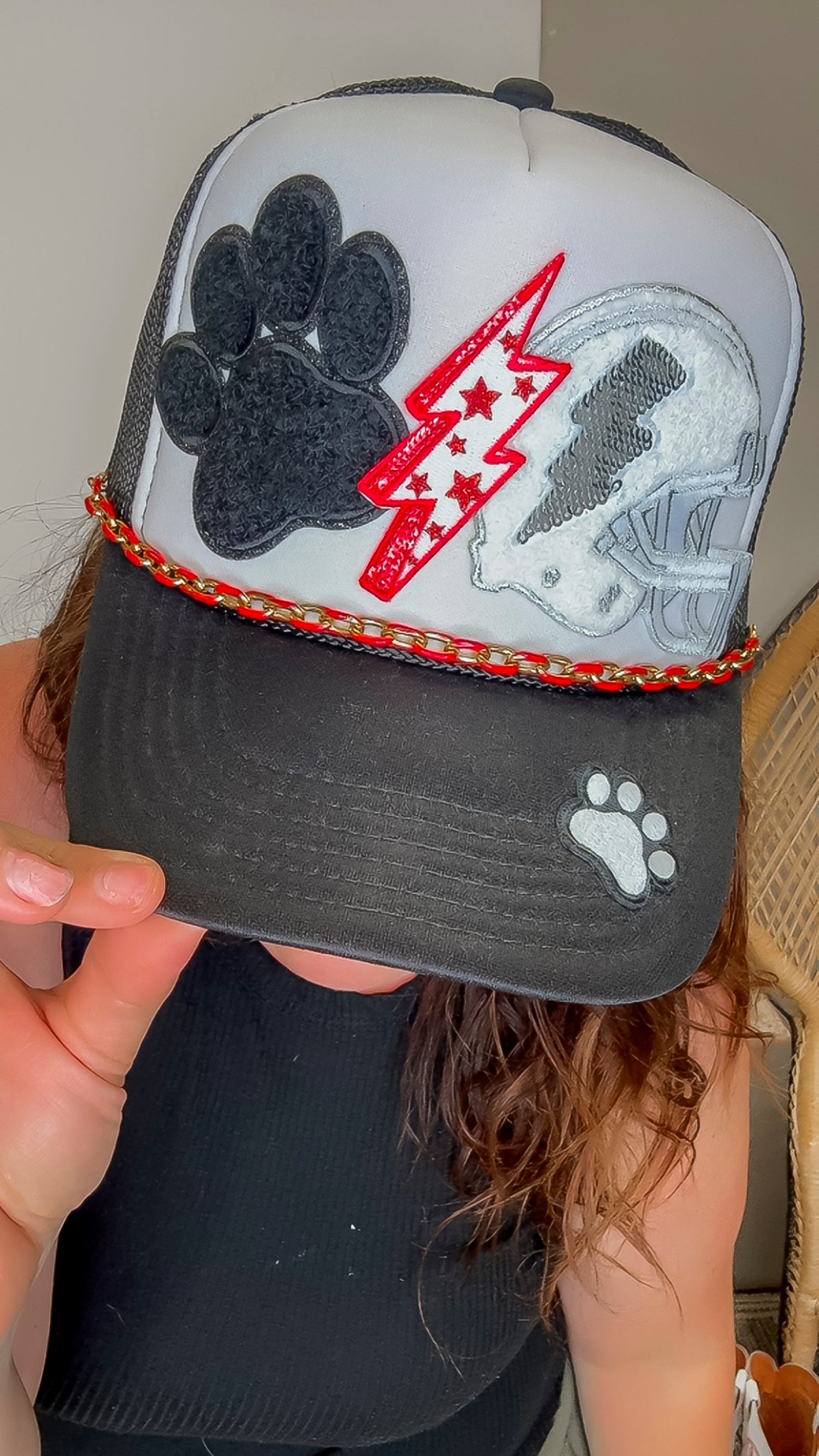 Sara's Custom Black & White Trucker Hat features that Football statement with those Bulldog paw. This Game Day style Trucker Hat does include the Chain for ultimate style impact.