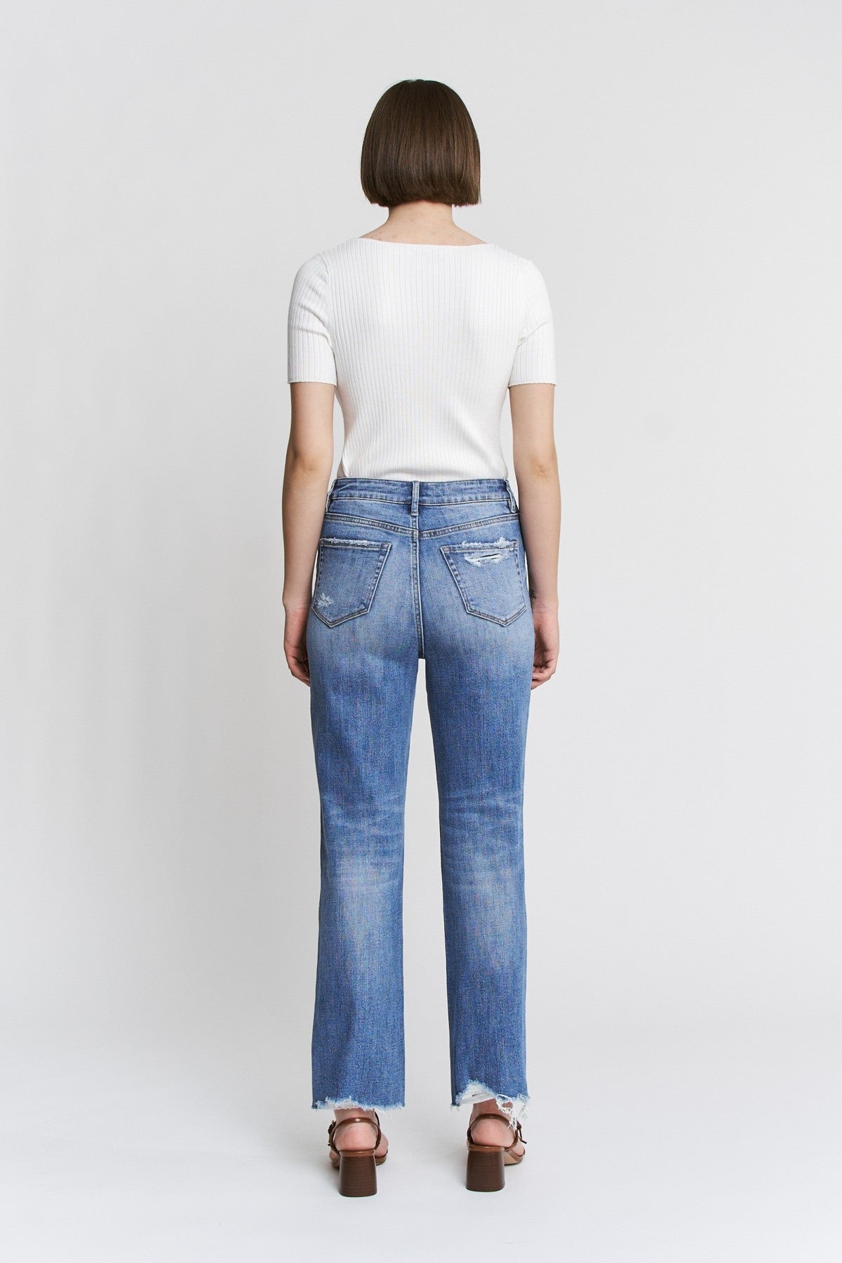 Dark Peacock Blue High Rise Raw Hem Loose Fit Straight Denim Jean | MICA *PREORDER