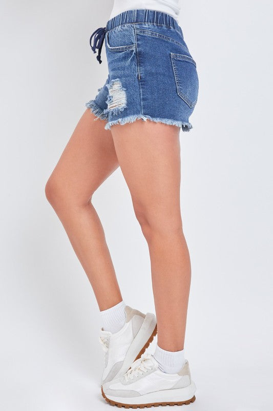 These High Rise Denim Shorts are the perfect Spring and Summer style. Featuring distressed front with that elastic waist band, functional drawstring, and functional front and back pockets. Complete you look with your floral tops, graphic tees and more.