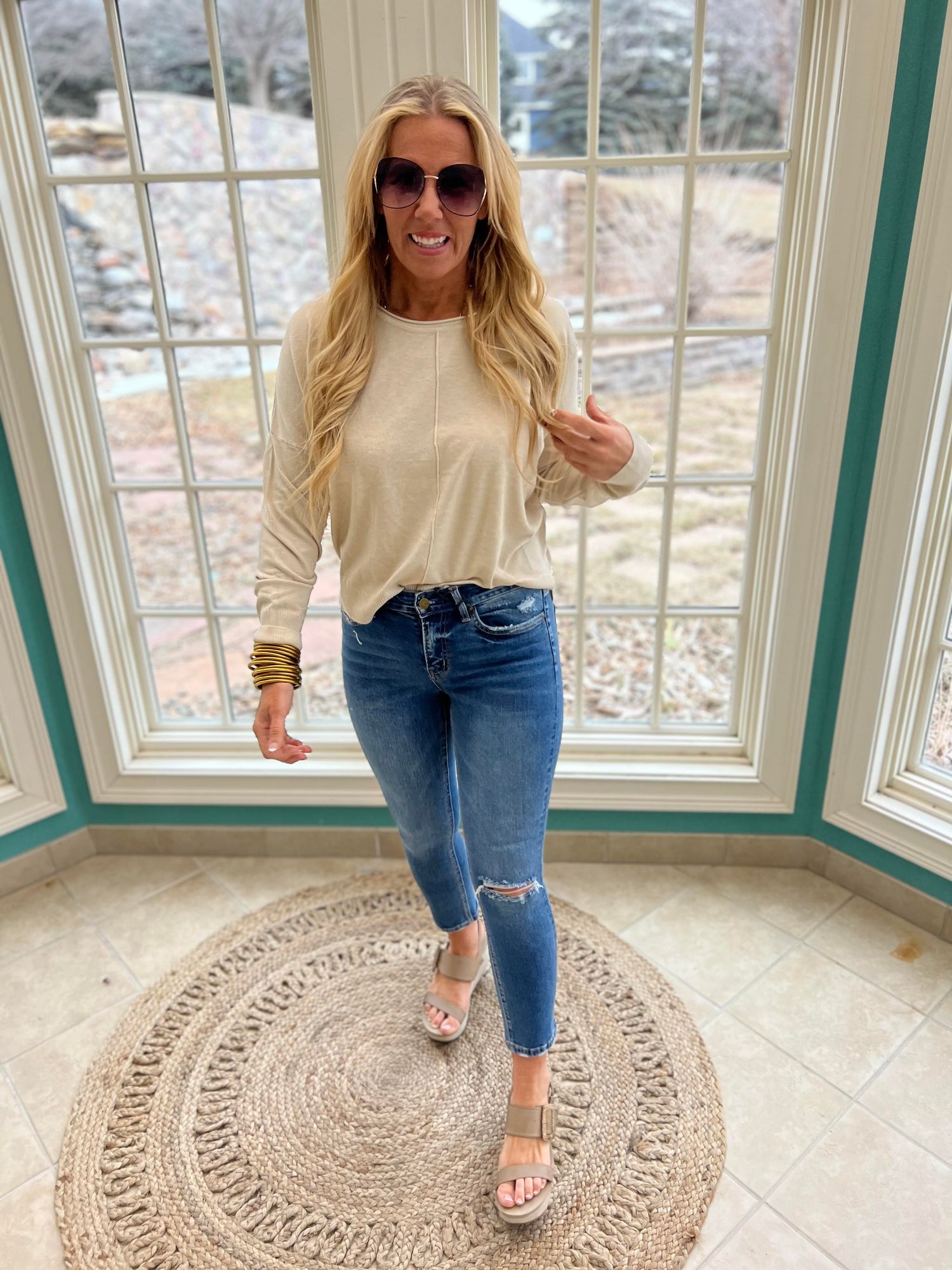 - Sara is a 36DD and a size 7 in Judy Blue. She is wearing the S/M in this Dreamer Sweater.