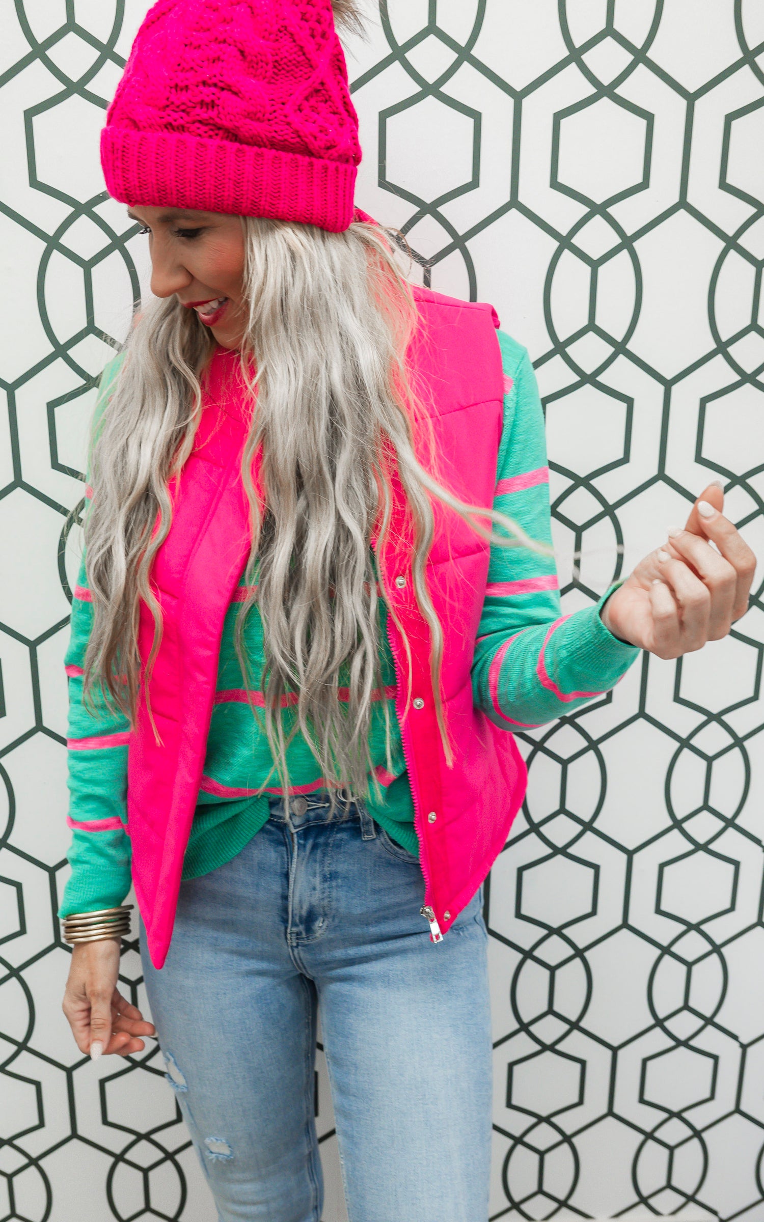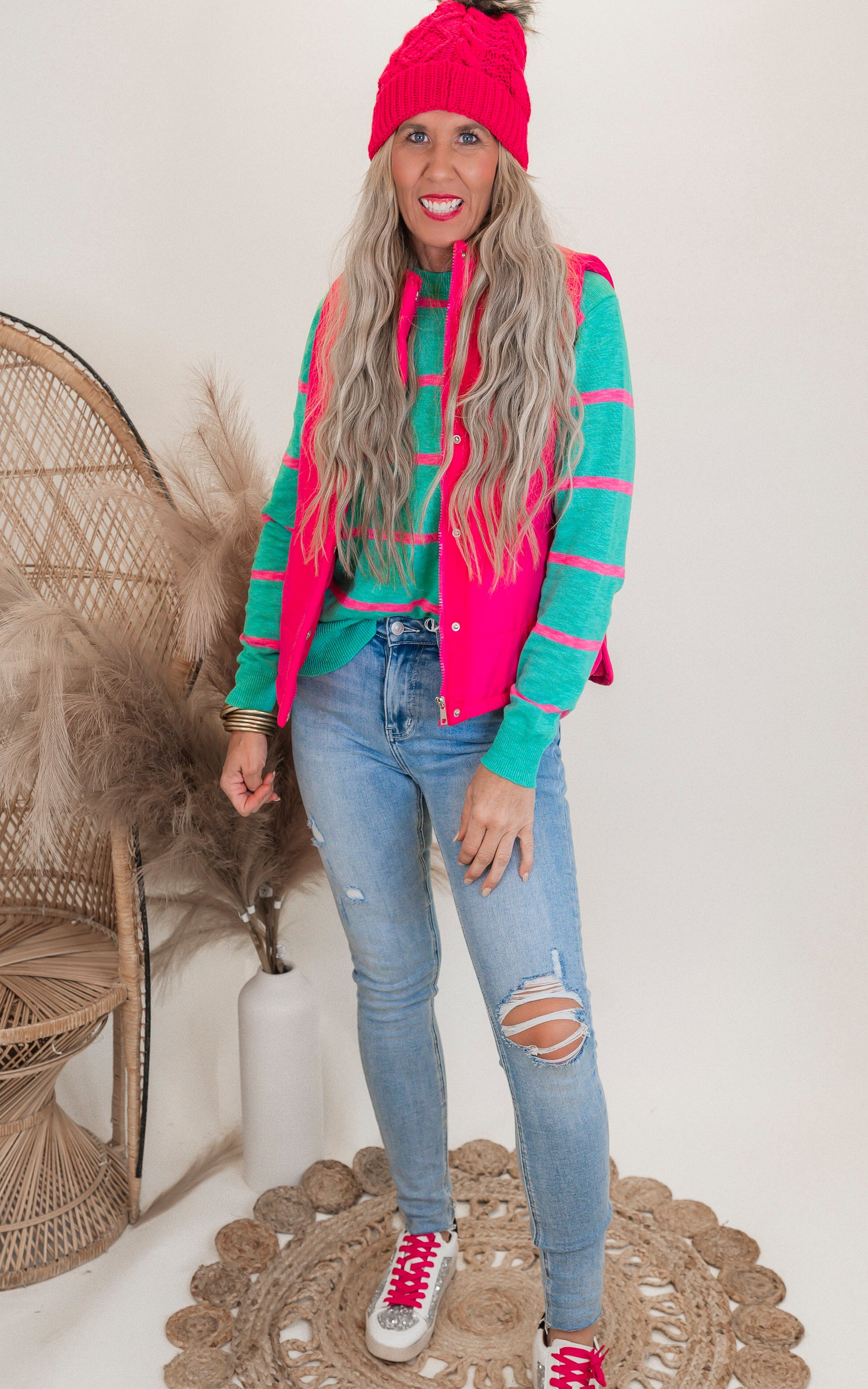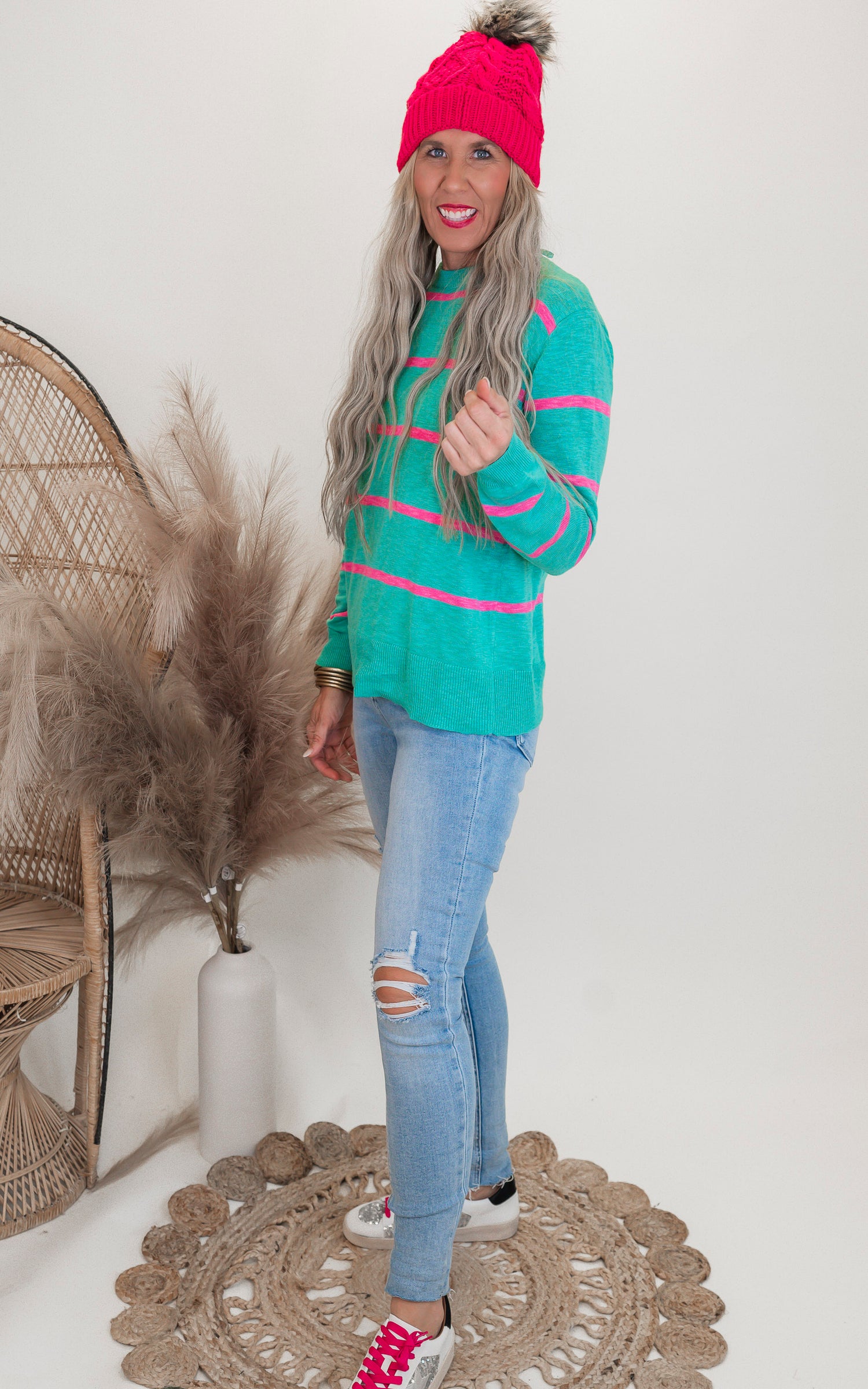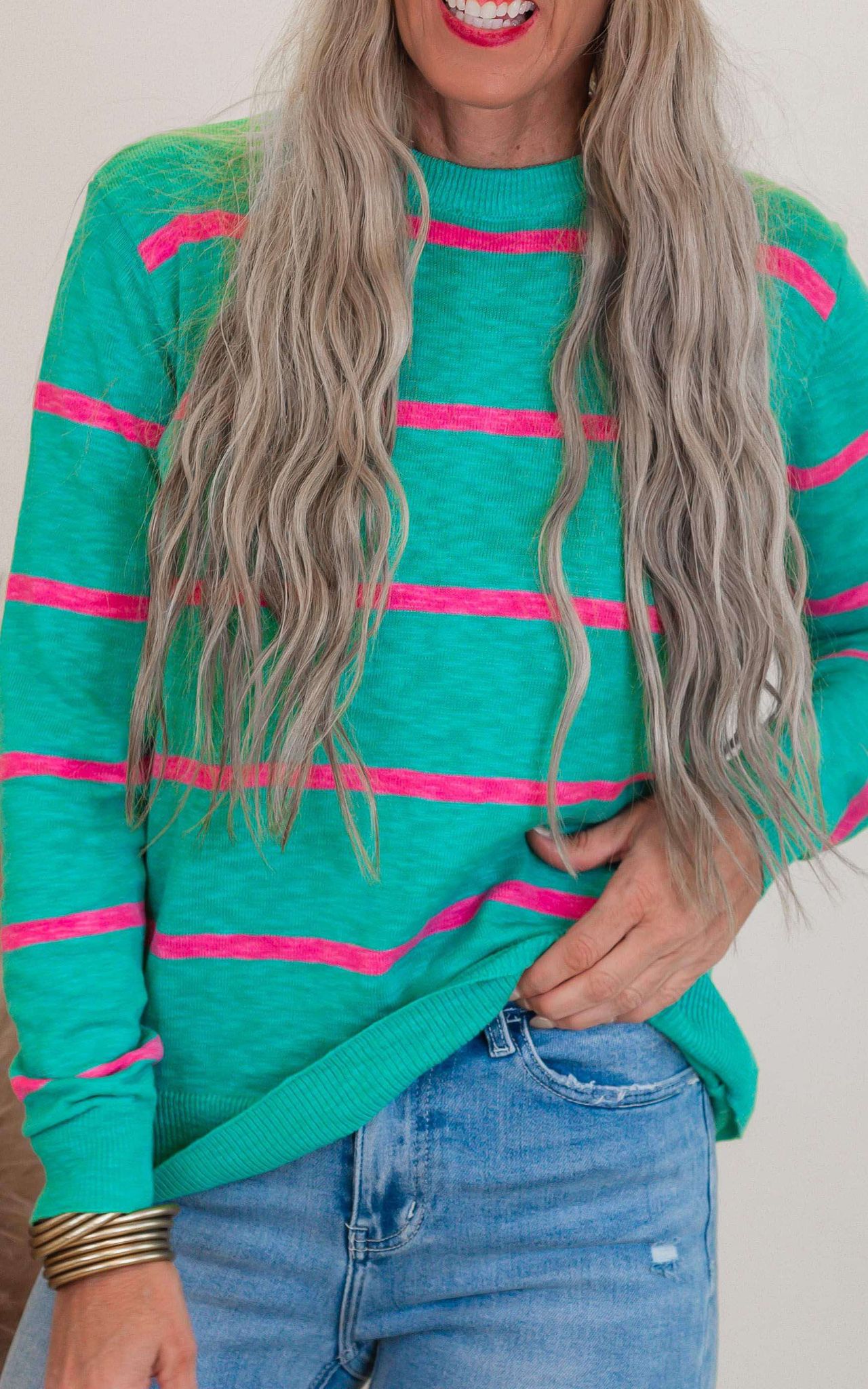 Fall in love with the vibrant colors and soft material of our Emerald Punch Striped Sweater. Perfect for cooler weather, this sweater will keep you warm while making a statement. Elevate your wardrobe with this must-have piece!