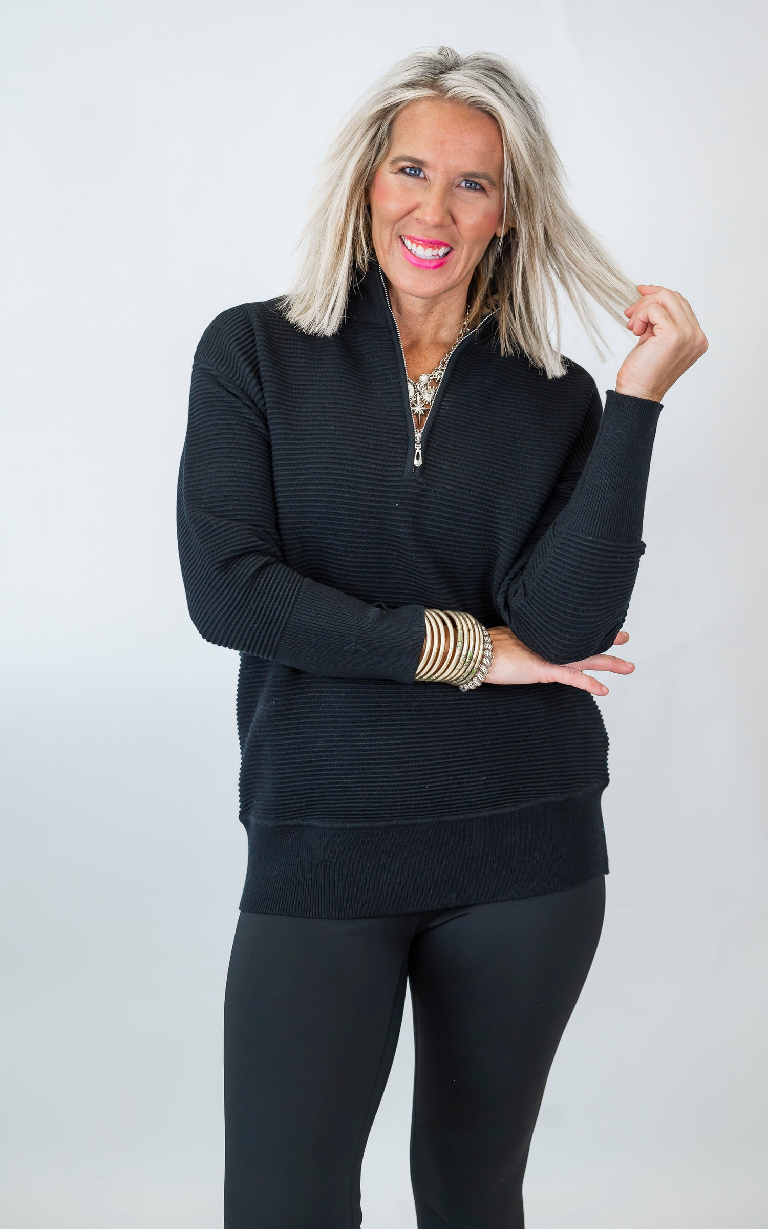 You're going to love living in this pullover! Our On Repeat Black Half-Zip Pullover by Salty Wave is the perfect top for those days when you want to be both stylish and cozy. This pullover has a chic ribbed texture and a half-zip neckline with a high collar, giving it a modern, elevated look. The classic black color makes it super versatile—you can throw it on with anything from jeans to leggings and still look put-together. It’s an absolute essential for your closet!