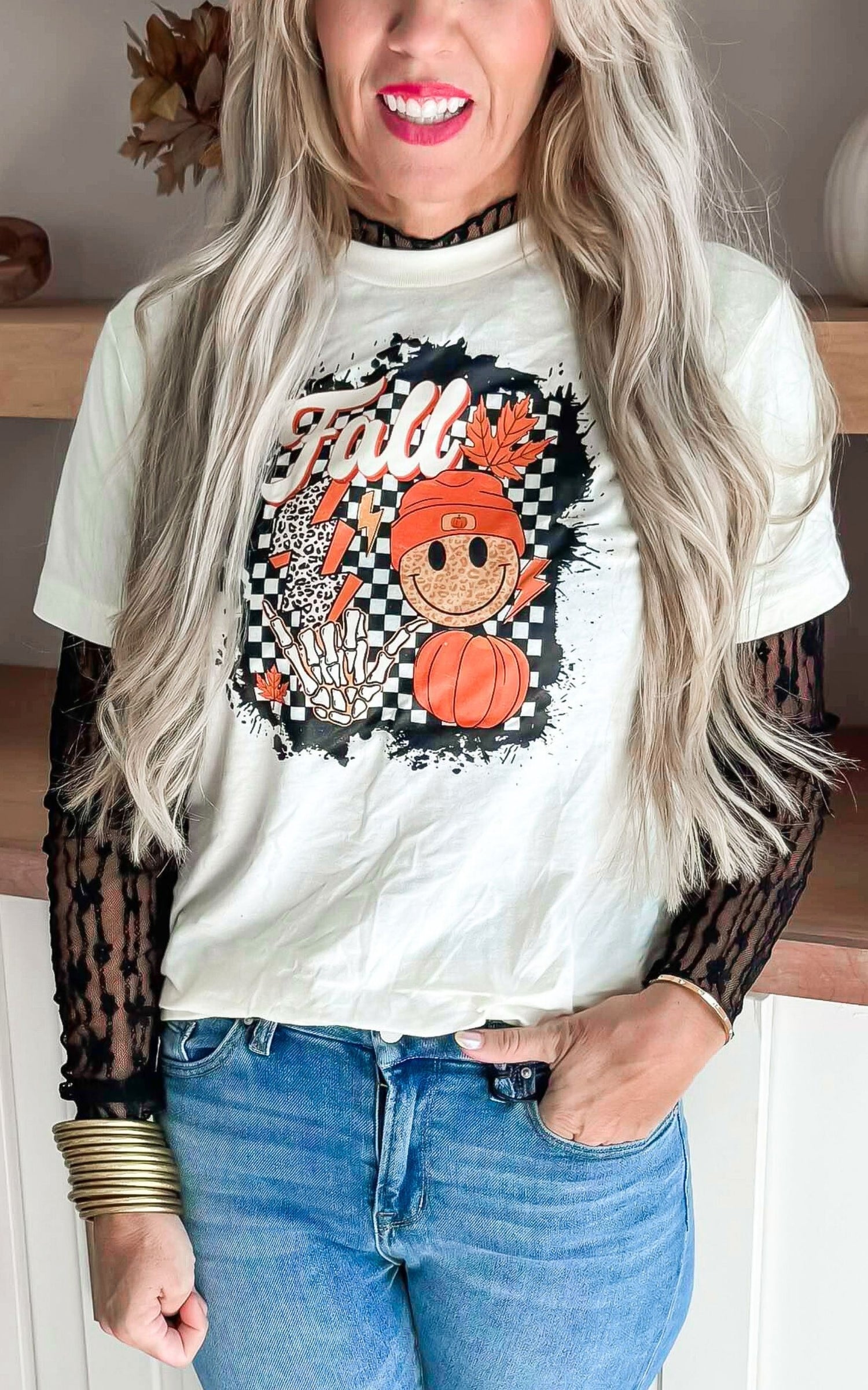 Experience the joy of fall with our Fall Smiley Graphic T-shirt! Featuring a bold and cheerful smiley graphic, this shirt is perfect for adding some fun to your wardrobe. Made with soft and comfortable fabric, it's the perfect shirt to wear while enjoying the crisp autumn air. Get yours today and spread some seasonal smiles!
