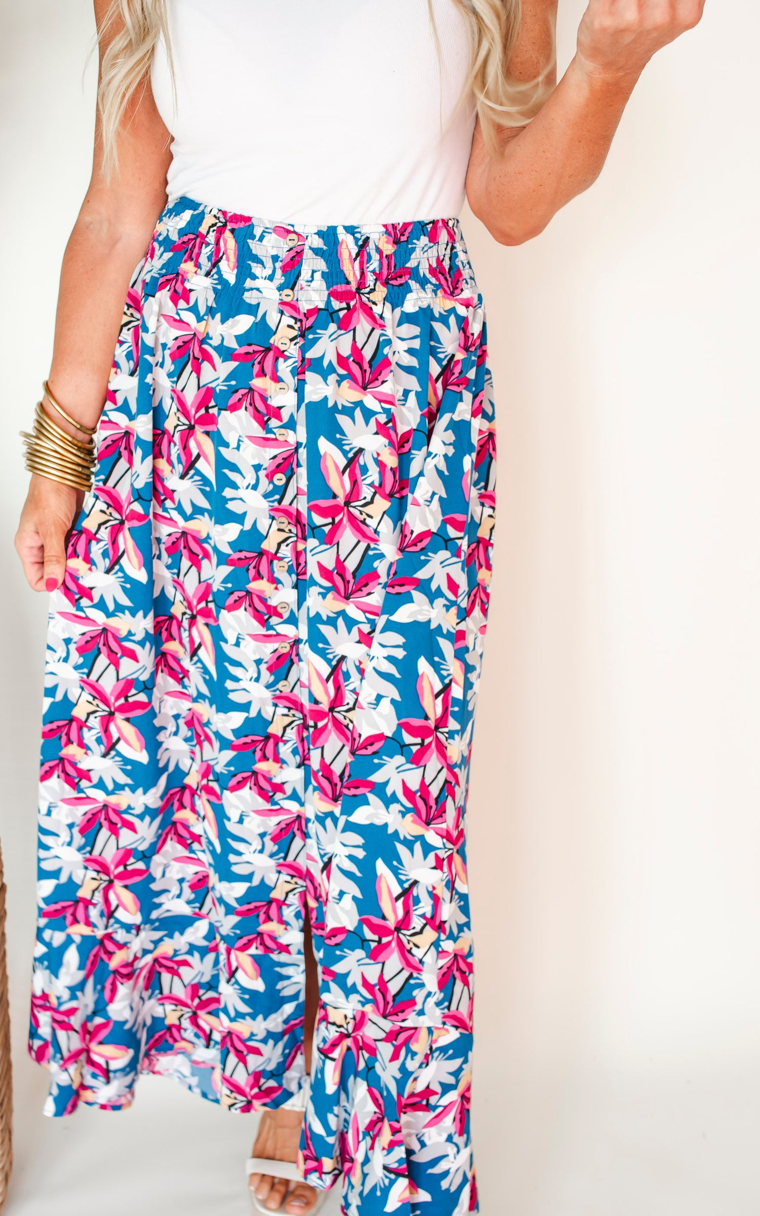 Effortlessly exude a playful aura with our Floral Printed Maxi Skirt. The vibrant floral print adds a charming touch, while the maxi length provides flowy comfort. Stand out in style with this quirky must-have piece!