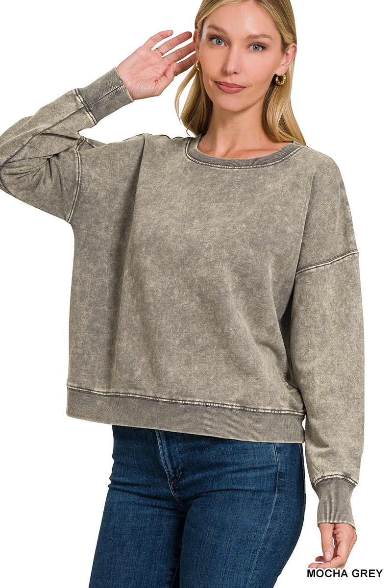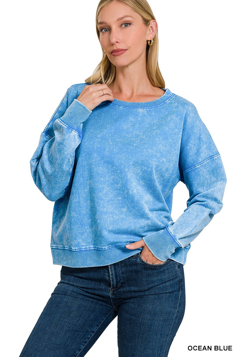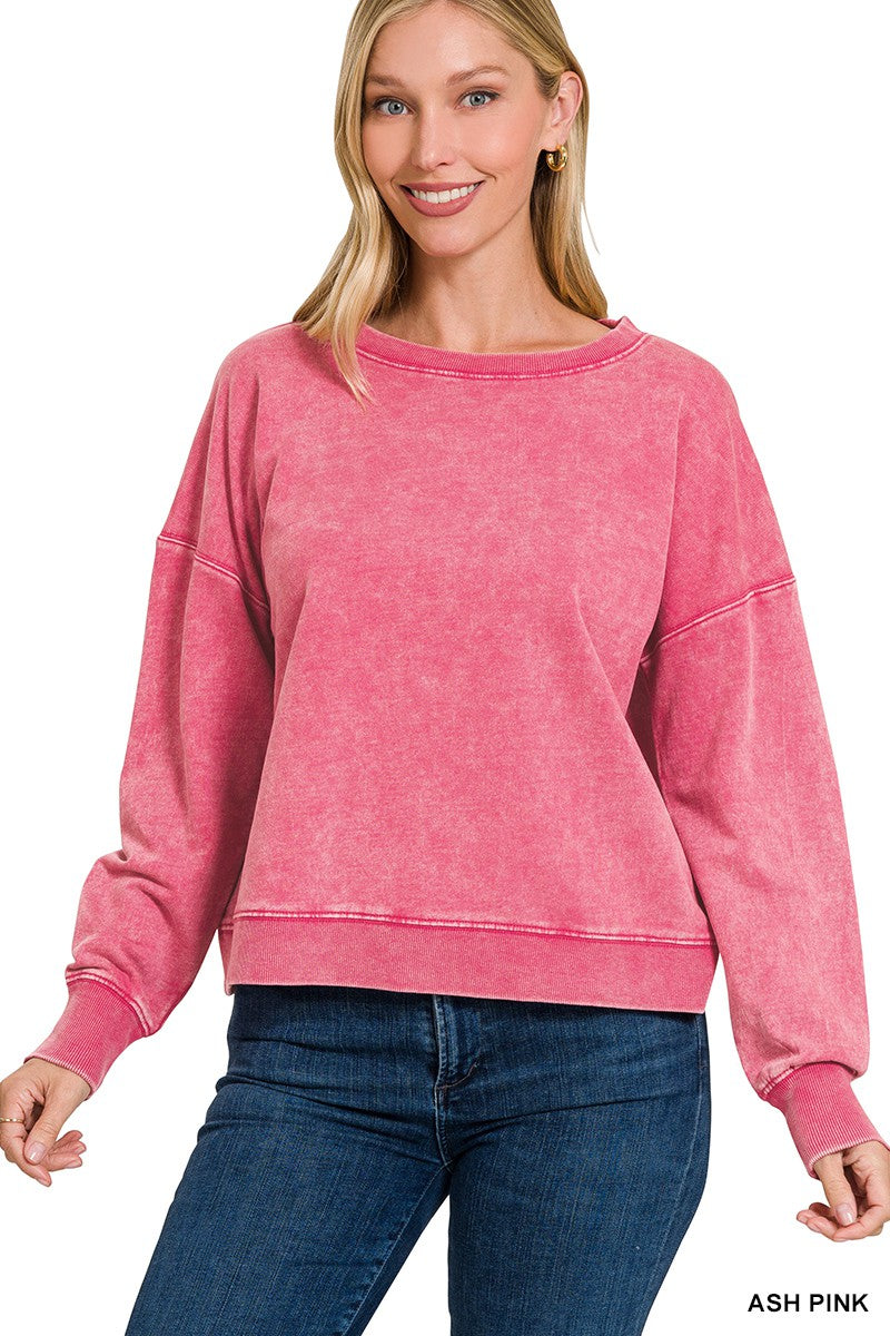 This comfy and non-fussy pullover looks like it leapt straight out of the 90s! Its acid wash French terry fabric and boat neck make it perfect for a chill day. Add a little retro style to your 'drobe!