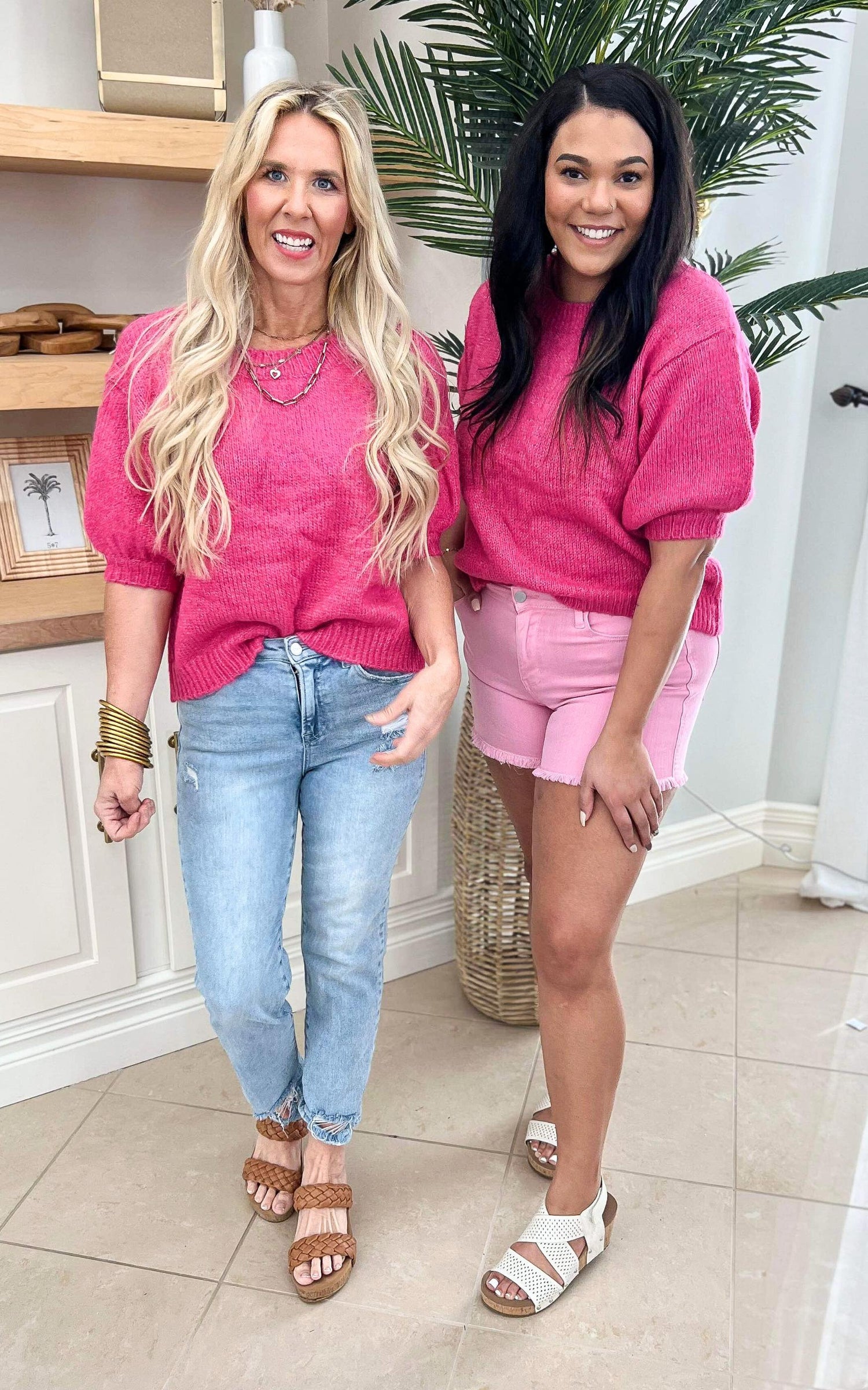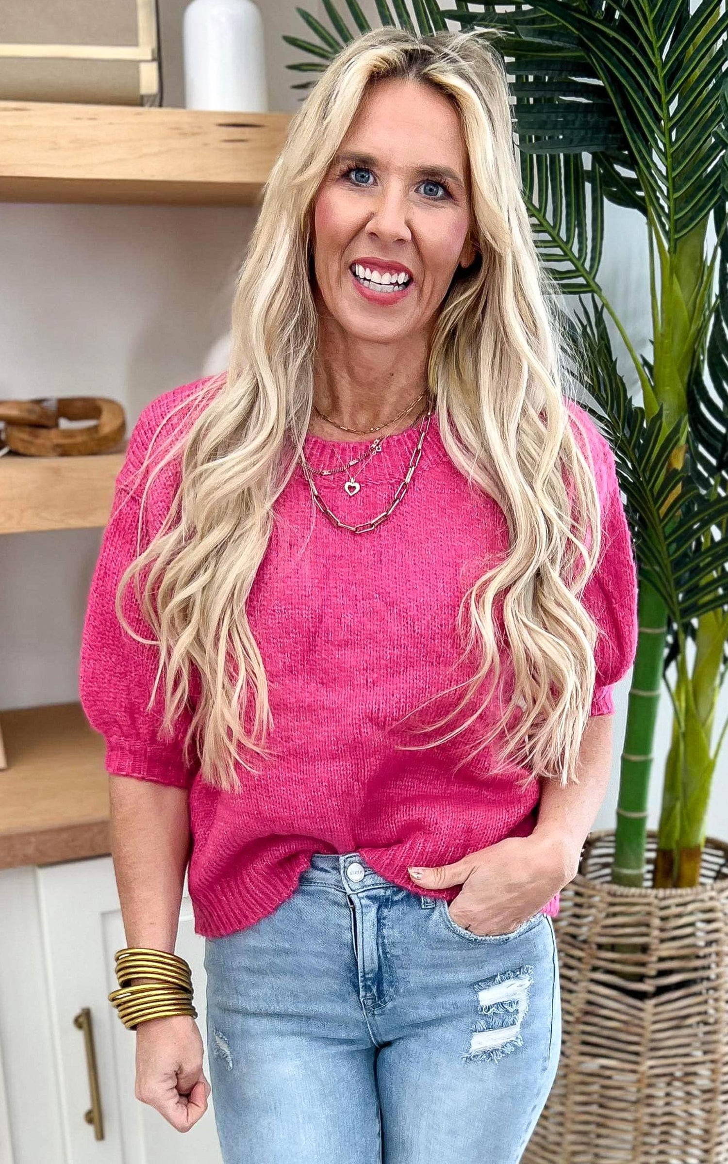 Fuchsia Short Sleeve Puff Sleeve Sweater Top -Final Sale