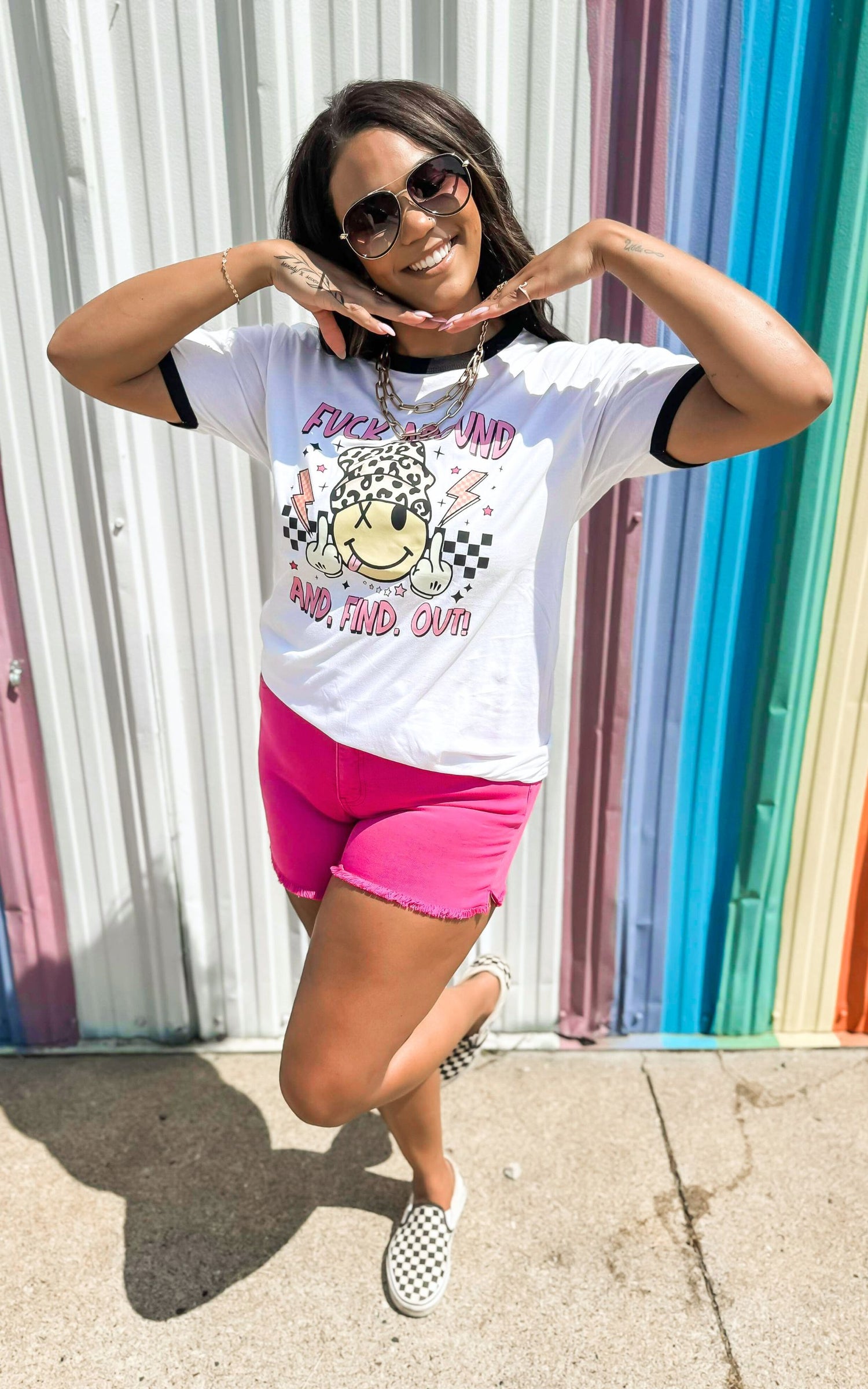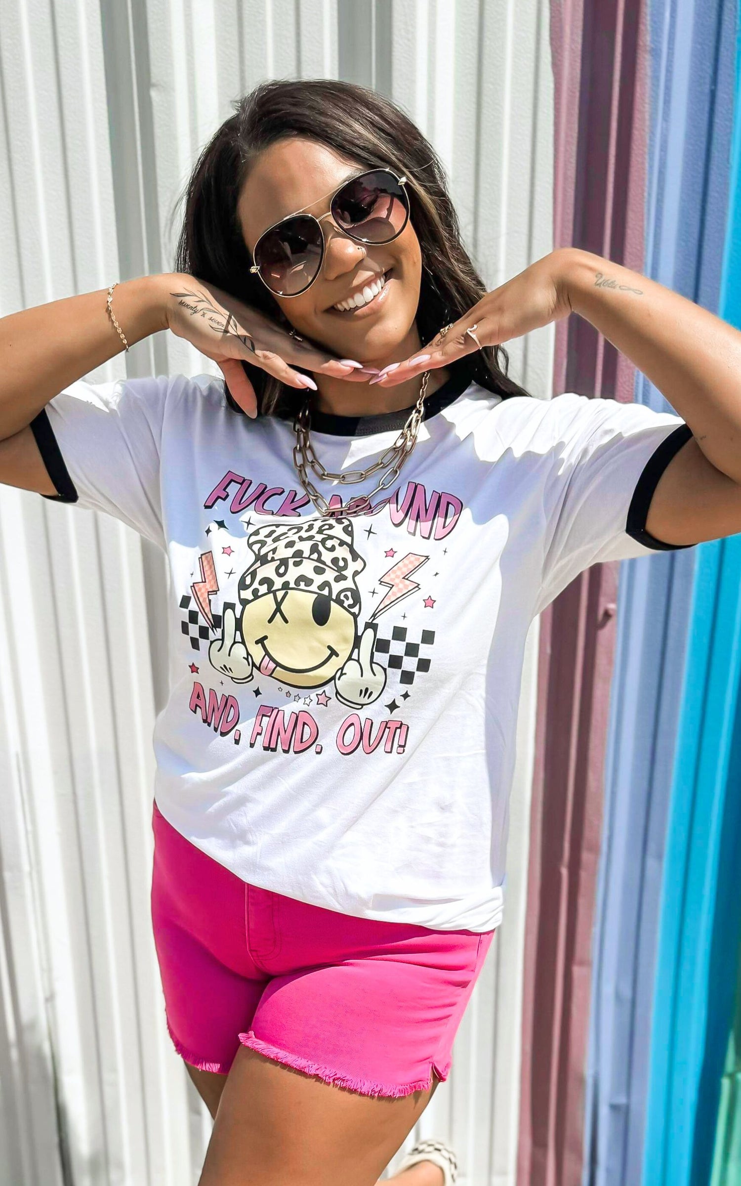 Introducing our new Fuck Around and Find Out Snarky Ringer Graphic T-shirt! This playful and quirky shirt is perfect for those who don't take themselves too seriously. Featuring a bold graphic print and a clever phrase, this tee is sure to make a statement and add some humor to your wardrobe. So why wait? Get one for yourself today and see what all the fuss is about!