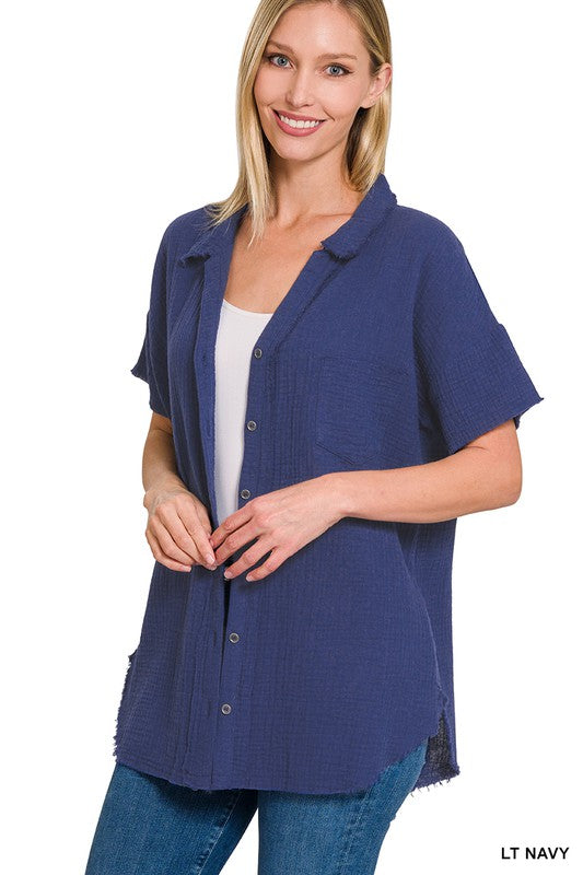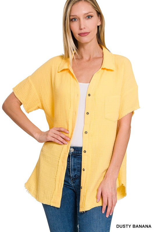 The Gauze Button Down Raw Edge Short Sleeve Shirt is the perfect go-to shirt that's both fashionable and versatile. Button closure at front, short sleeves, classic button down collar, raw edge hem. Made from lightweight fabric that is soft to the touch and comfortable