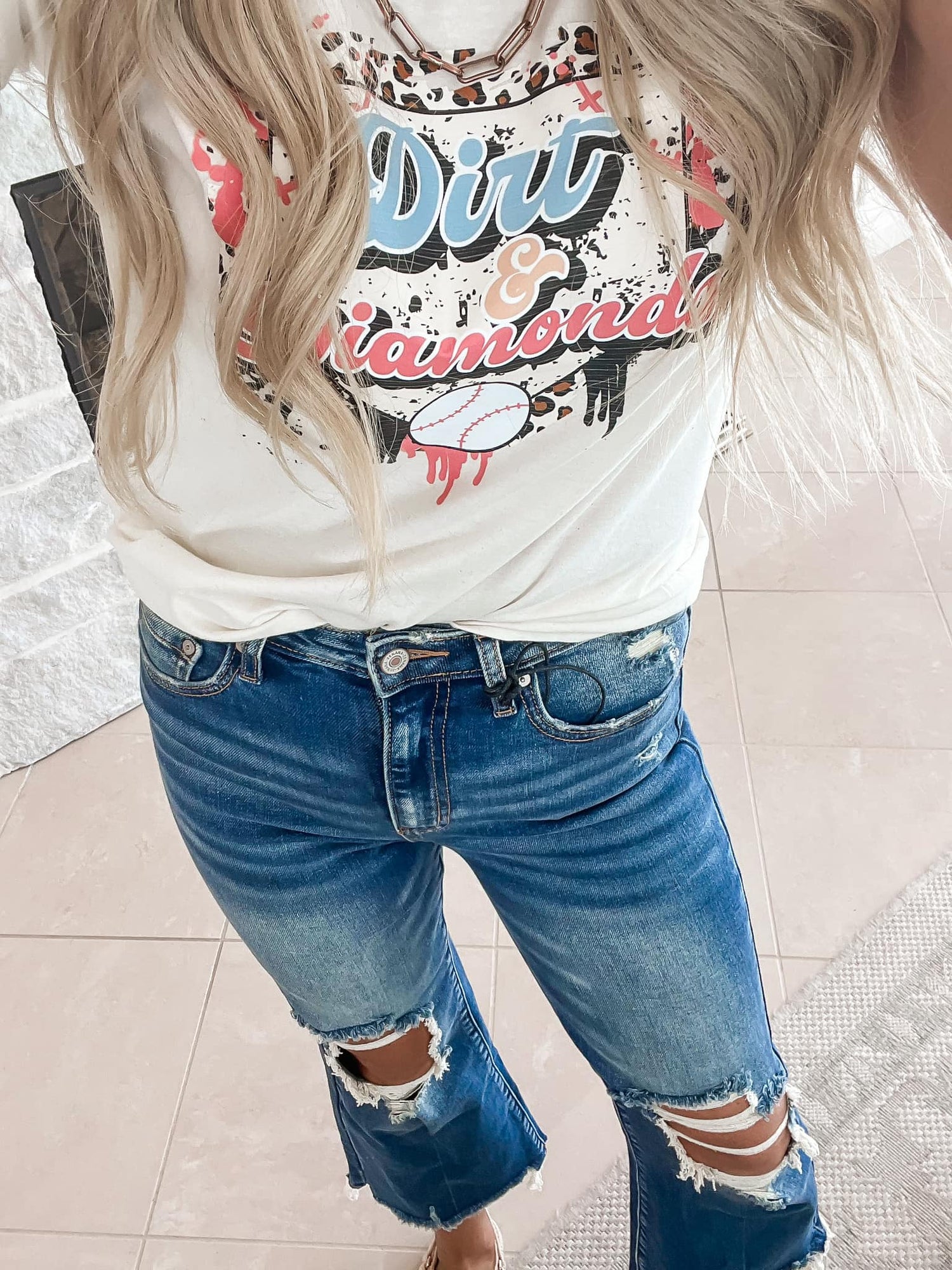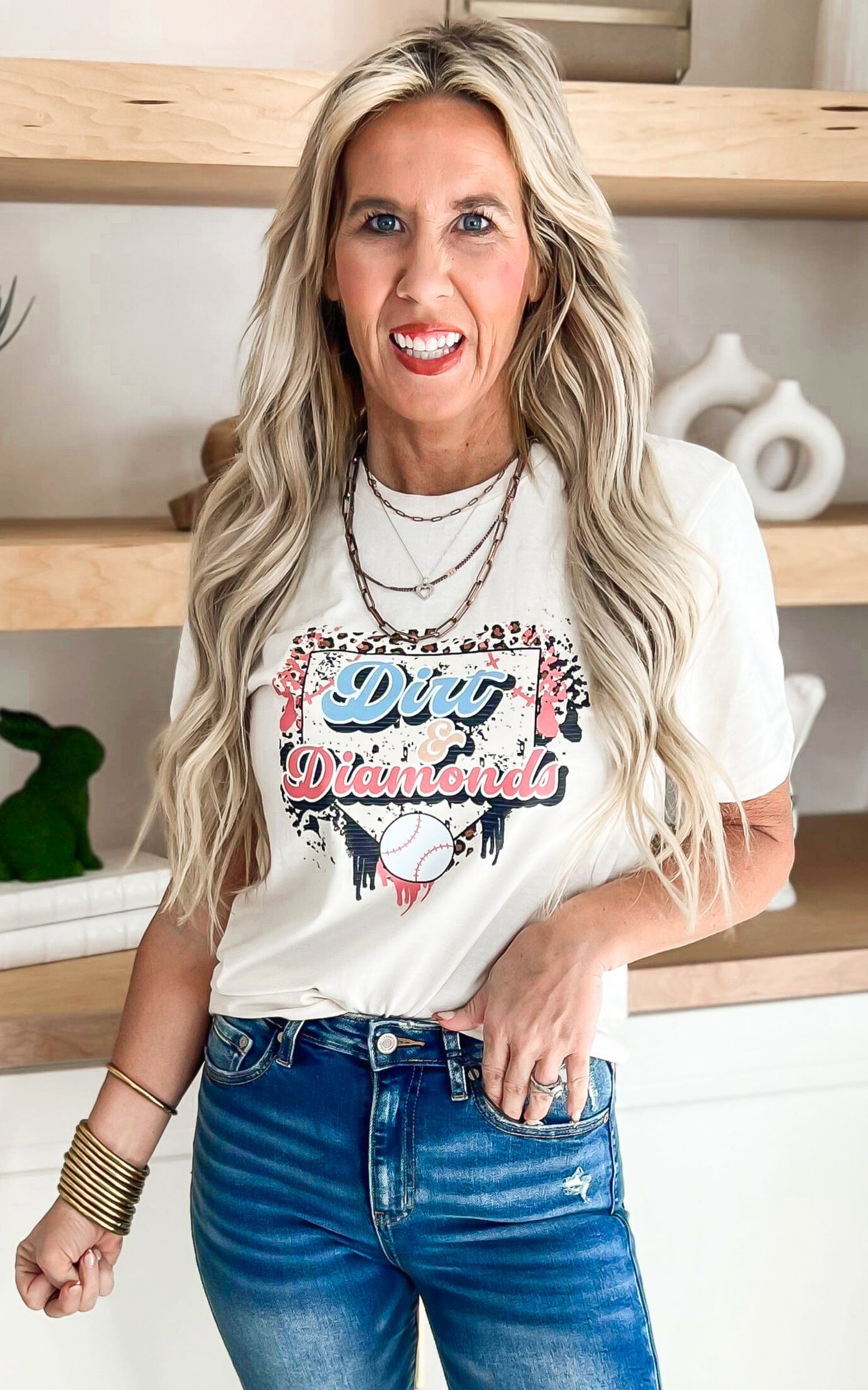 Sparkle on and off the field with our Dirt and Diamonds Graphic T-shirt. Perfect for baseball moms who love to shine and support their players. Show off your love for the game with this quirky and fun shirt. Score a home run in style with this must-have addition to your wardrobe.