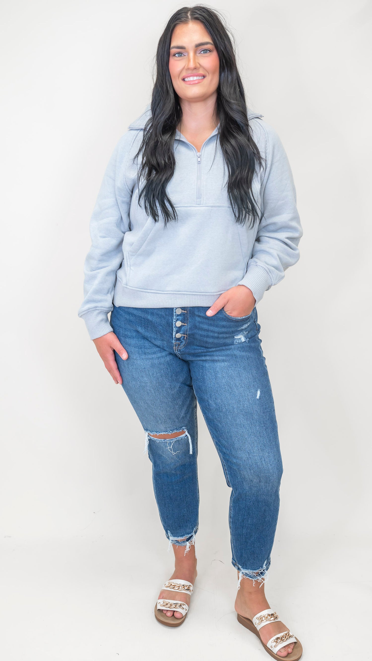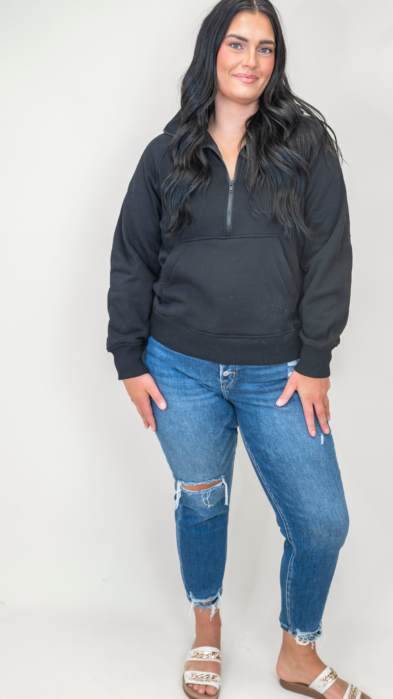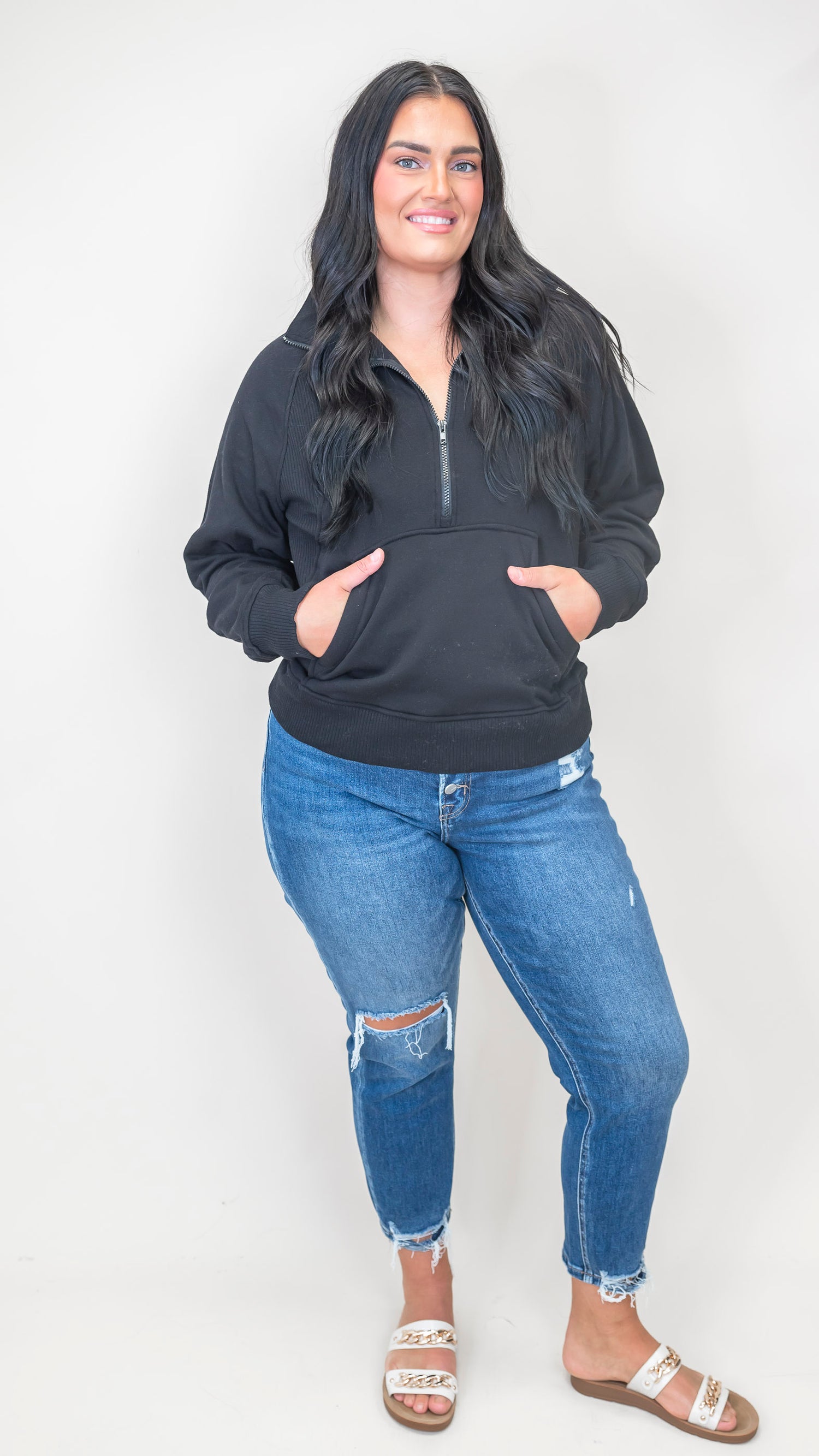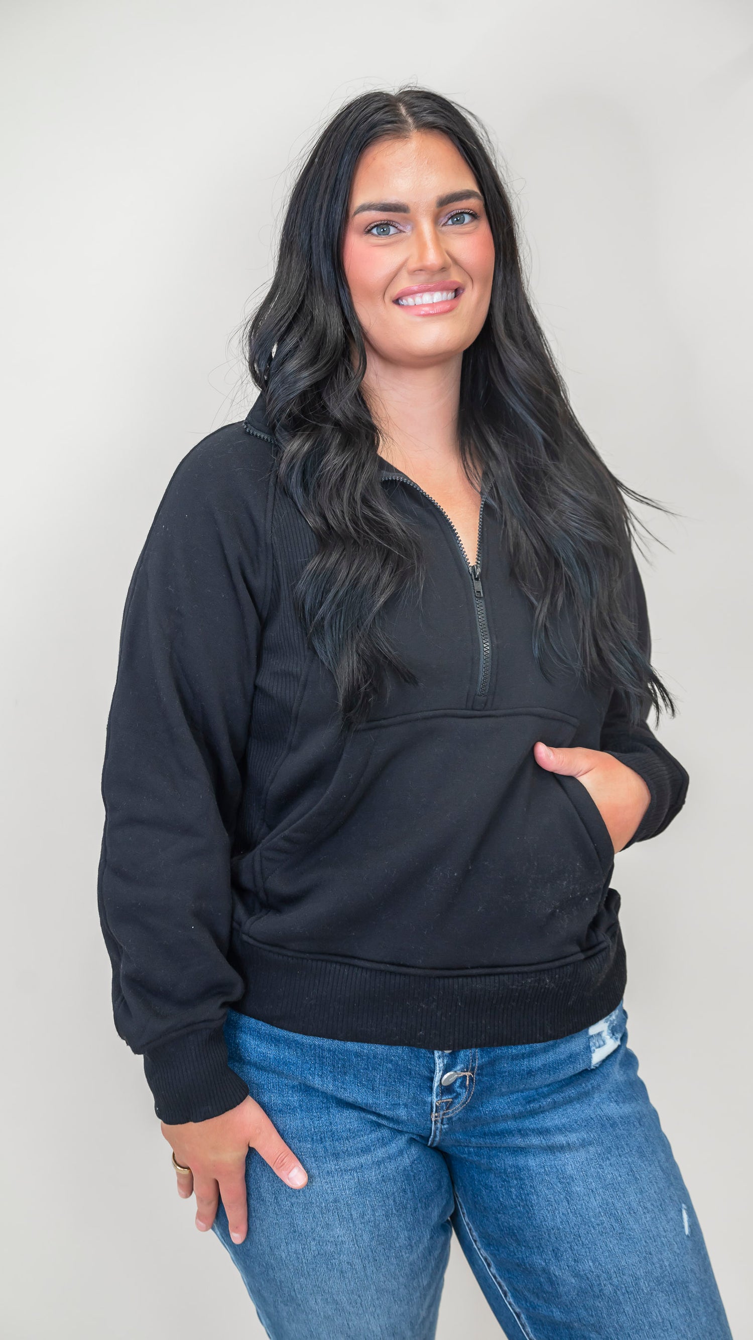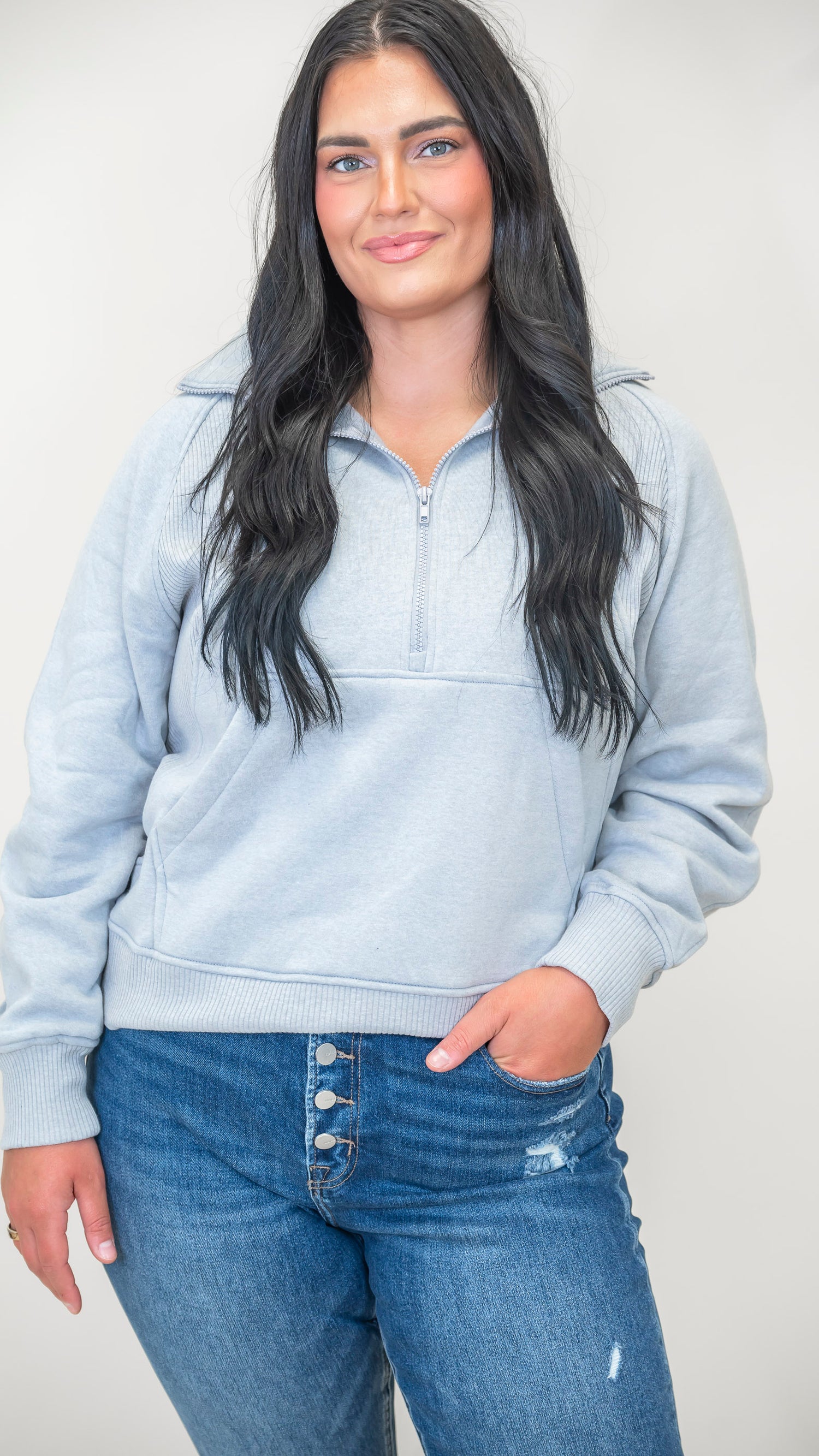 Stay cozy and cool in this Half Zip Fleece Pullover from Zenana! Featuring a roomy kangaroo pocket perfect for stashing snacks or warming your hands, this pullover is your new go-to for chilly days. The half-zip lets you dial up the comfort and style, making it easy to layer or wear solo.