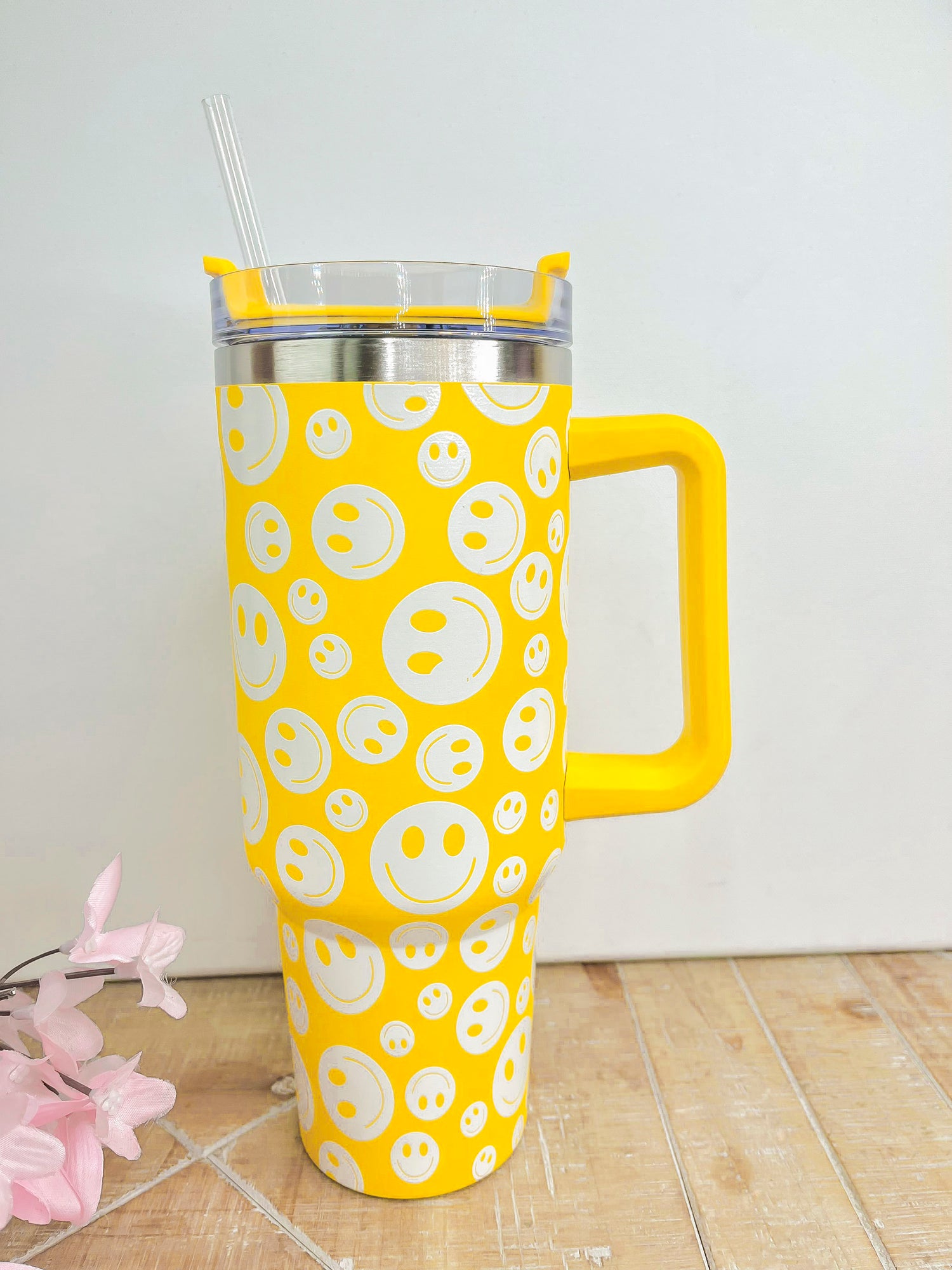 Stay hydrated and in a good mood with our Happy Face 40oz Tumbler! This tumbler not only holds a large amount of liquid, but its fun design will always bring a smile to your face. Perfect for staying refreshed on the go and spreading positivity.