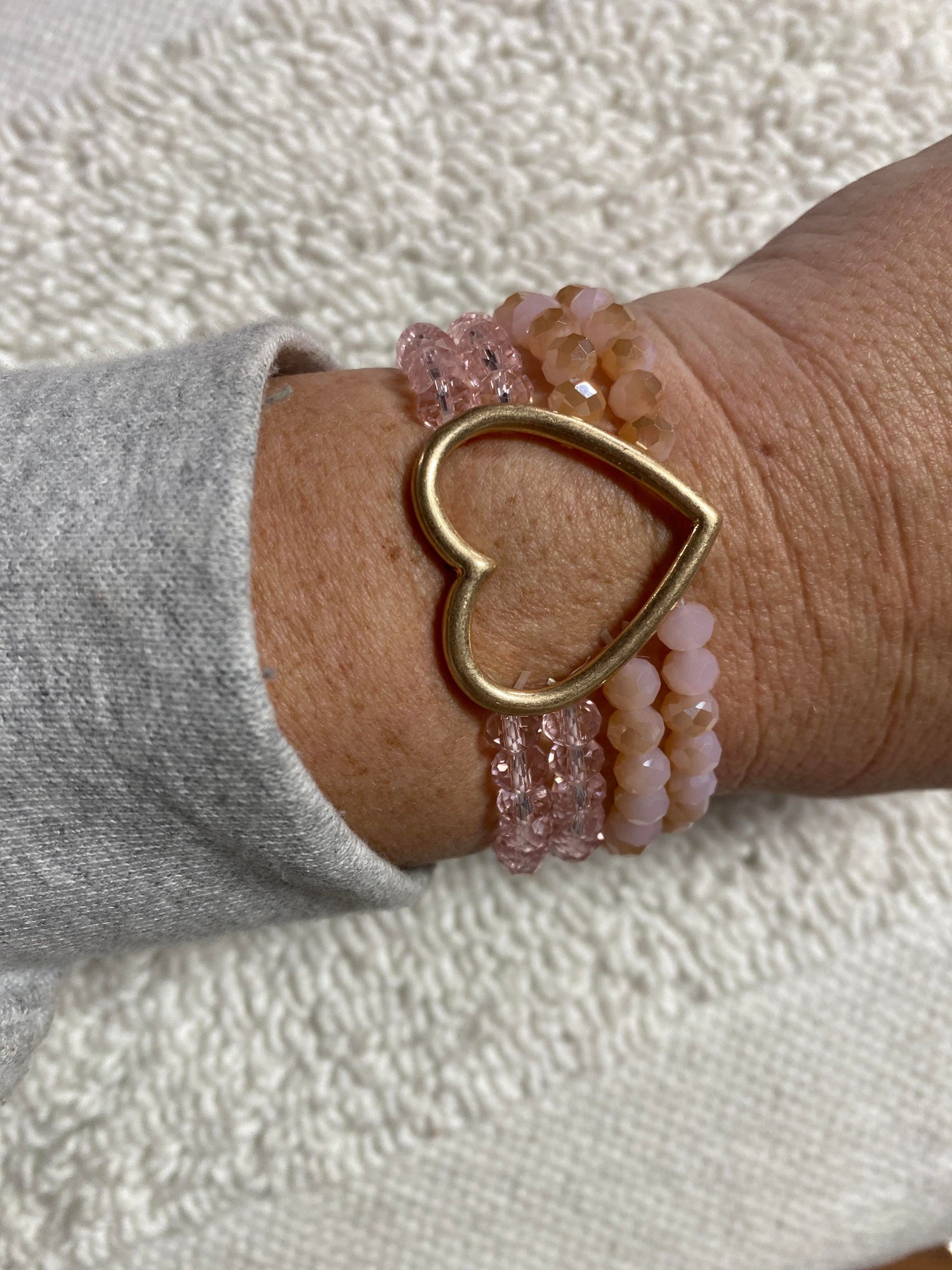 This multi bead stretchy bracelet features that stacked style with that darling heart charm!