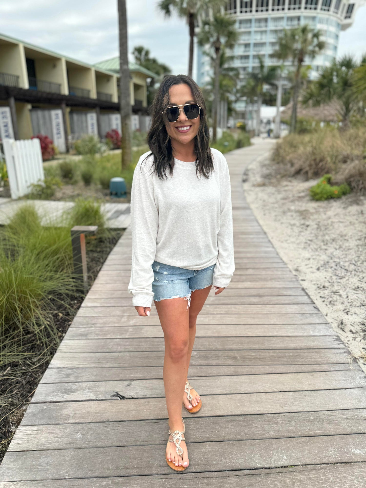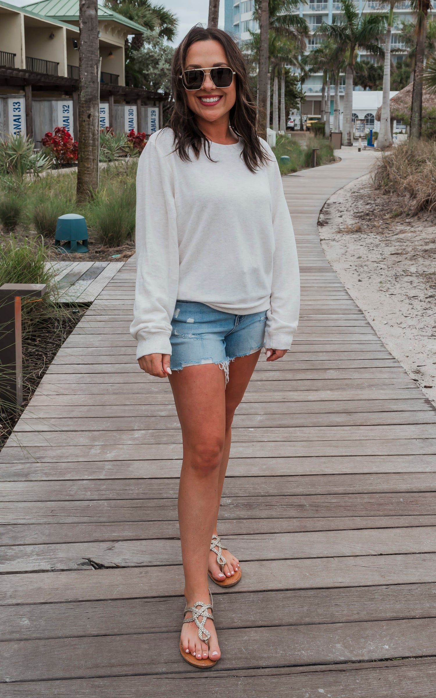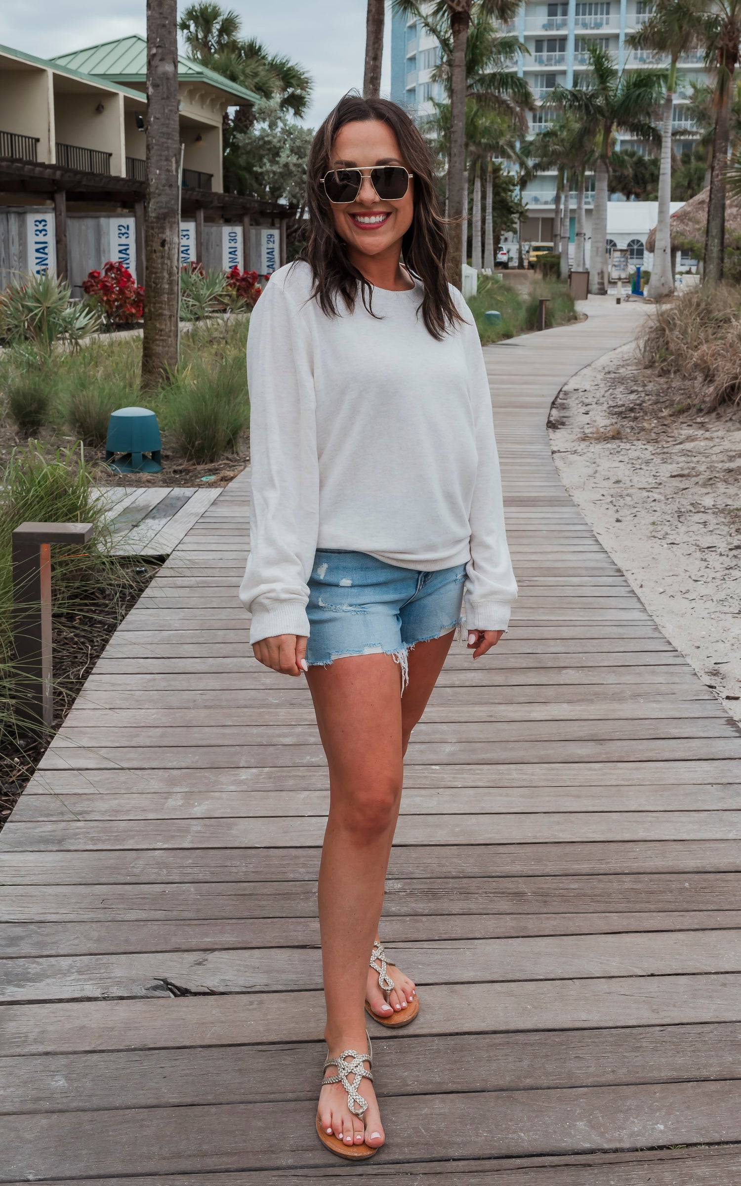 - Sara (blonde hair) is 5'7" and she wears a Small in tops and bottoms. She is a TTS size 3/26 in Denin