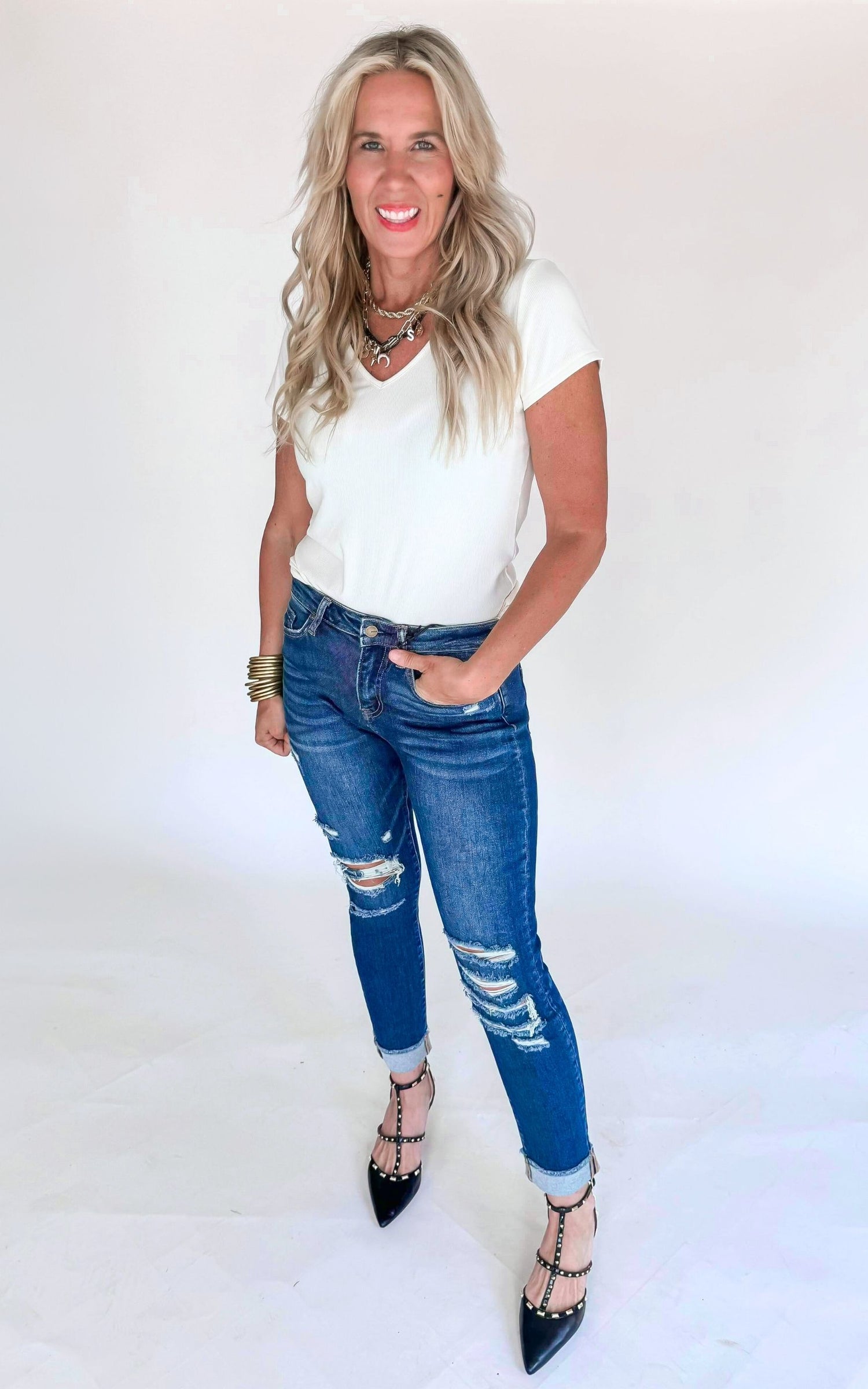 What’s better than a boyfriend jean? A denim crop that features a high rise and a cuff. You can pair this with so many different tops and accessories to create the perfect look.