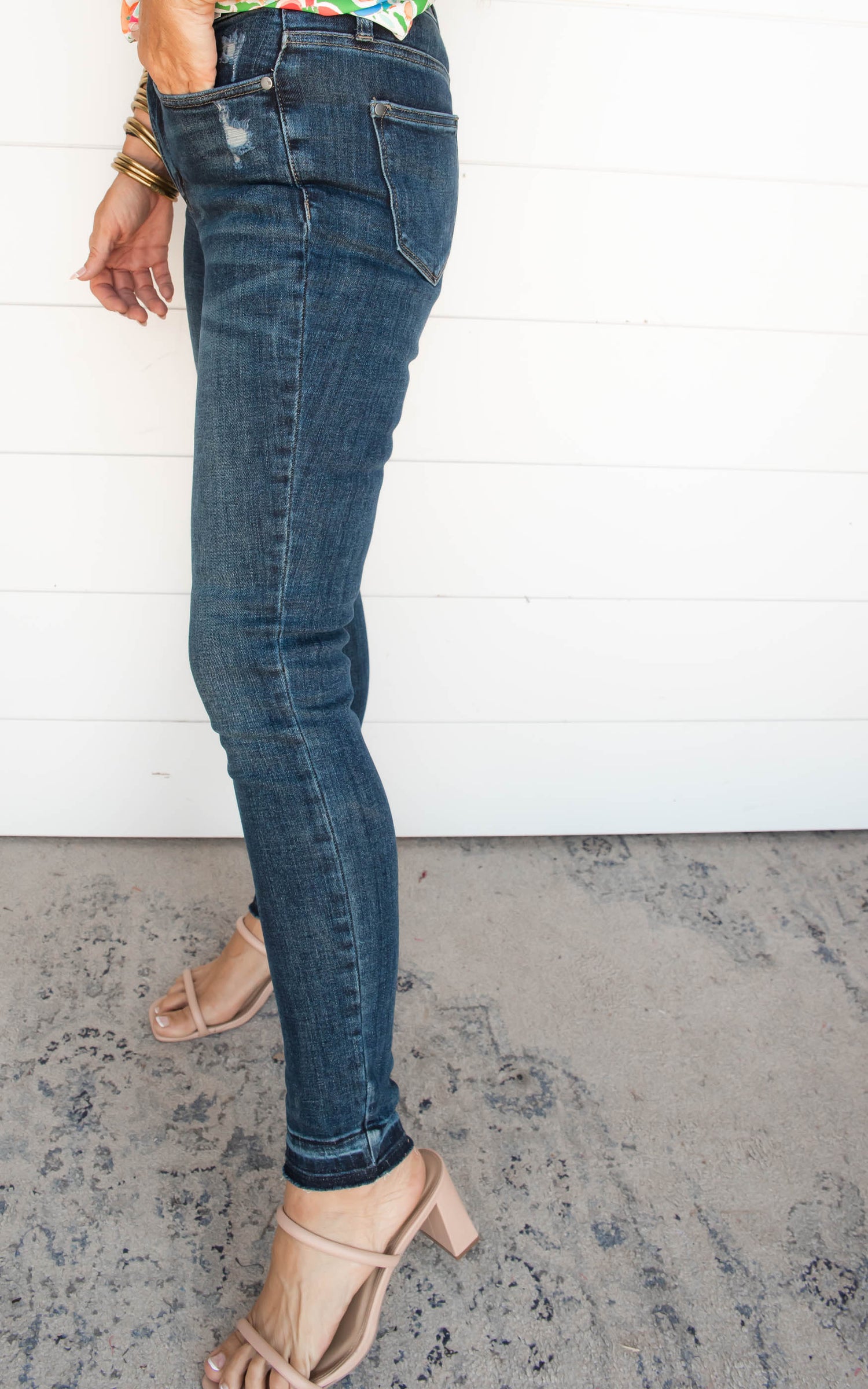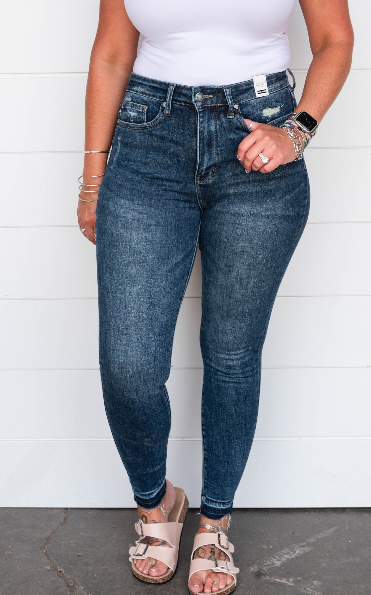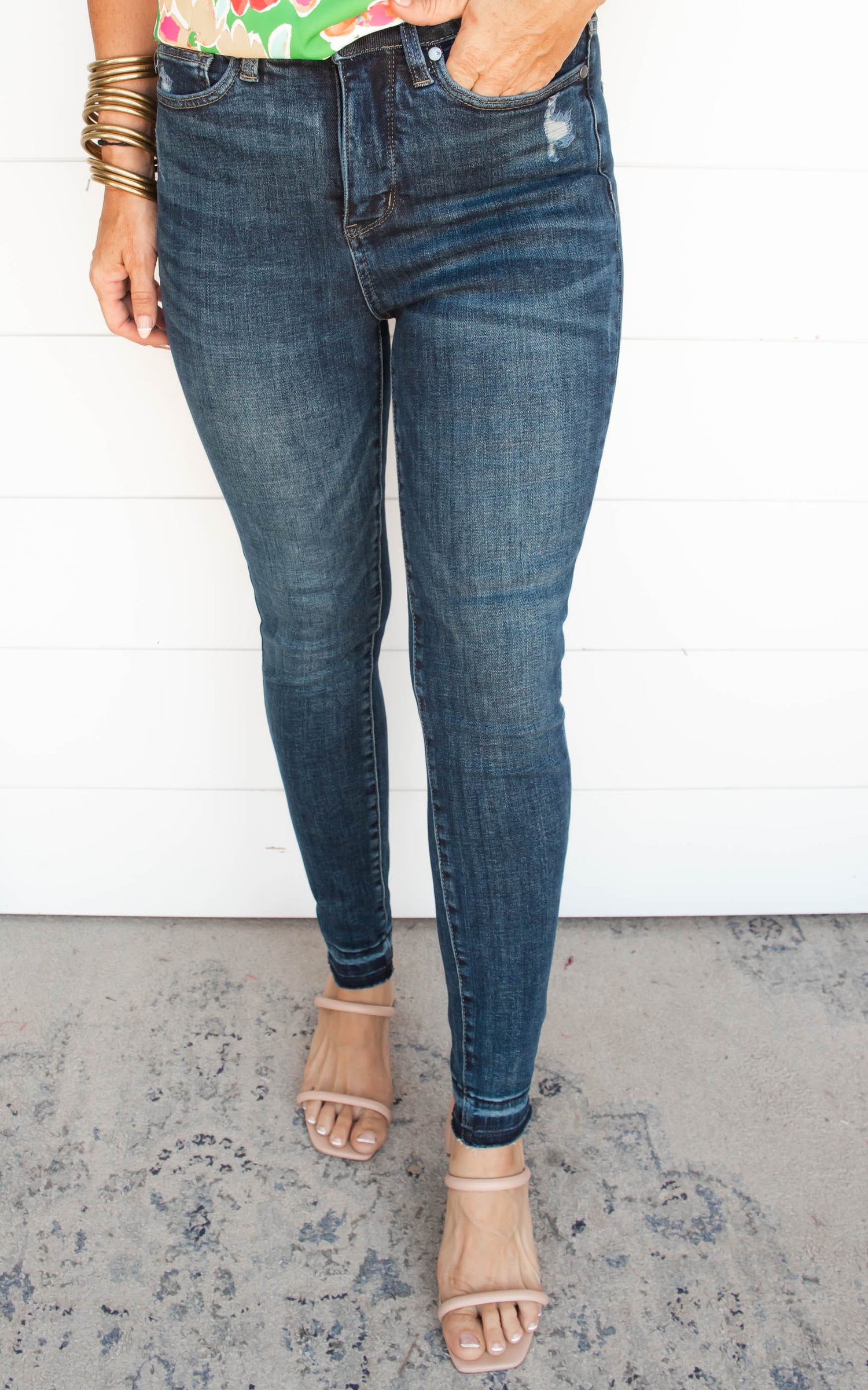 These dark wash High Rise Judy Blue Skinny Jeans have that Tummy control feature. Loving the minimal distressing on these skinny denim jeans and that cuff hem at the ankles.