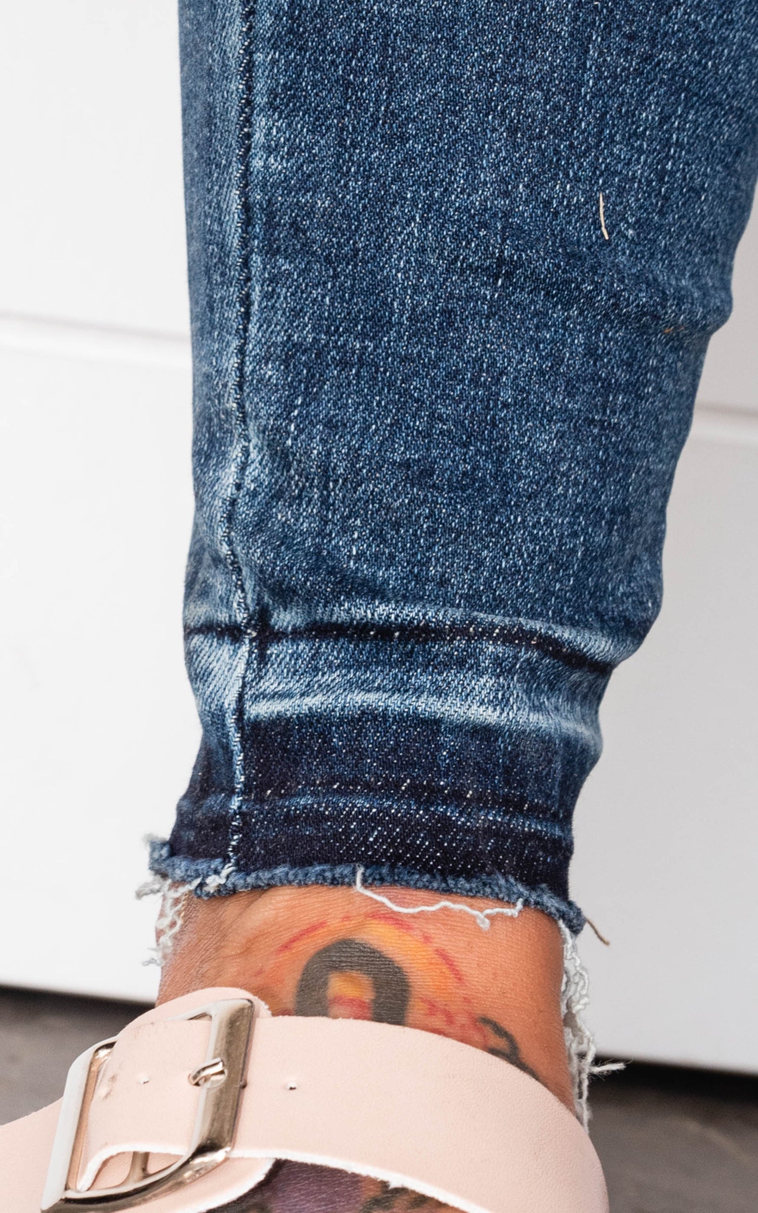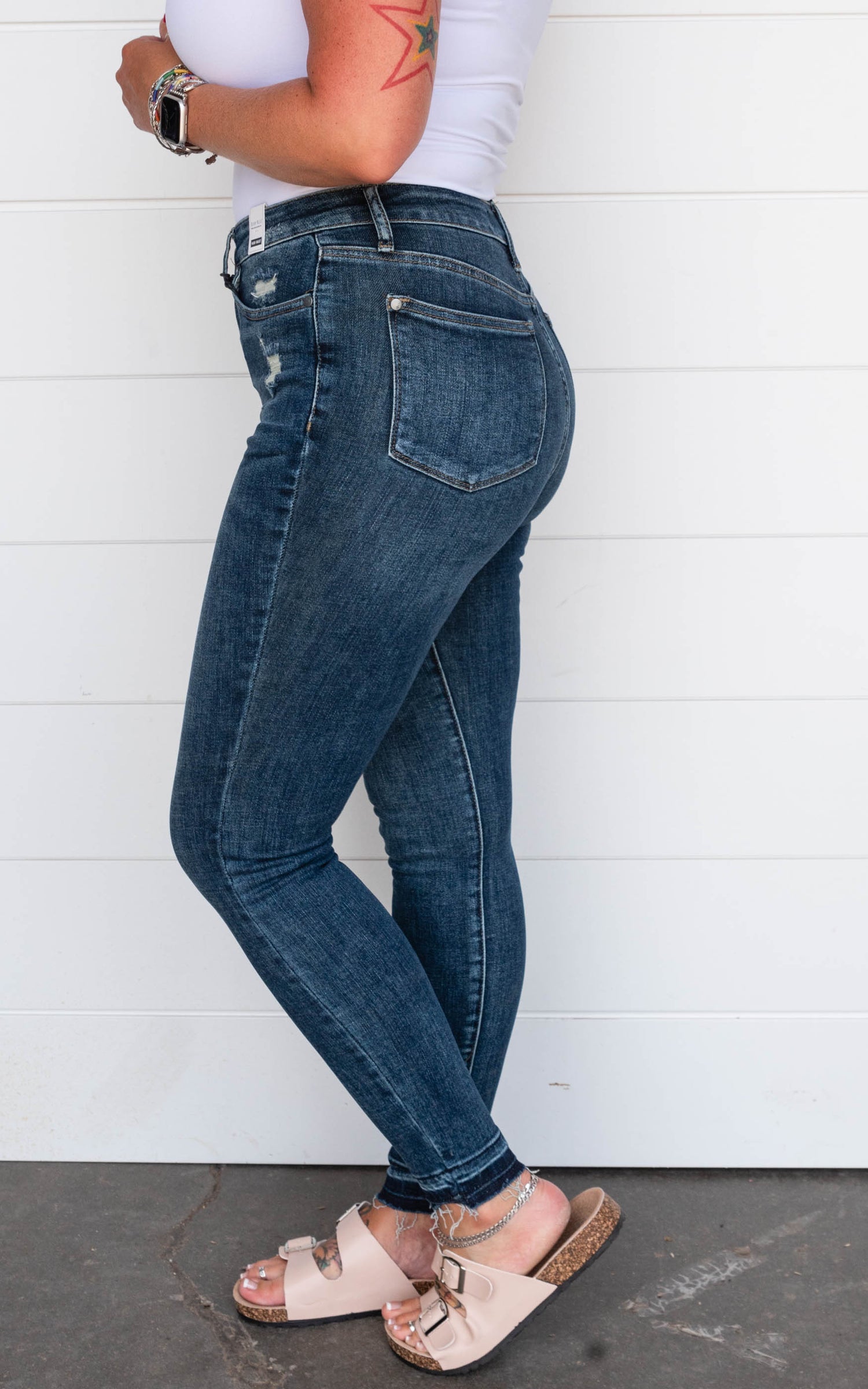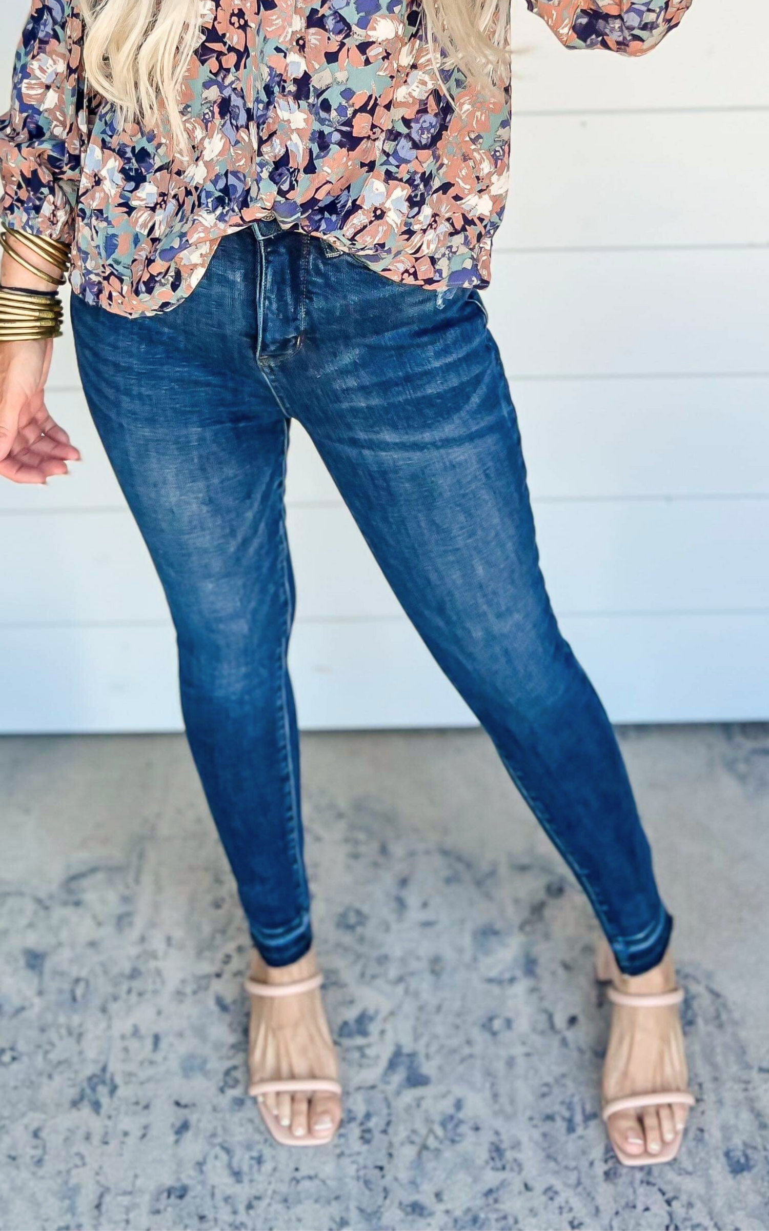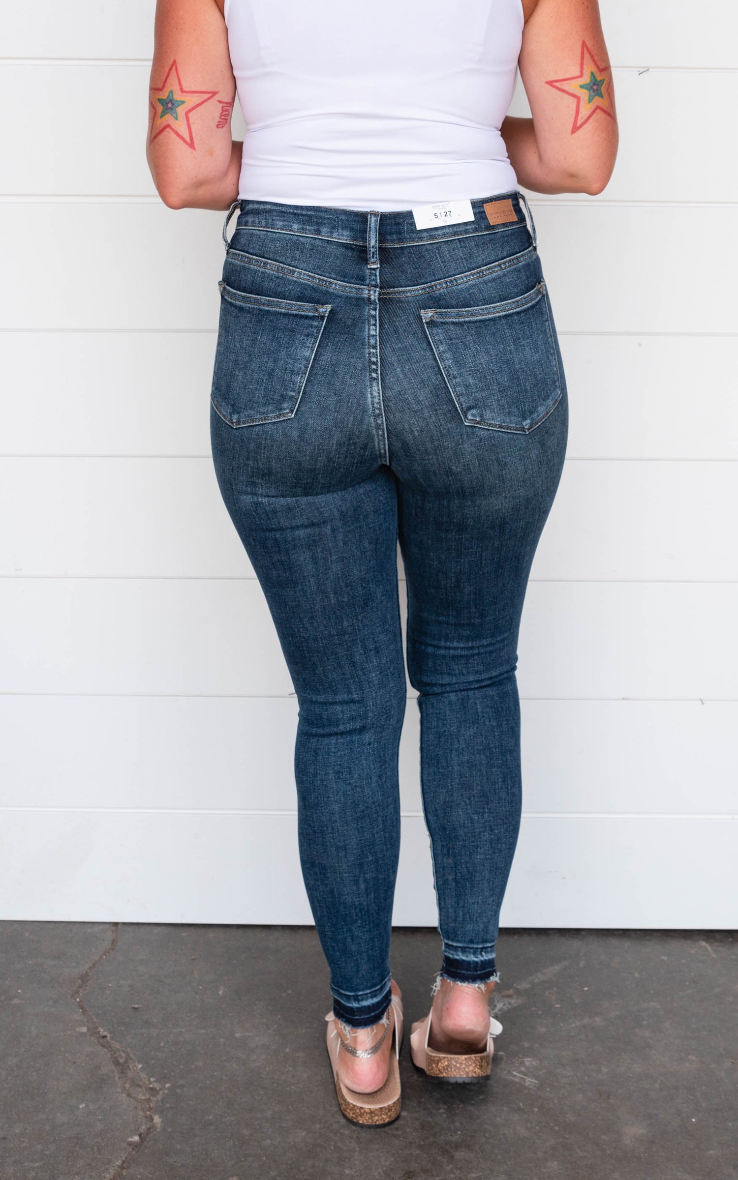 These dark wash High Rise Judy Blue Skinny Jeans have that Tummy control feature. Loving the minimal distressing on these skinny denim jeans and that cuff hem at the ankles.